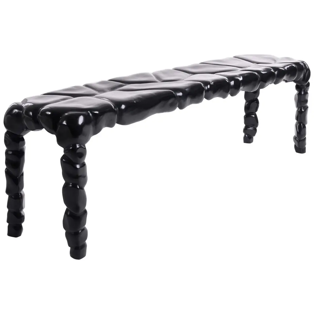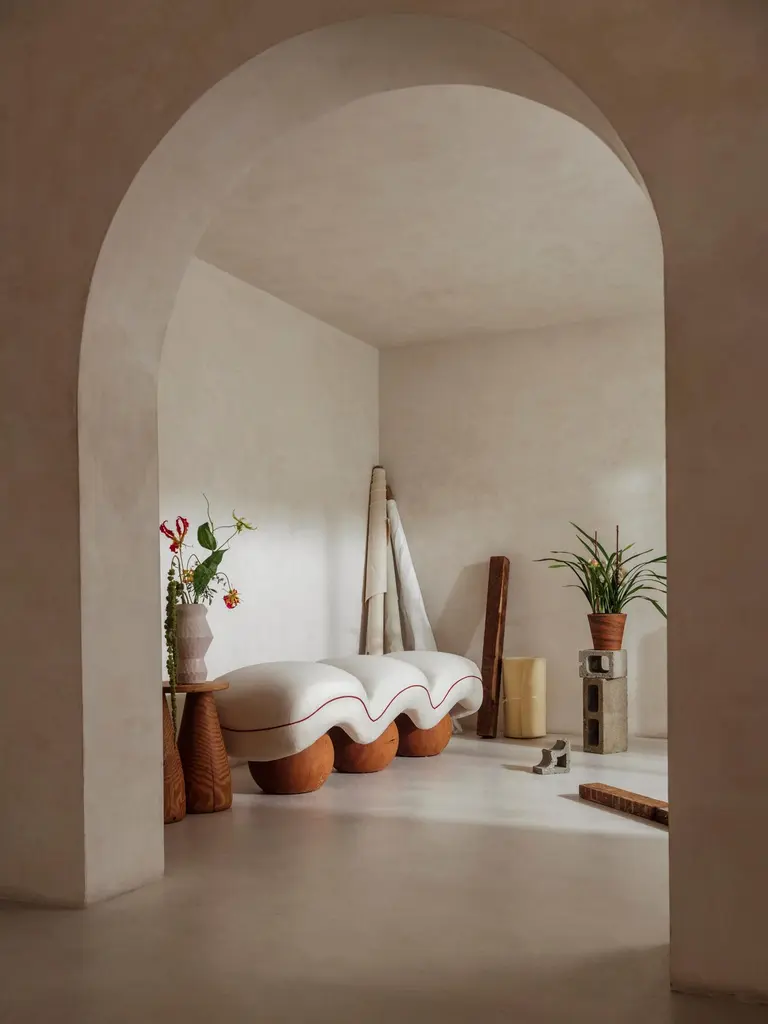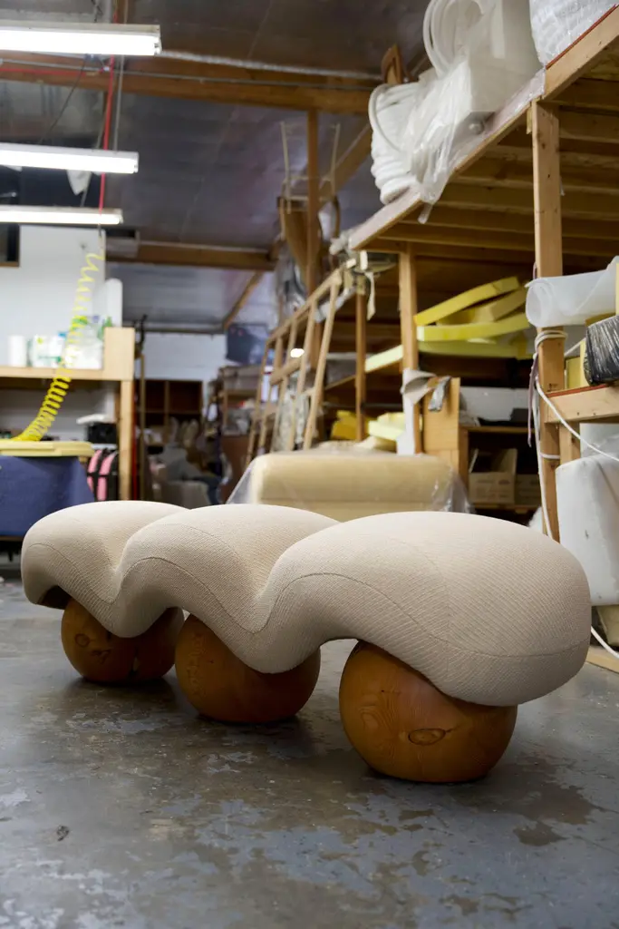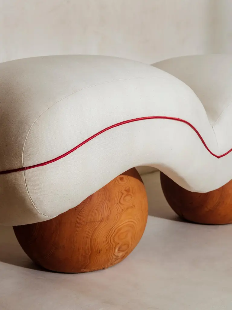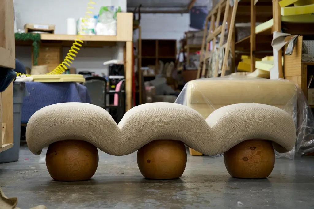 As part of Studio Sam Klemick's second collection The Wiggle Bench debuted in 2022. This hand built wooden bench is made in Los Angeles California. The seat is upholstered with overstuffed canvas that provides a very comfortable sit. Reclaimed Douglas Fir Wood that comes from old building beams are turned on the lathe and become the three large balls that serve as the feet of the bench. The upholstery sits on top of the balls creating a wavy shape that is almost futon like. COM orders upon request.