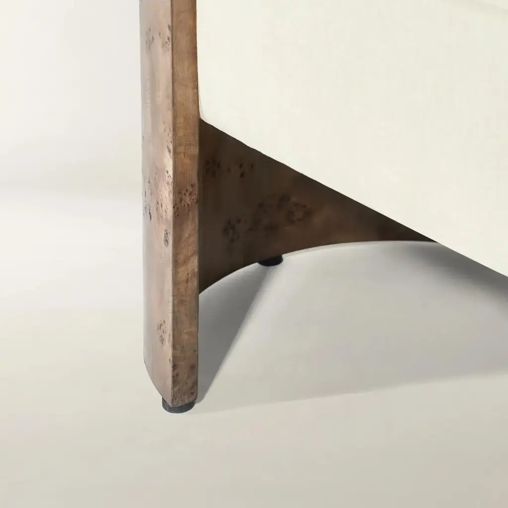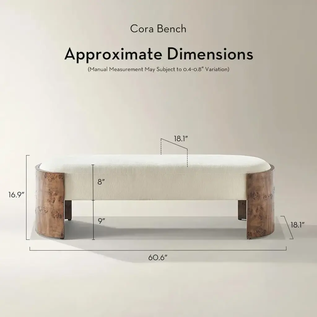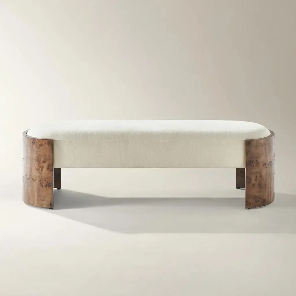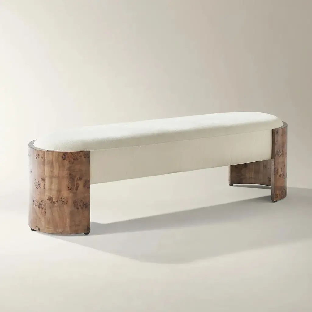 The Cora Bench in ivory creates a serene design moment with its soft tone and bold form. Upholstered in plush ivory chenille, the seat is cradled by curved end panels finished in ash burl veneer, where each swirling grain tells a unique story of natural artistry. The contrast between the creamy upholstery and the rich wood grain adds depth and visual intrigue. Its oval silhouette and book-matched burl detailing invite attention from every angle, making it as functional as it is sculptural. Reinforced with a kiln-dried hardwood frame, this ivory chenille bench is ideal at the foot of a bed or styled with stone and linen in the living room.ZG Exclusive