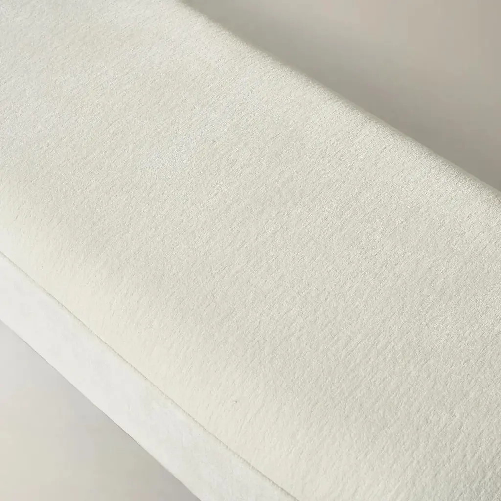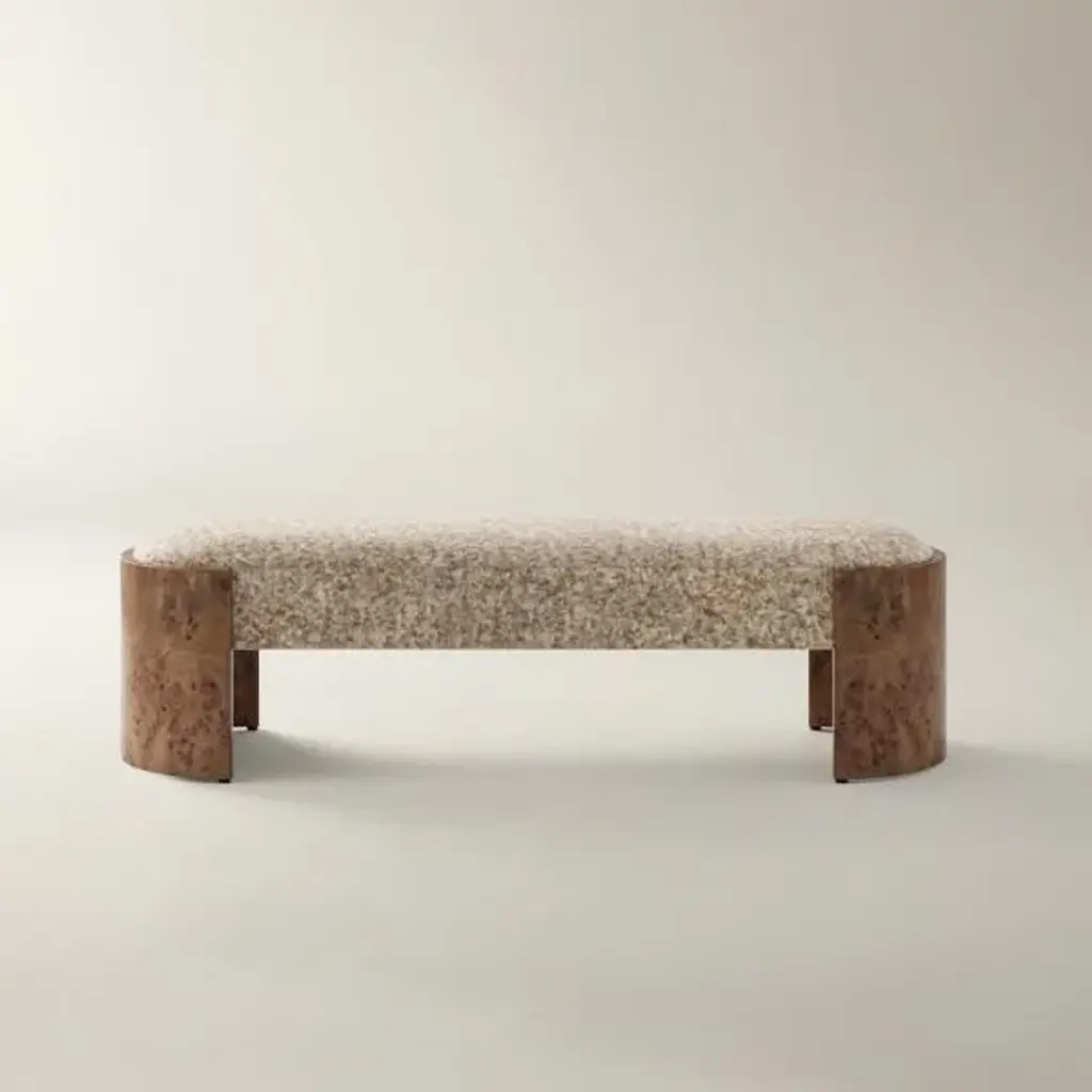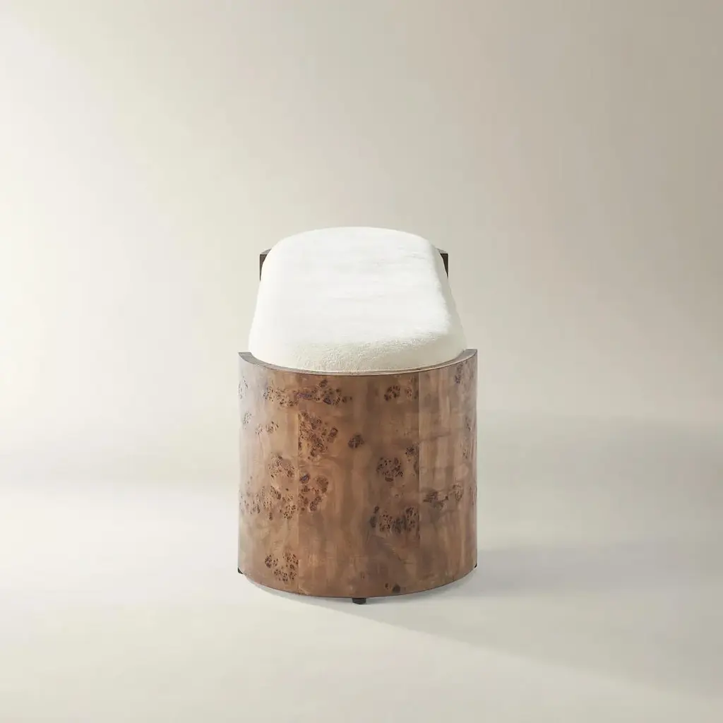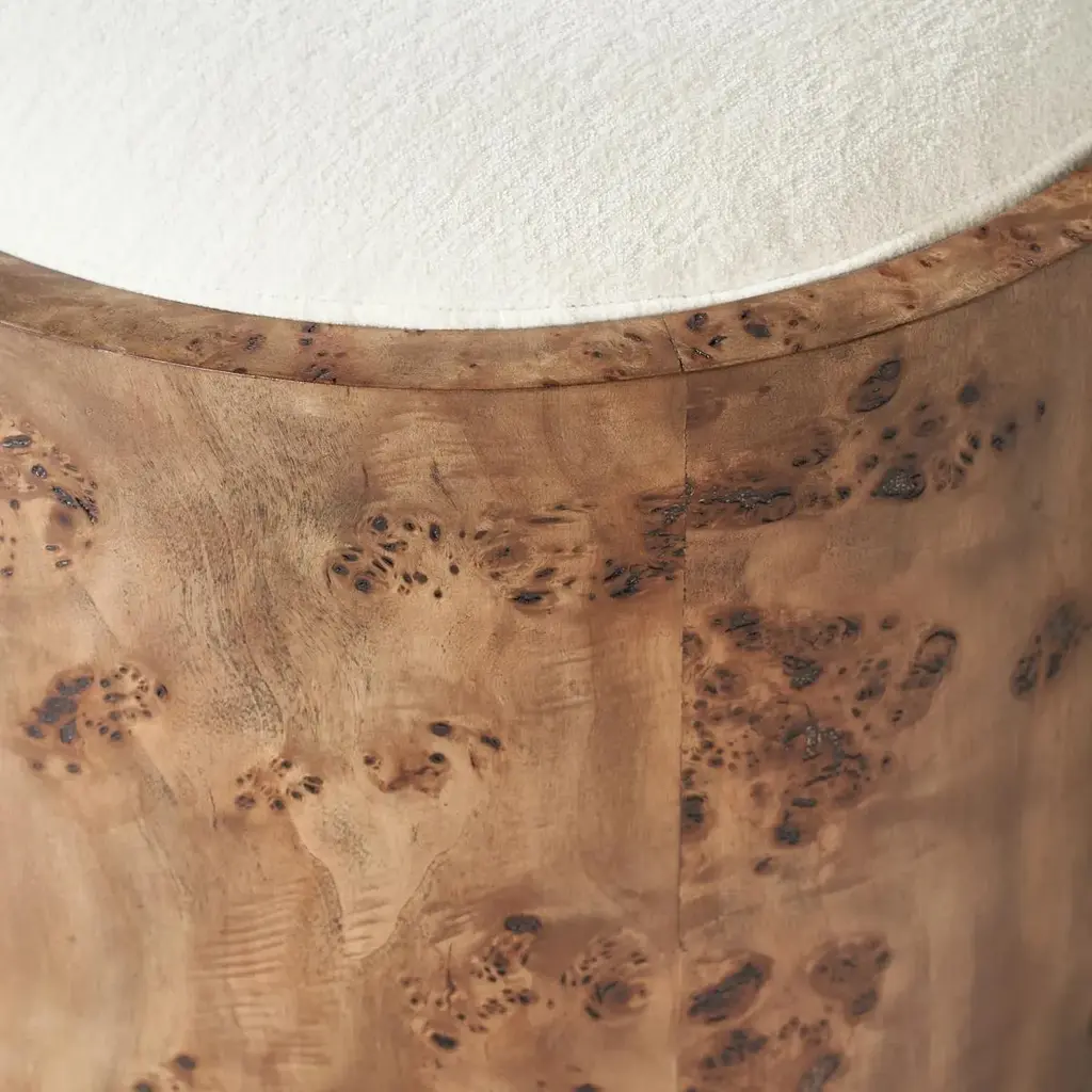 The Cora Bench in ivory creates a serene design moment with its soft tone and bold form. Upholstered in plush ivory chenille, the seat is cradled by curved end panels finished in ash burl veneer, where each swirling grain tells a unique story of natural artistry. The contrast between the creamy upholstery and the rich wood grain adds depth and visual intrigue. Its oval silhouette and book-matched burl detailing invite attention from every angle, making it as functional as it is sculptural. Reinforced with a kiln-dried hardwood frame, this ivory chenille bench is ideal at the foot of a bed or styled with stone and linen in the living room.ZG Exclusive