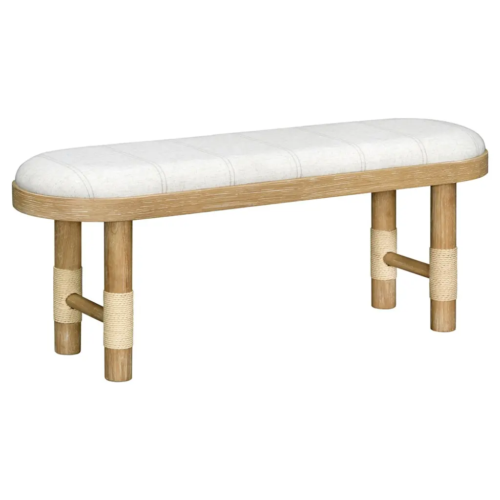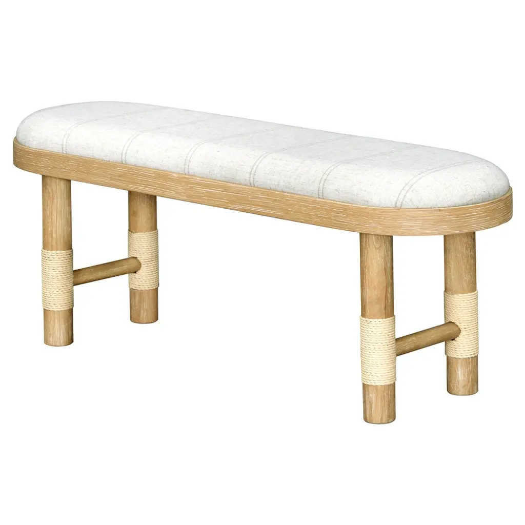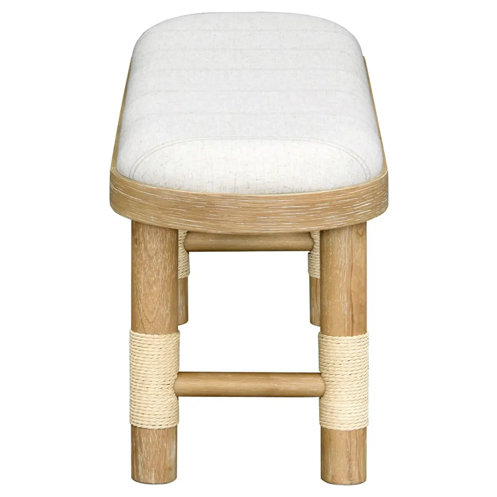 Cora Coastal Beach Beige Linen Brown Wood Entryway Bench