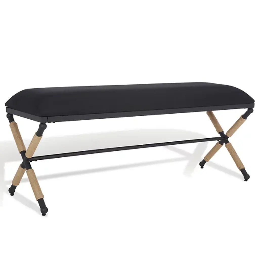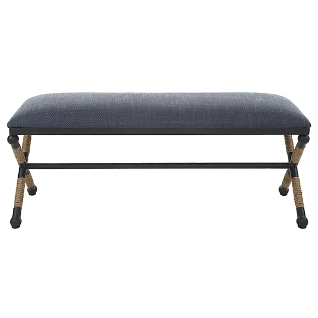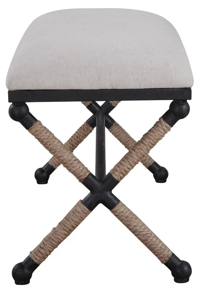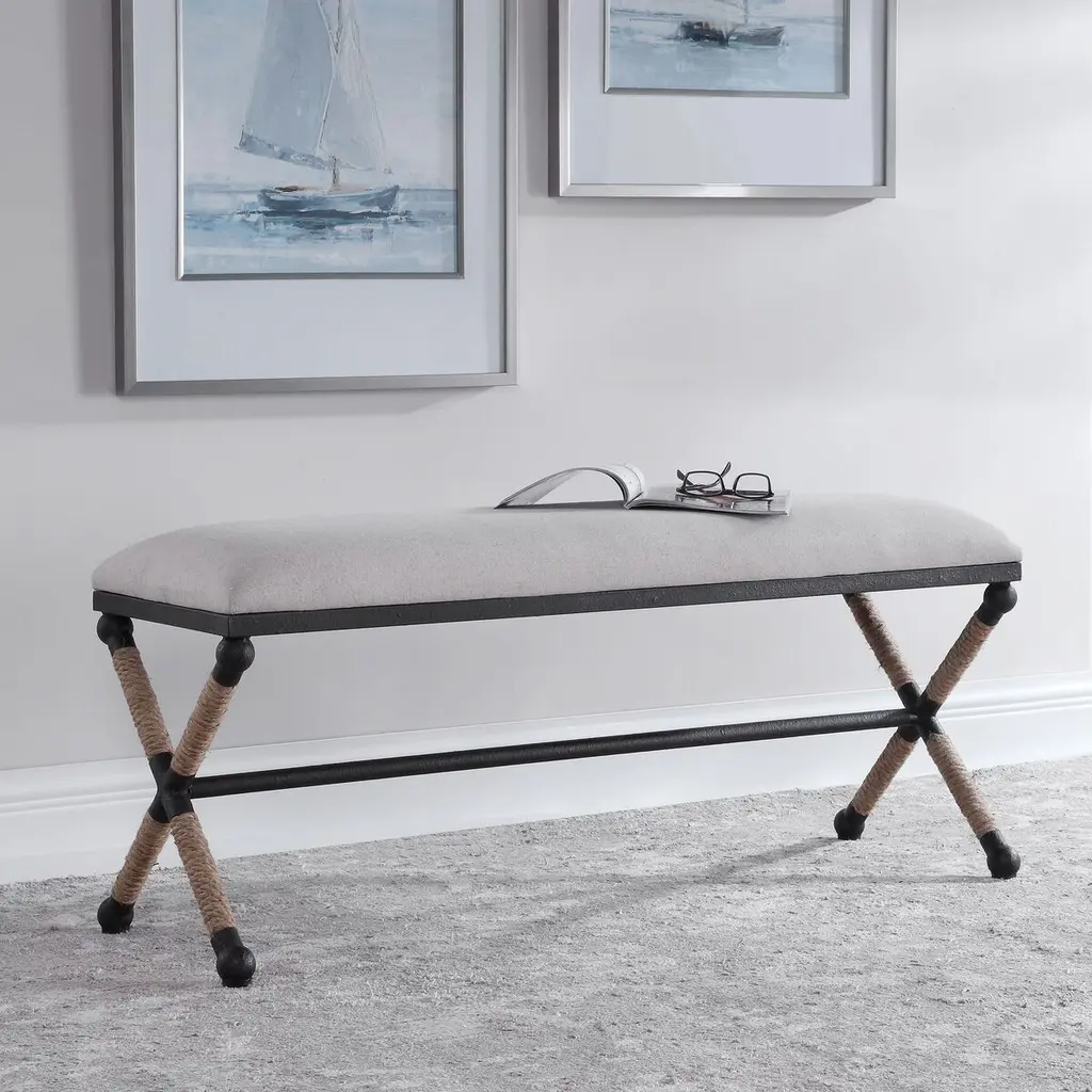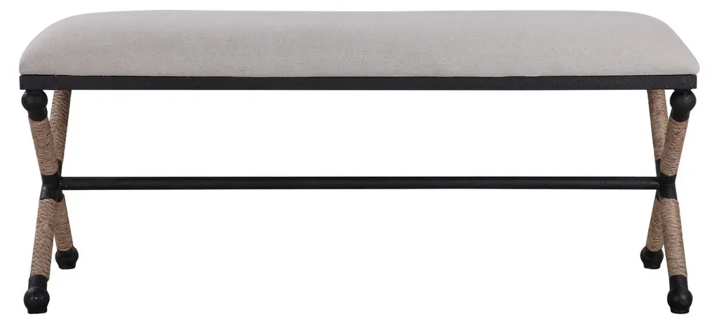 Rustic iron frame with a nautical touch, wrapped in natural fiber rope accents. Cushioned top is a sturdy, cotton in a neutral oatmeal.