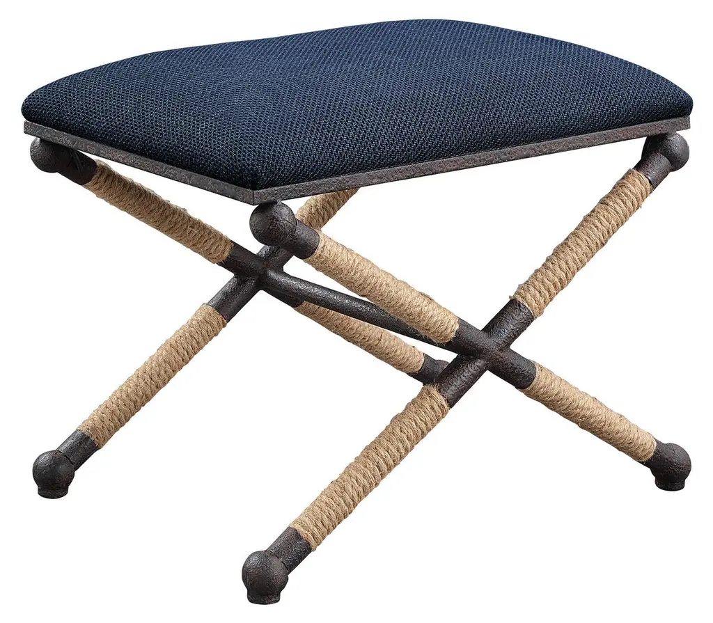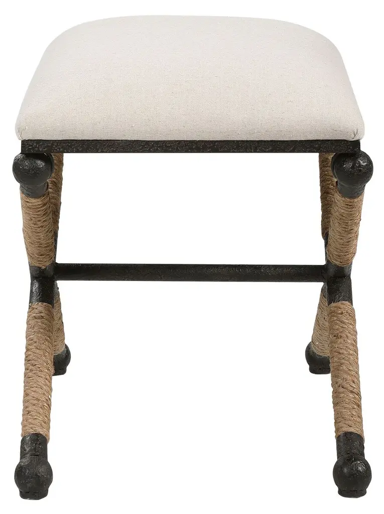 Rustic iron frame with a nautical touch, wrapped in natural fiber rope accents. Cushioned top is a sturdy, cotton in a neutral oatmeal.