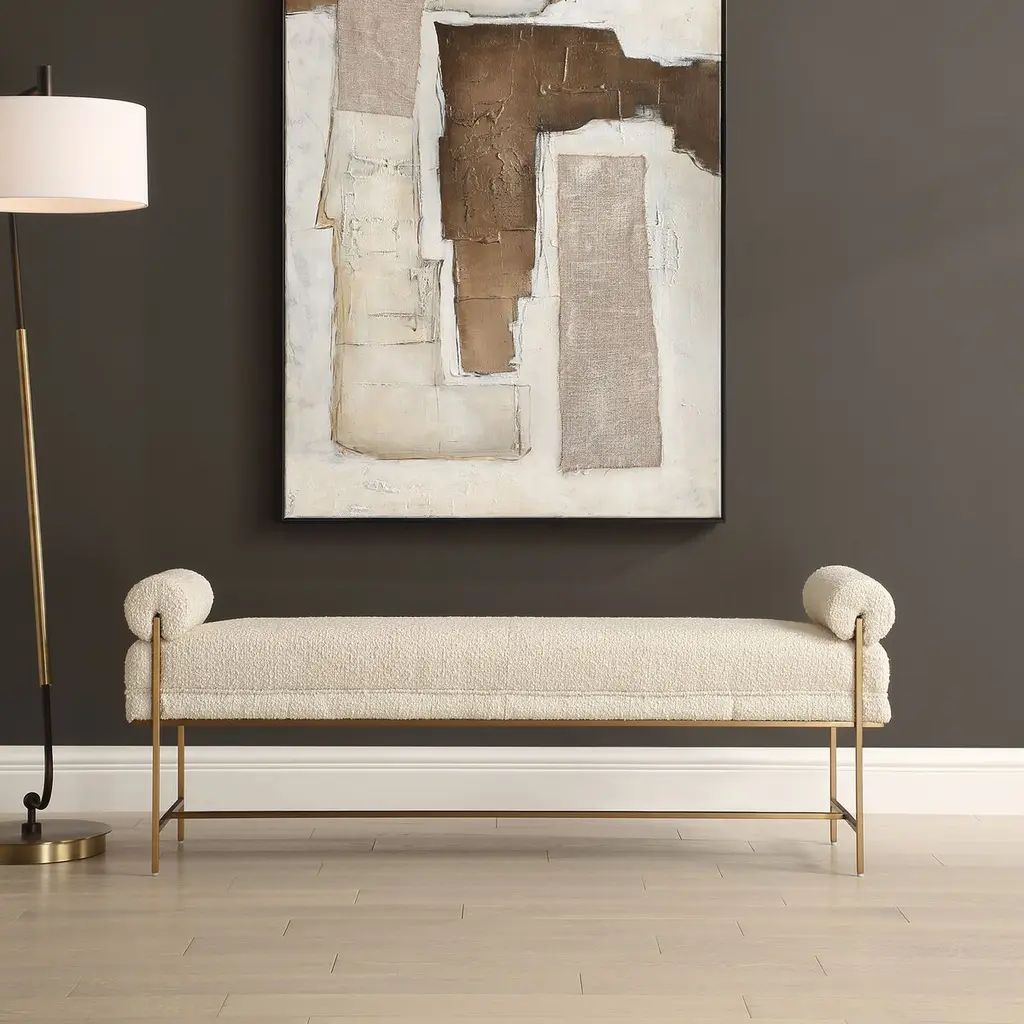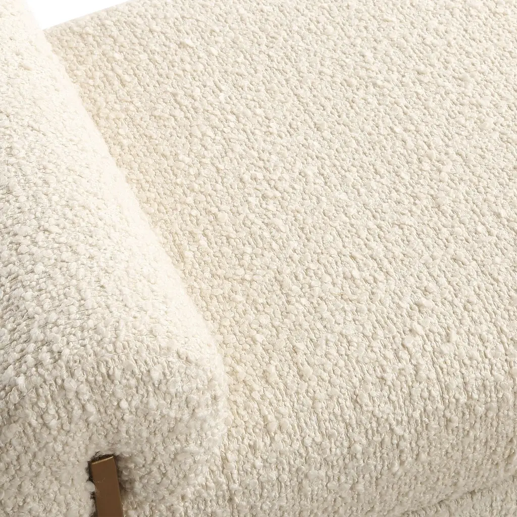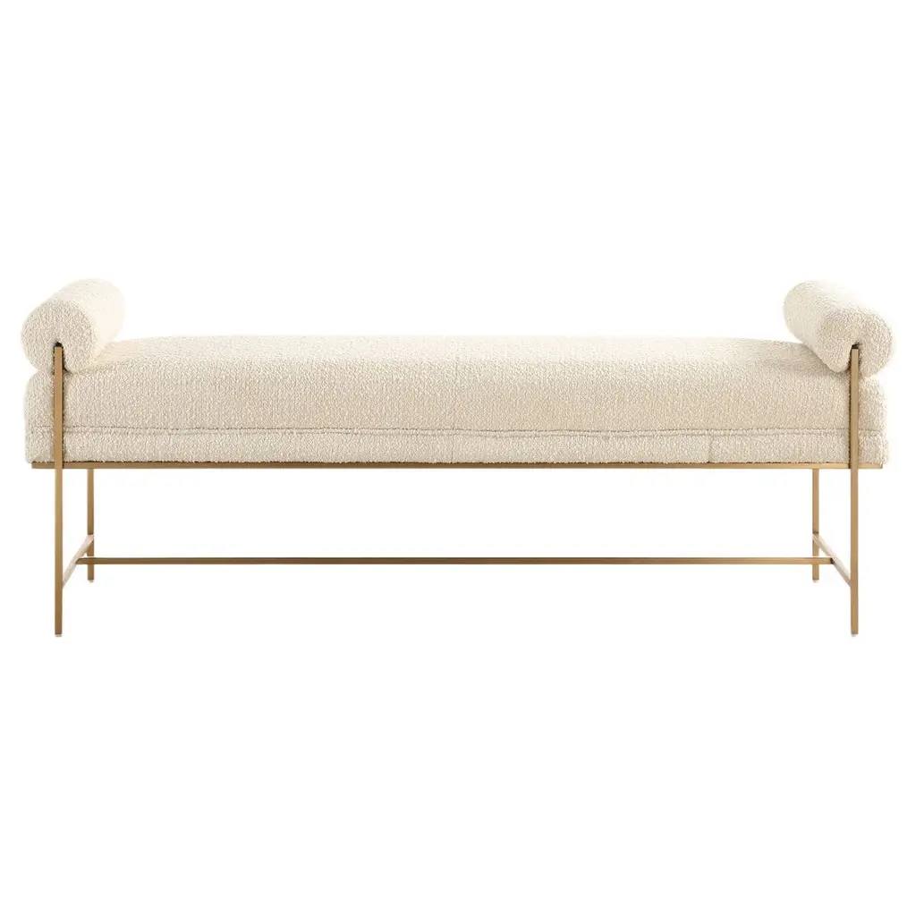 Introducing the Corin Bench, a piece that embodies elegance and sophistication. This chic accent bench is designed to captivate with its supportive yet stylish stainless steel frame, exuding a timeless allure. The frame, finished in a luxurious brushed brass, complements the fixed Corin pillow accents, creating a harmonious blend of form and function. Upholstered in a textured boucle polyester, the bench offers a tactile experience that is both inviting and refined. With a seat height of 19 inches, it promises comfort and style, making it a perfect addition to any space. The Corin Bench is more than just a piece of furniture; it is a statement of taste and elegance, ready to enhance the beauty of your home.