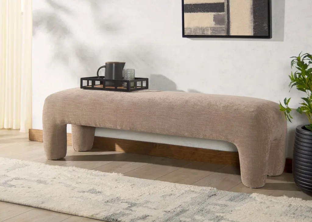 Elevate your space with this sleek, modern bench featuring soft curves and a fully upholstered design. Its neutral tone and plush texture make it versatile for bedrooms, entryways, or living rooms. Both functional and stylish, it’s the perfect blend of comfort and contemporary appeal.