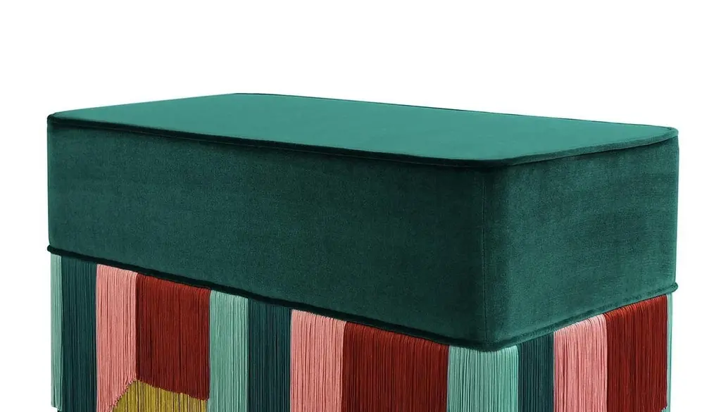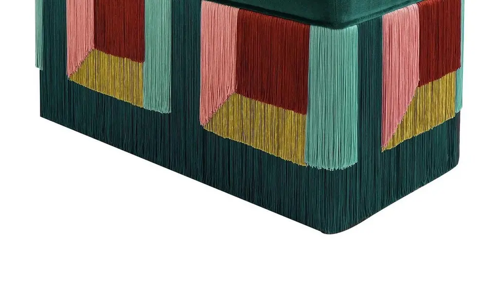 The modern sensibility of Bozzoli's designs characterizes her collection of ottomans and benches, presented at Milan Design Week in 2019. The sense of modernity is given by her use of vibrant colors and geometric shapes. Hanging from an emerald green cushion, sapphire, pink, and olive green fringes meet to form elegant rectangular shapes. This pieces may be displayed with other couture-inspired objects and is customizable, please ask the Concierge for more information. Each bespoke piece is stamped at the bottom of the lining of the pouf, signed, numbered and dated personally by the designer Lorenza Bozzoli. The original authenticity of each product highlights the artisanal quality and the art of a luxury dedicated design.