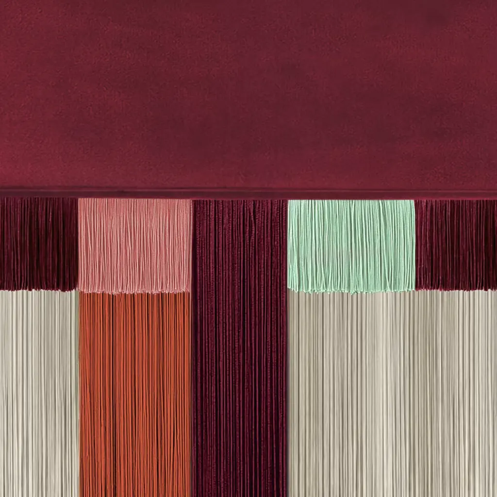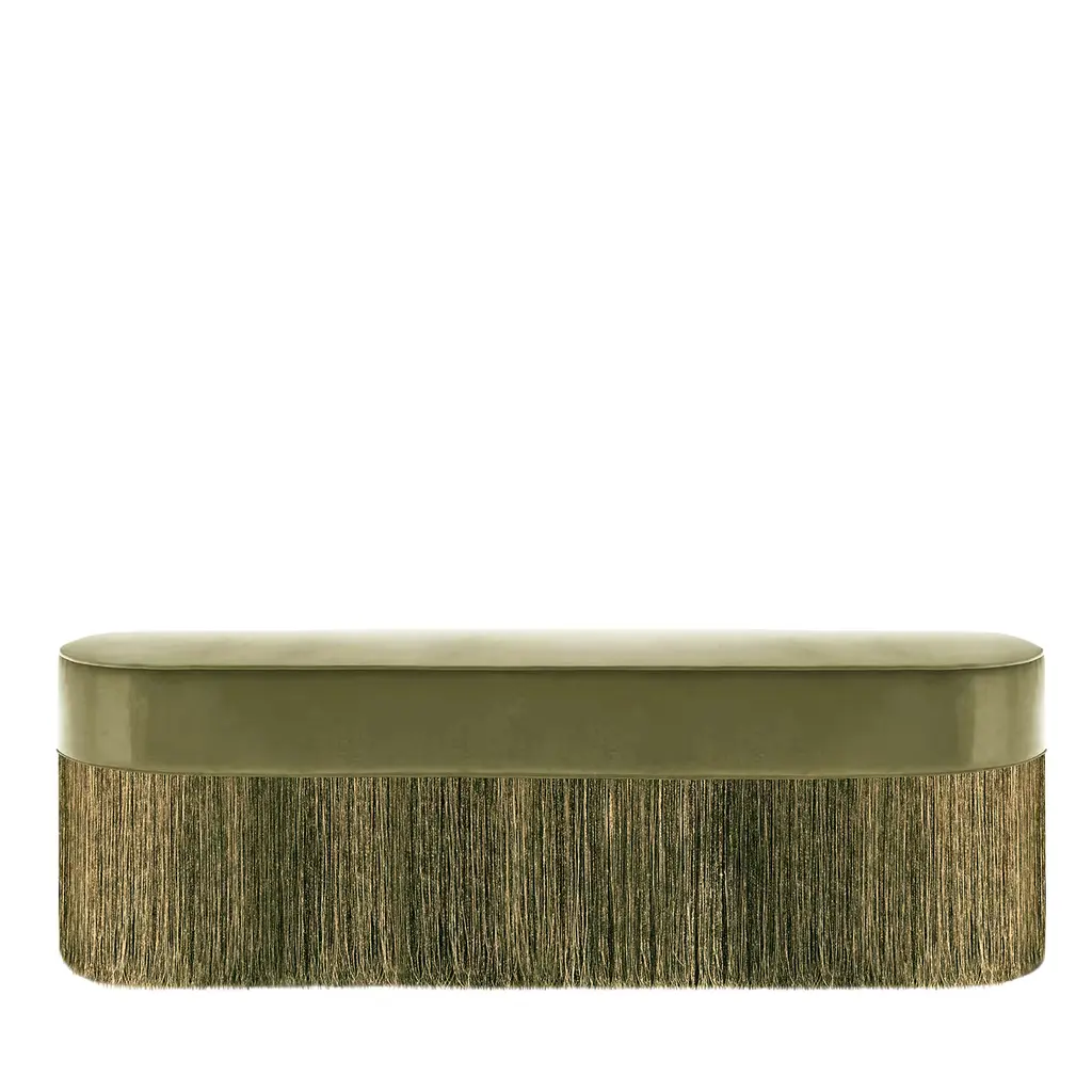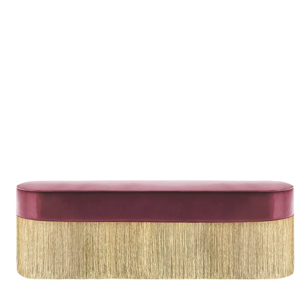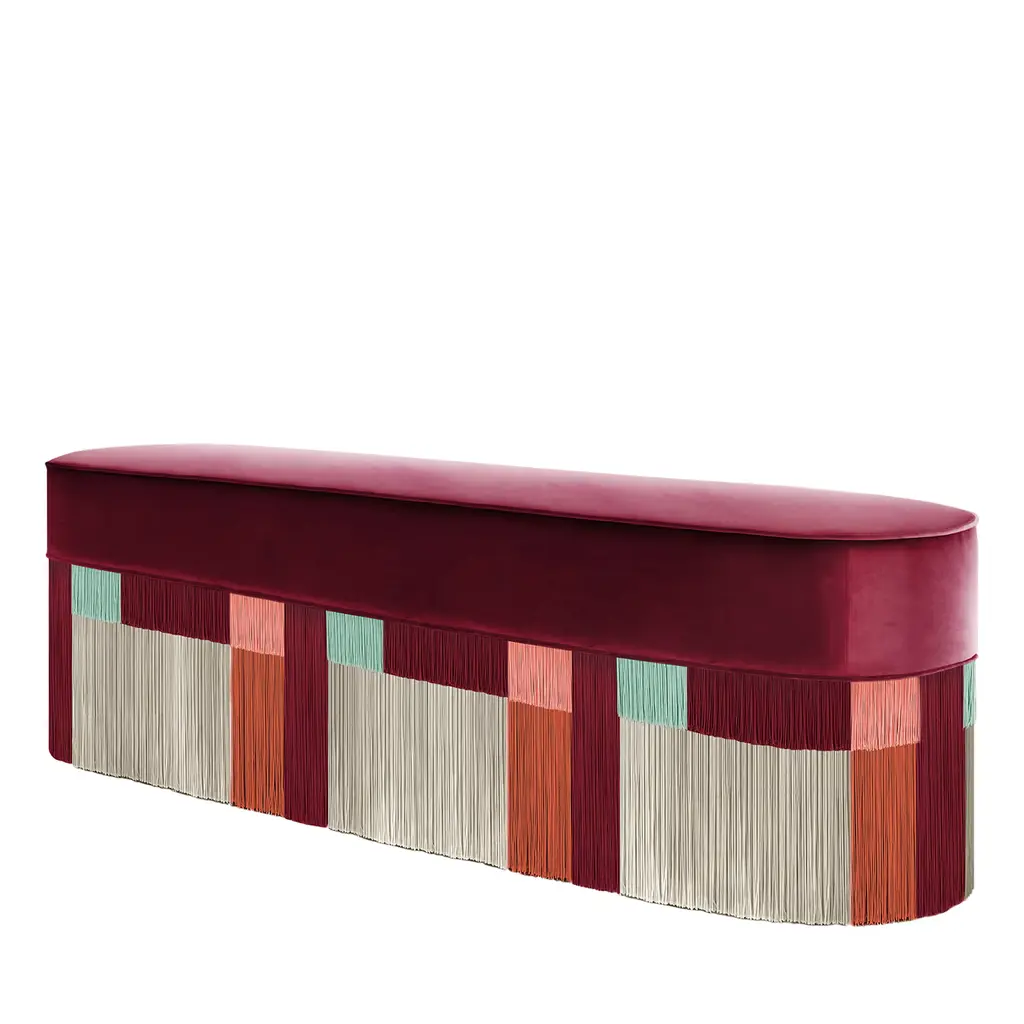 Sartorial excellence merges with geometric dynamism in this superb bench. Offered in a size ideally matching the elevation of most beds, it flaunts a wide round-sided seat covered in burgundy velvet that counterbalances the eccentric and colorful geometric pattern obtained from the combination of staggered fringes below. Please consult the Concierge for customization options. Each bespoke piece is stamped on the bottom of the pouf’s lining and personally signed, numbered, and dated by designer.