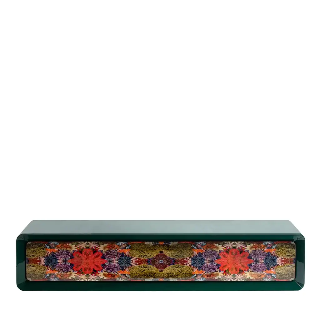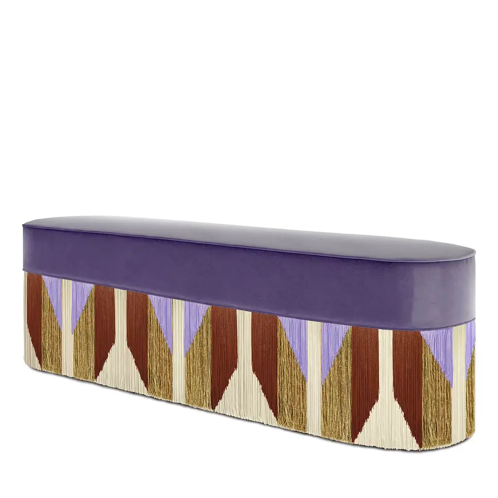 Eccentric and sophisticated, this bench is a precious sartorial piece that will find ideal positioning at the end of a modern double bed. The distinguishing trait is the colorful tribal-inspired pattern obtained by arranging different viscose fringes, for a visual effect of hypnotizing allure. A wide purple velvet seat completes the design. Please contact the Concierge for available customization options. Each bespoke piece is stamped on the bottom of the pouf’s lining and personally signed, numbered, and dated by designer.