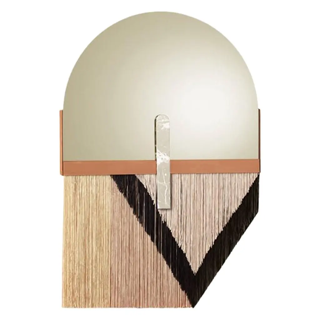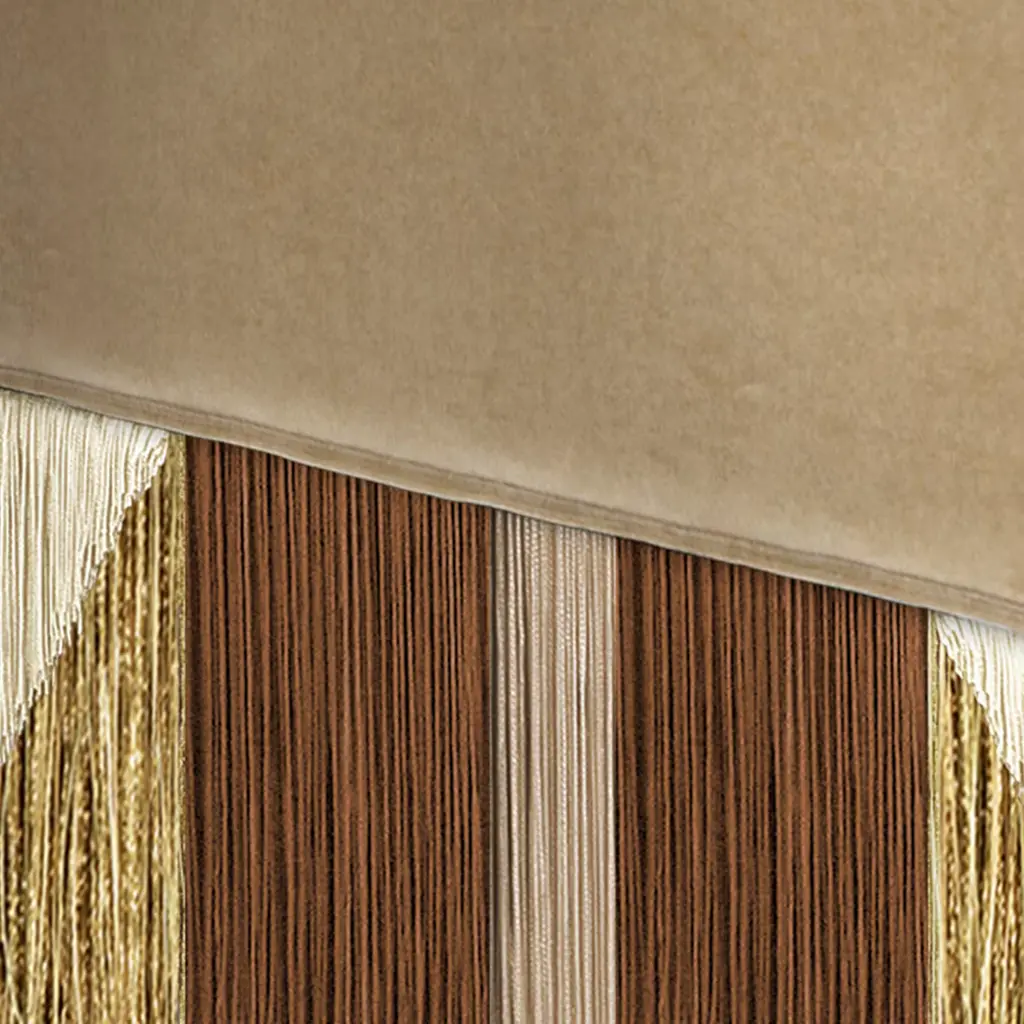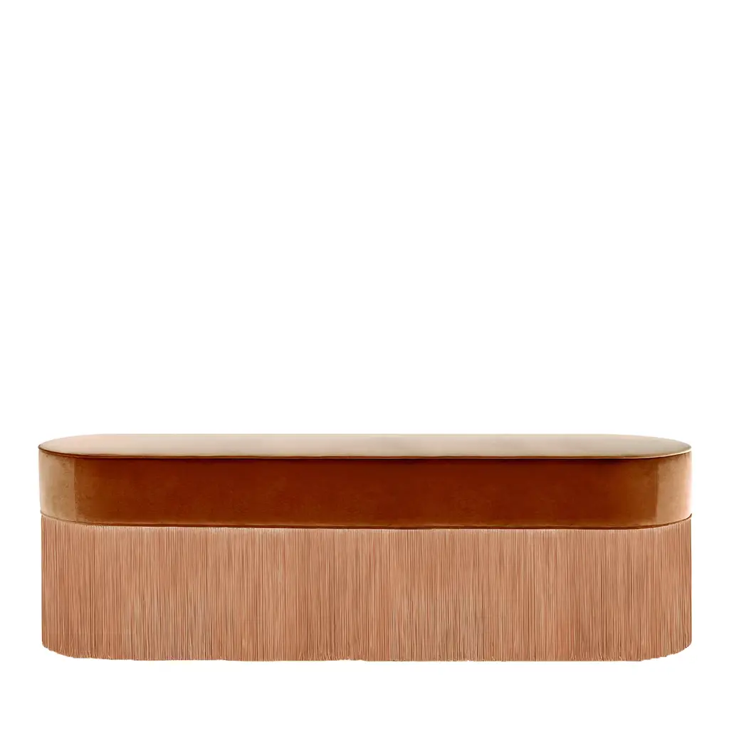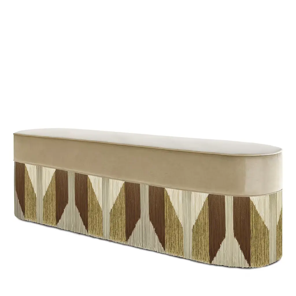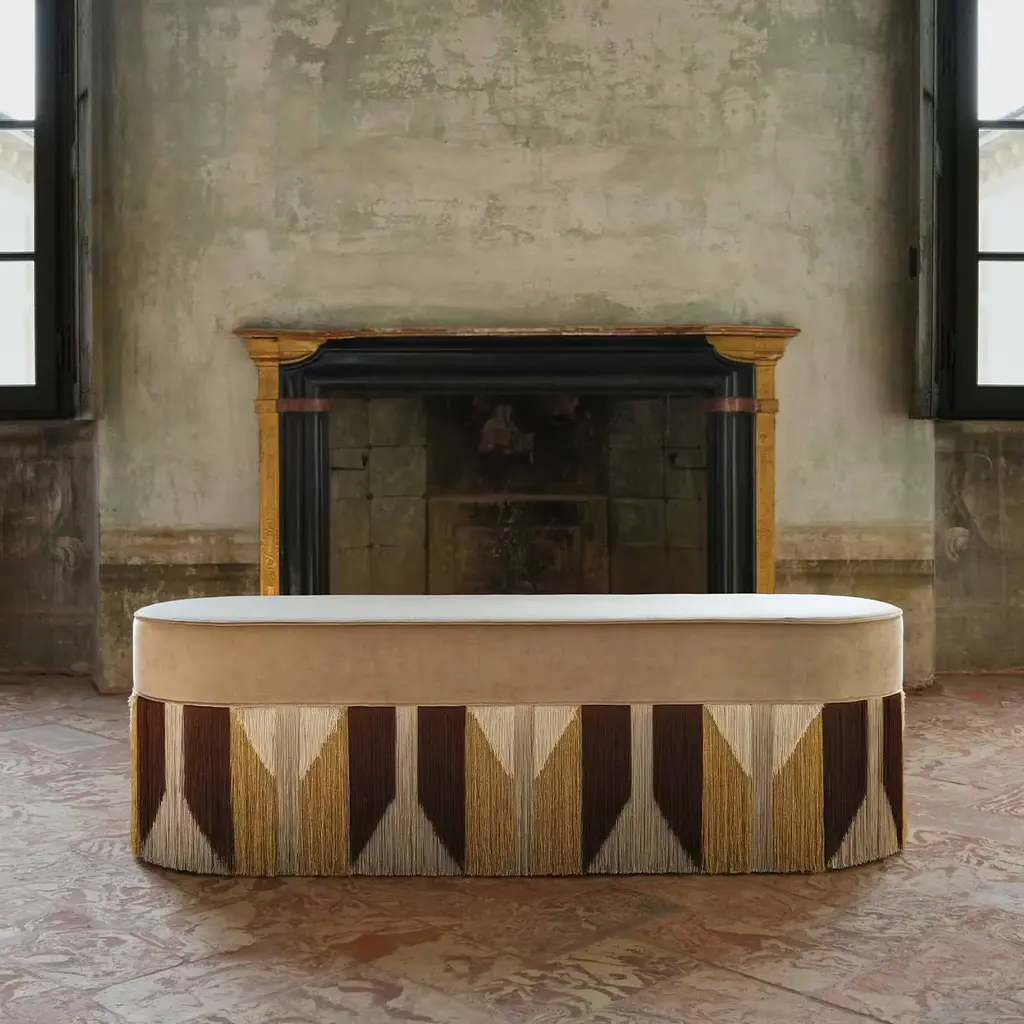 Sartorial excellence and chromatic elegance merge in this superb artisan bench. Featuring a sturdy beech core, it stands out for the array of earthy-toned viscose fringes that are thoughtfully arranged to create an intriguing tribal-inspired pattern. Perfect comfort is guaranteed by the wide curve-sided seat covered in fine beige velvet. Please contact the Concierge for customization options. Each bespoke piece is stamped on the bottom of the pouf’s lining and personally signed, numbered, and dated by designer.