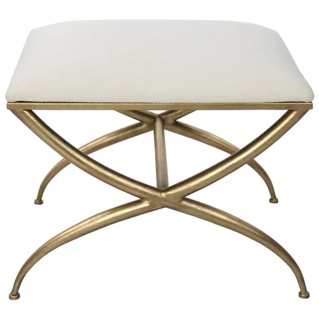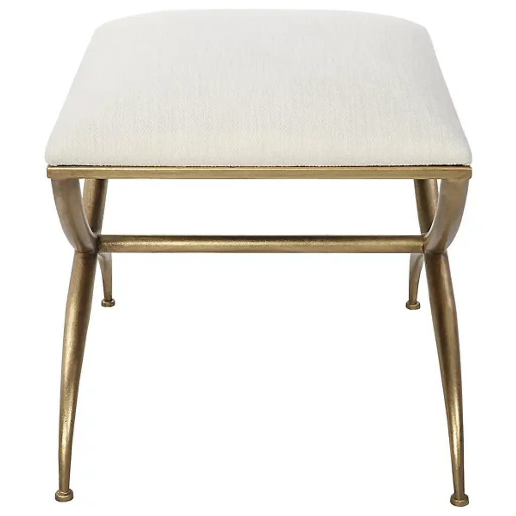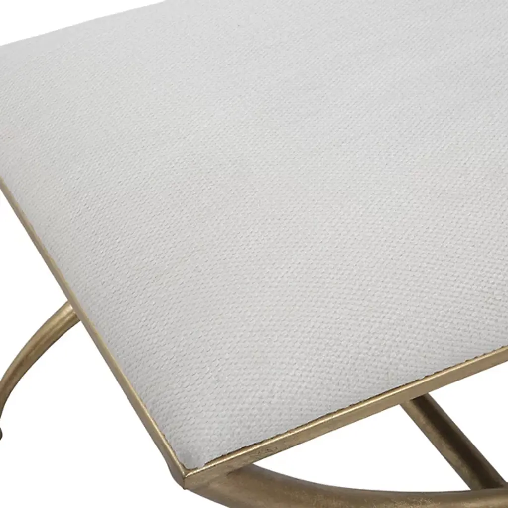 The Crossing Bench from Uttermost showcases classic yet modern elegance. This small bench has a gracefully curved iron frame, adding a touch of sophistication to any space. The cushioned top, upholstered in crisp white fabric, offers both comfort and style, making it a versatile seat or footrest. Your bench boasts exquisite contours, an iron frame, foam fill, and MDF for durability and quality. Elevate your decor with this timeless yet contemporary masterpiece, a wonderful blend of style and comfort.