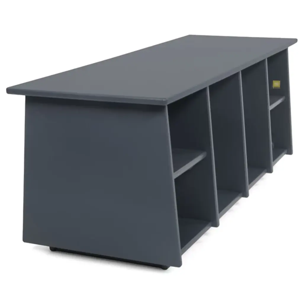 The Loll Designs Cubby Bench with Boot Holes provides a convenient place in which to take off your shoes, as well as an organized way to store them. The various cubbies accommodate shoes and boots, bags, helmets and other outdoor gear. It is made out of recycled milk jugs and non-recycled HDPE and comes in a variety of attractive colors.