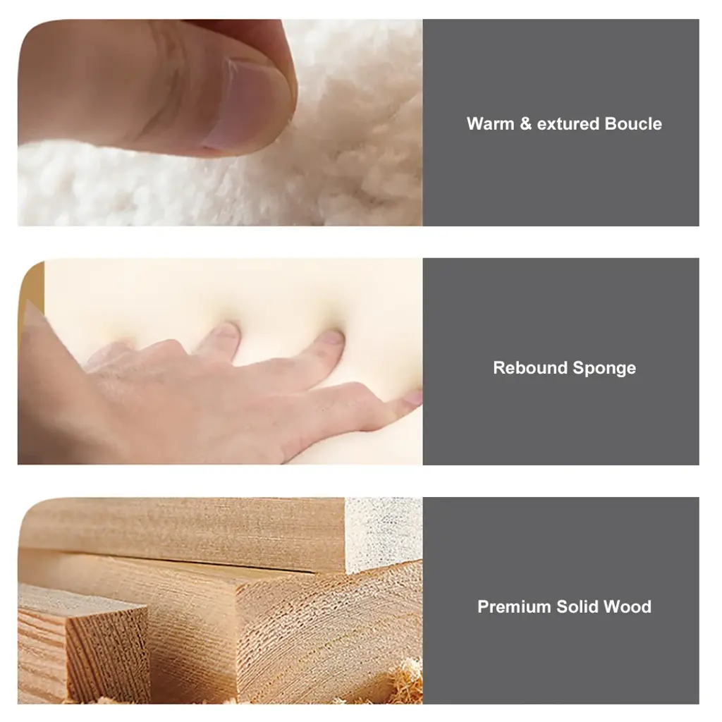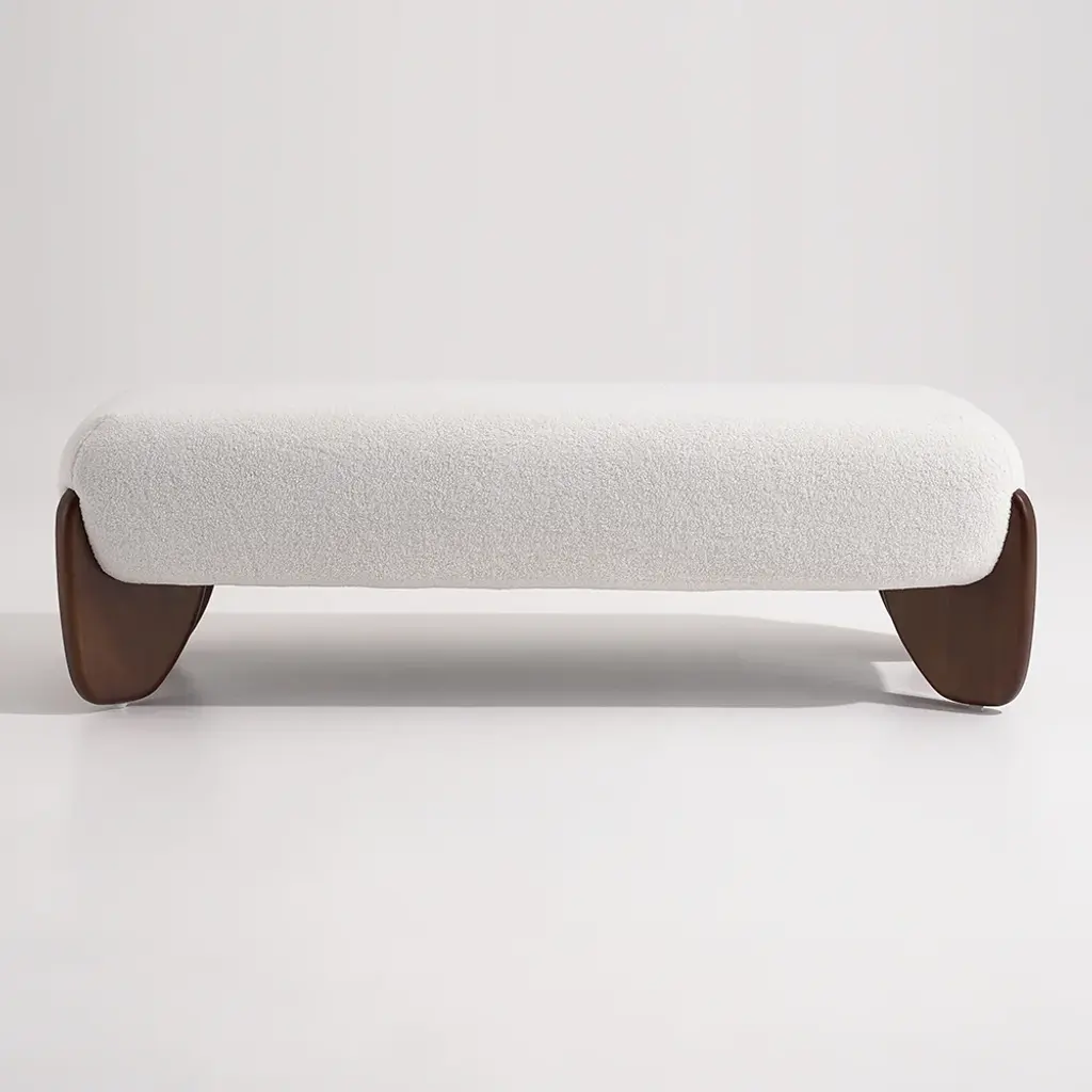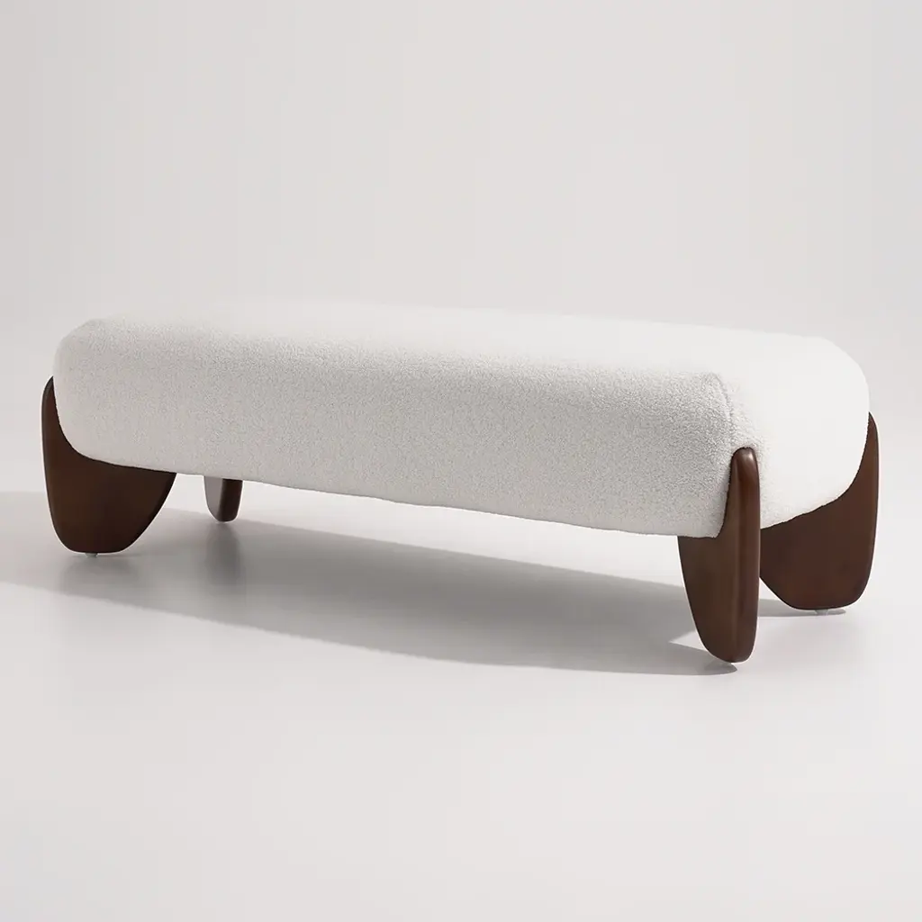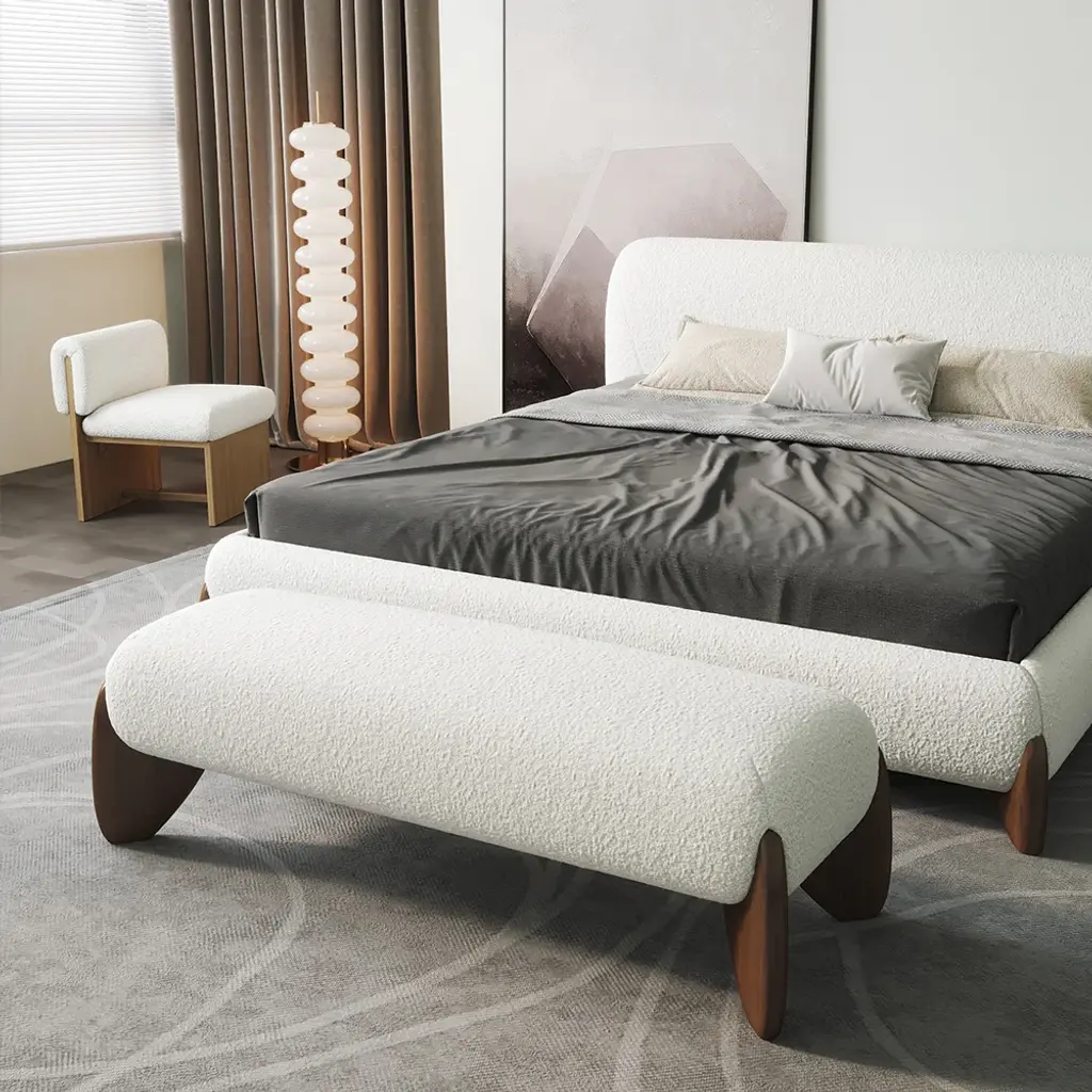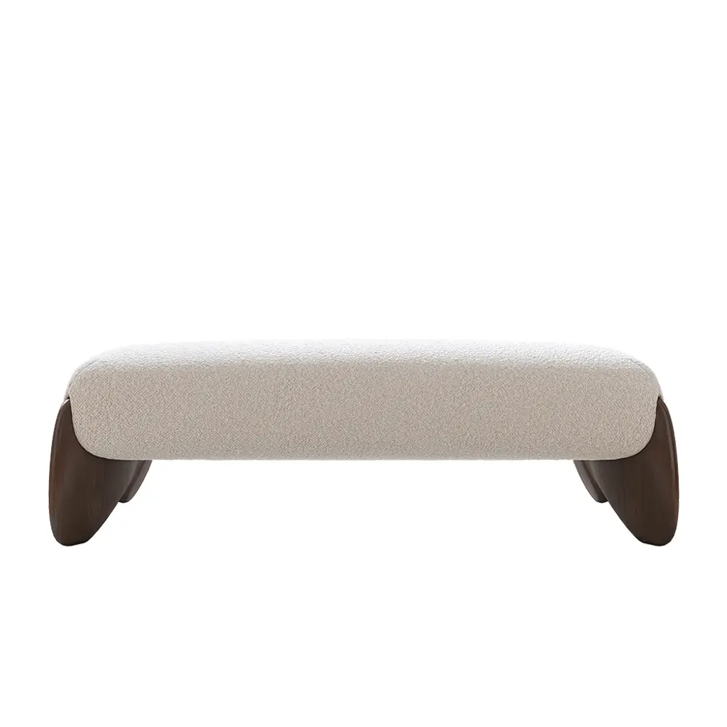 This is an elegant bedroom bench with a soft boucle seat and solid rubber wood legs. The luxurious feel in the fabric and strength in the legs caters to both aesthetic and practical needs. The bench works great in a bedroom, hallway, or living room and is a perfect sitting place to add grace and modernity to any space.