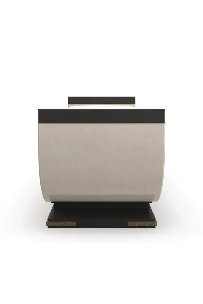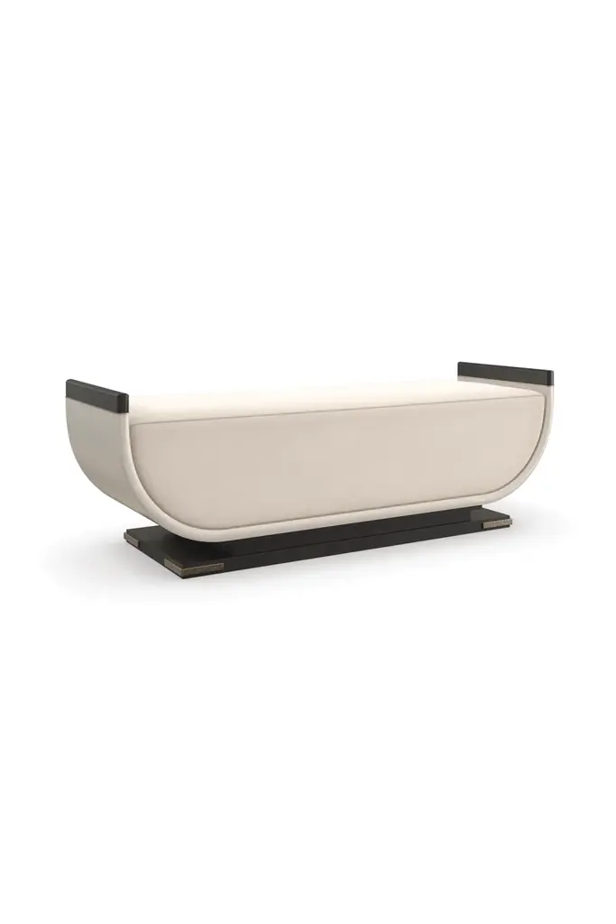 With a classic form inspired by an ancient Greek ceremonial vessel, this end-of-bed bench brings an exquisite mix of detail and materiality. Features a plush upholstered front and seat, embraced by a curved poplar frame in an Ivory Craze crackle finish. A Charred Bark finishes on the cap rails and base adds depth and rich contrast, accentuated by a wood bead detail and tactile Brushed Gold brackets. Makes a luxe landing for bedrooms and dressing areas, or style in an entryway to make an unforgettable first impression.