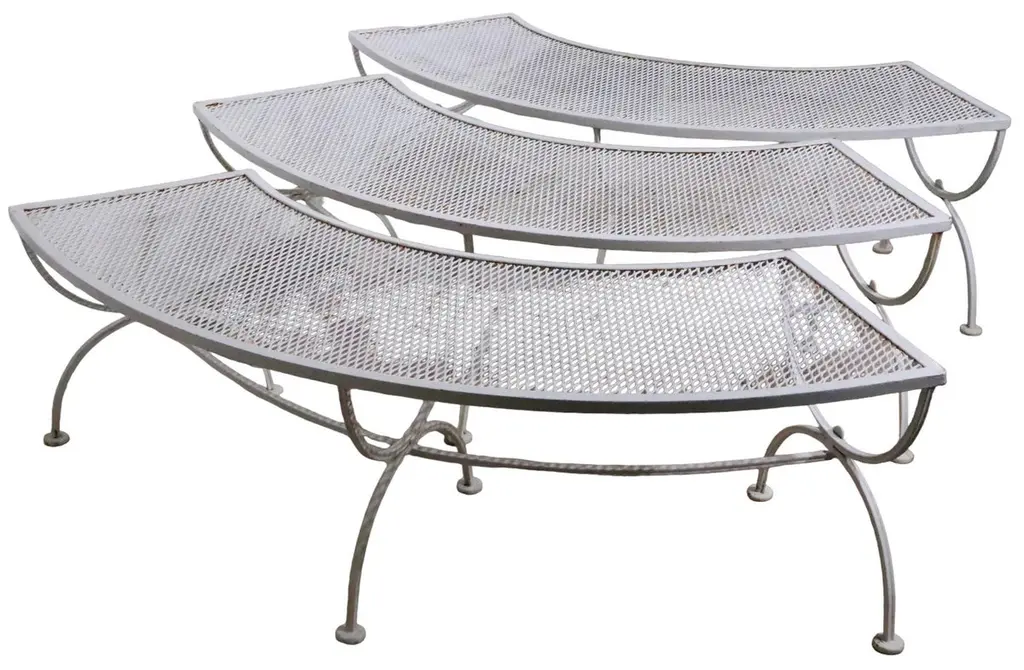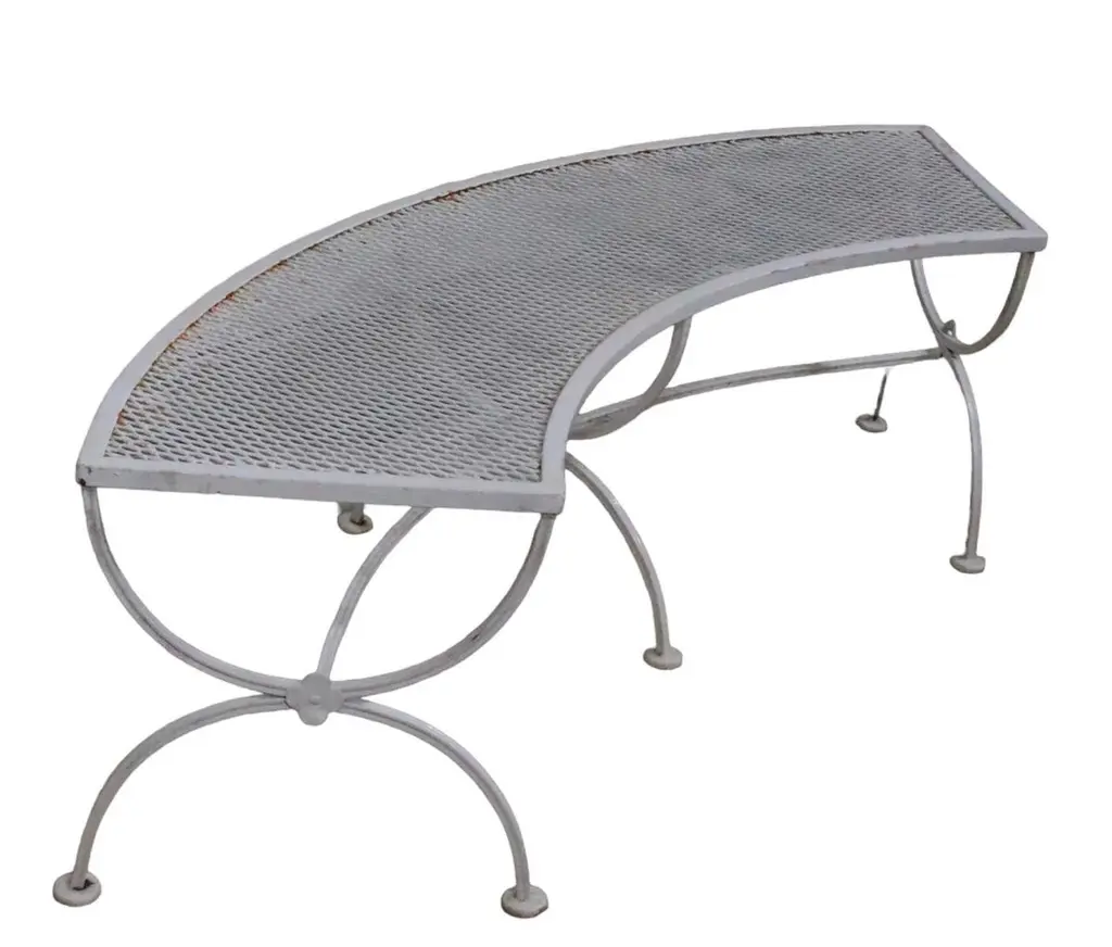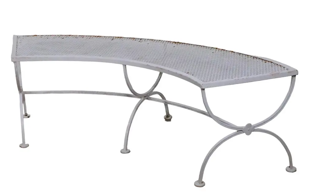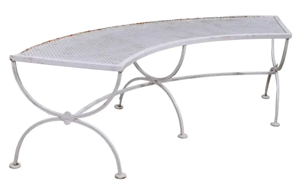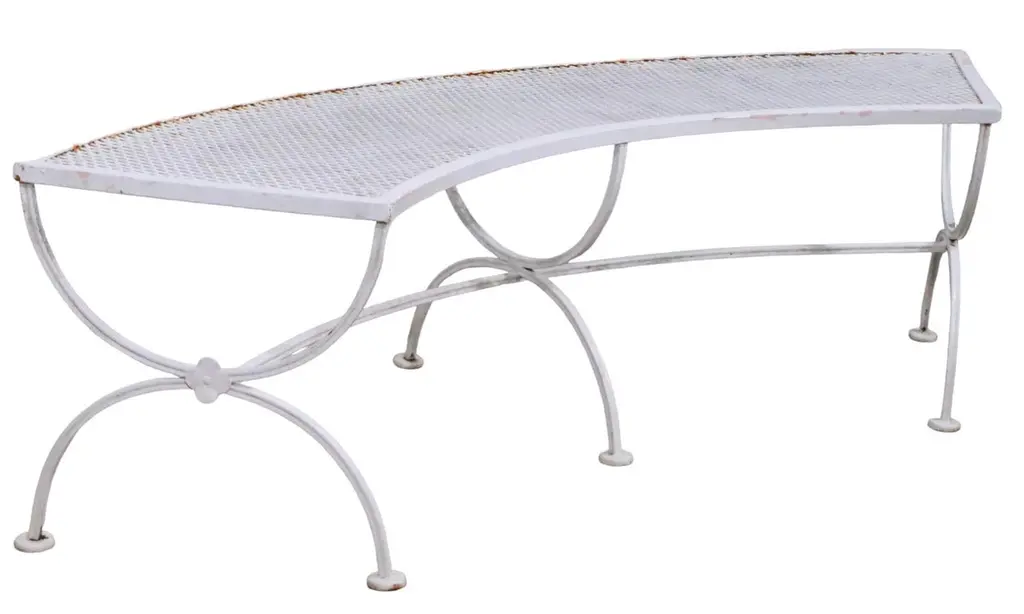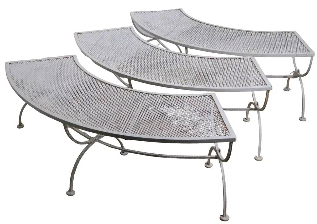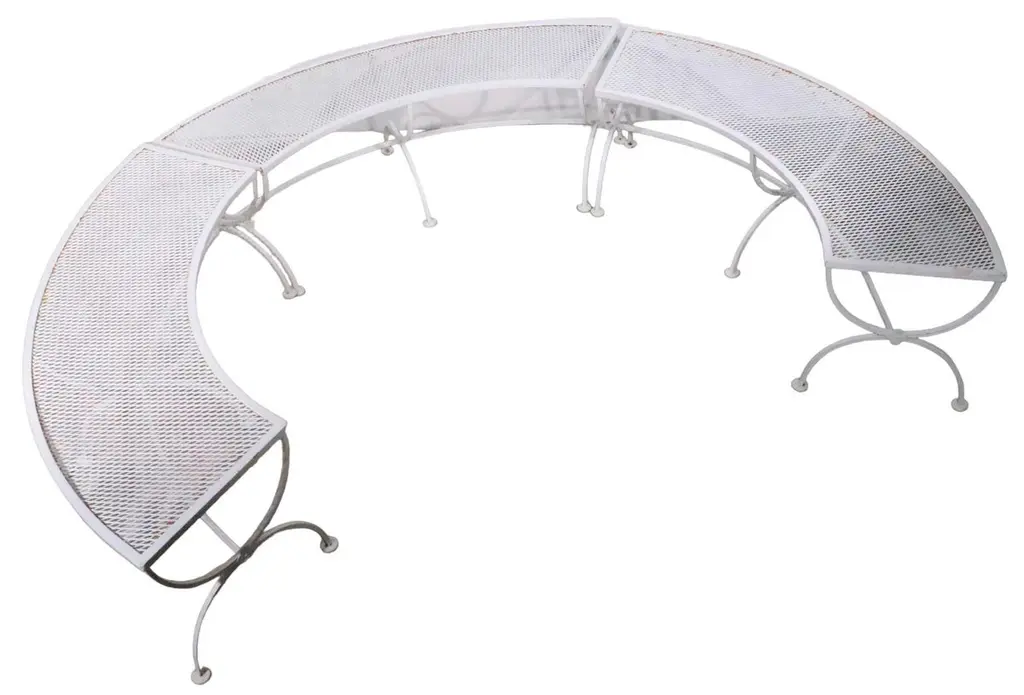 Curved wrought iron and metal mesh bench(s) by Salterini, three available. The benches feature U shaped legs, of wrought iron, which support the curved metal mesh tops. This desirable form is hard to find, especially hard to find in sets. Priced and offered individually, but we would love to see them stay together. Total W 58 x Seat H 17 x D of seat 16 x Total Depth 24 inches. All are structurally sound and sturdy, all show cosmetic wear to the paint finish, normal and consistent with age. Usable as is, or we also offer custom powder coating, if you prefer a more polished look. Please view our extensive collection of vintage garden, patio, and poolside furniture offered at barbarella Home, on 1st Dibs.