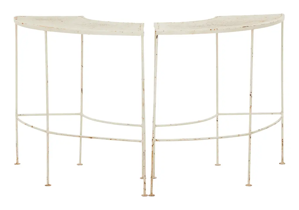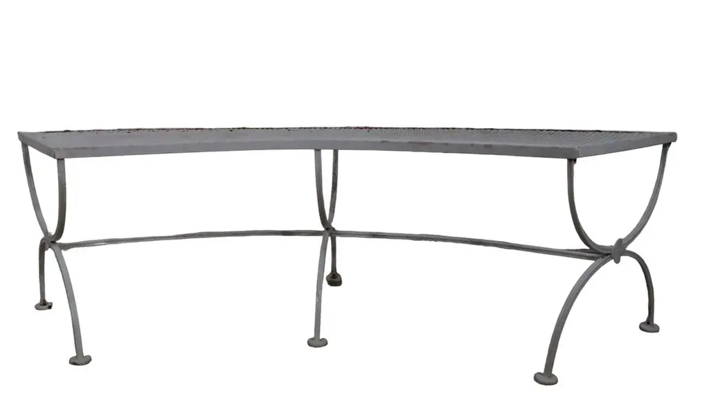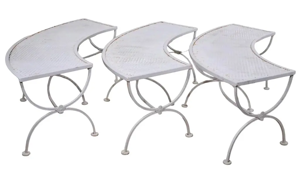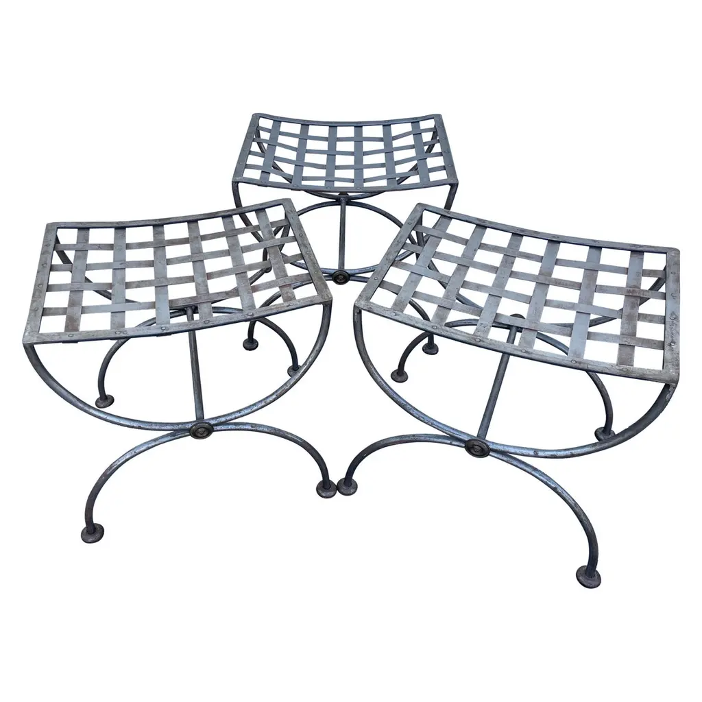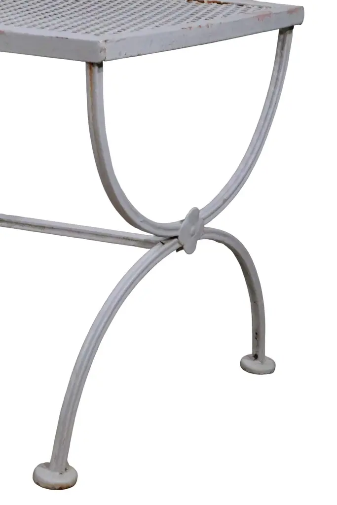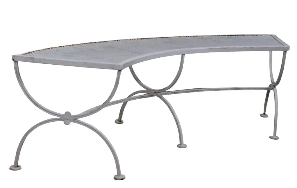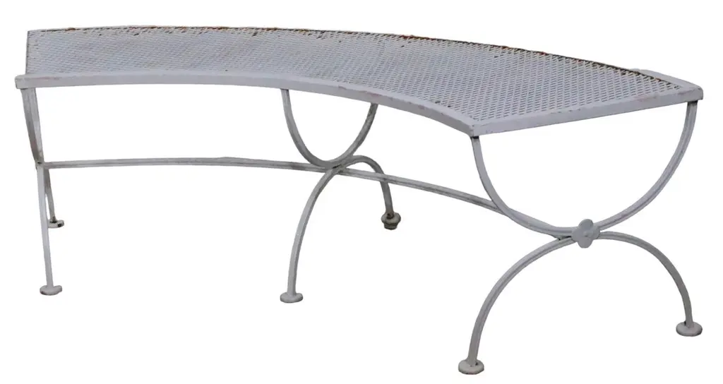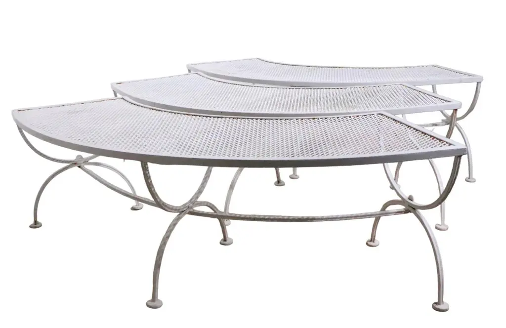 Curved wrought iron and metal mesh bench(s) by Salterini, three available. The benches feature U shaped legs, of wrought iron, which support the curved metal mesh tops. This desirable form is hard to find, especially hard to find in sets. Priced and offered individually, but we would love to see them stay together. Total W 58 x Seat H 17 x D of seat 16 x Total Depth 24 inches. All are structurally sound and sturdy, all show cosmetic wear to the paint finish, normal and consistent with age. Usable as is, or we also offer custom powder coating, if you prefer a more polished look. Please view our extensive collection of vintage garden, patio, and poolside furniture offered at barbarella Home, on 1st Dibs.