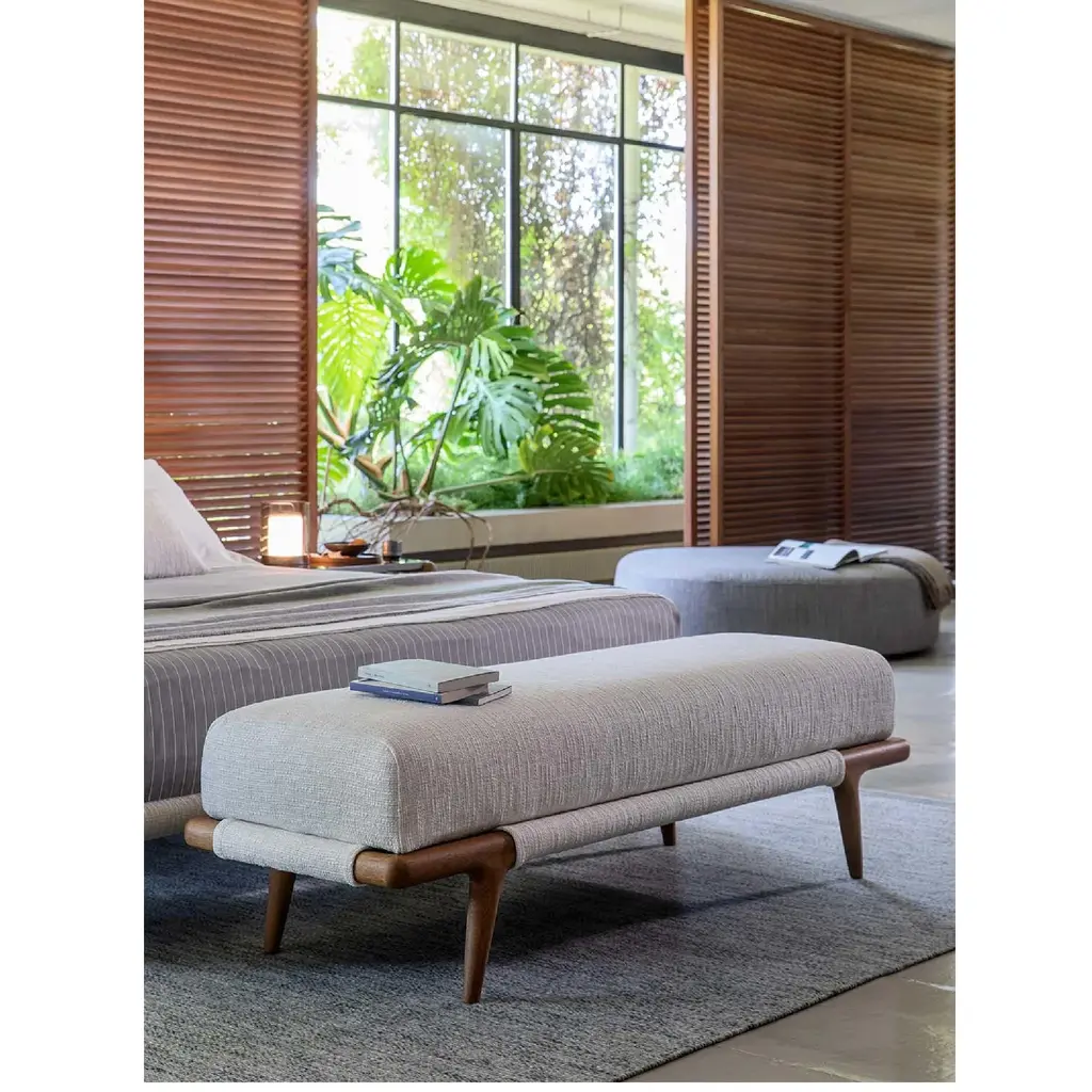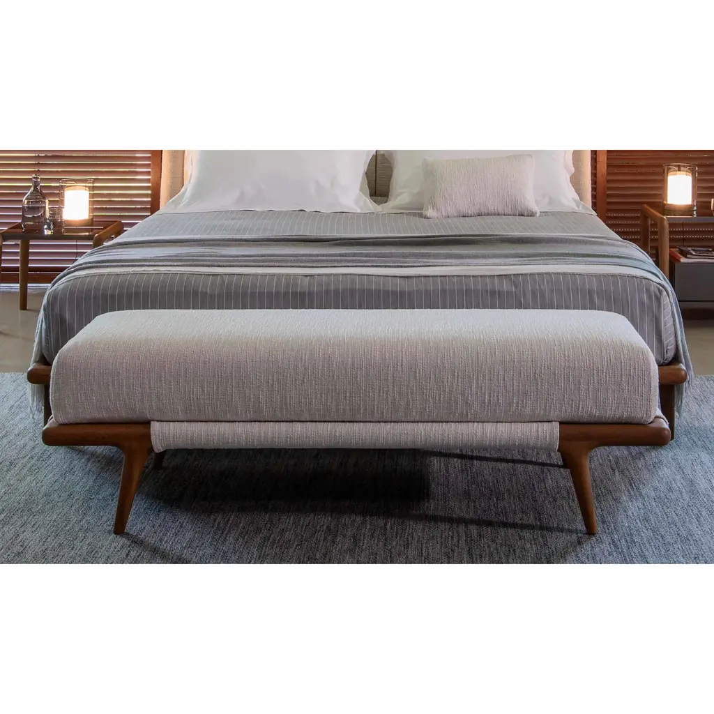 Add a touch of sophistication to any space with the Gaudí bench. Crafted with exposed solid curved wooden feet, it features a soft upholstered seat with visible seams, tying it seamlessly to the Gaudí series. Versatile and elegant, it can be placed at the foot of a bed, in a transition area, or as a complement to a living room. Available in natural, coffee-stained, and black-stained ash, or natural and coffee-stained iroko finishes.