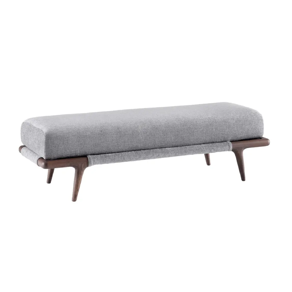 Add a touch of sophistication to any space with the Gaudí bench. Crafted with exposed solid curved wooden feet, it features a soft upholstered seat with visible seams, tying it seamlessly to the Gaudí series. Versatile and elegant, it can be placed at the foot of a bed, in a transition area, or as a complement to a living room. Available in natural, coffee-stained, and black-stained ash, or natural and coffee-stained iroko finishes.