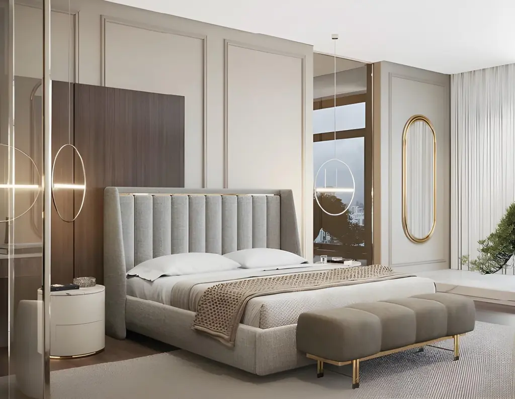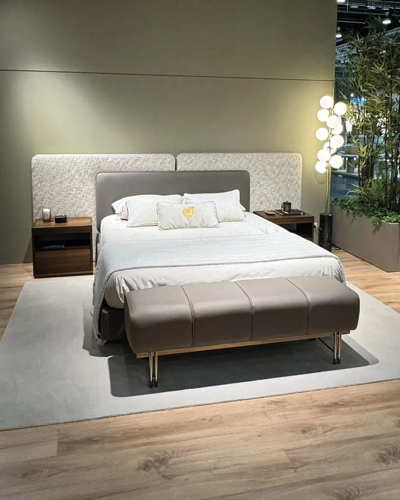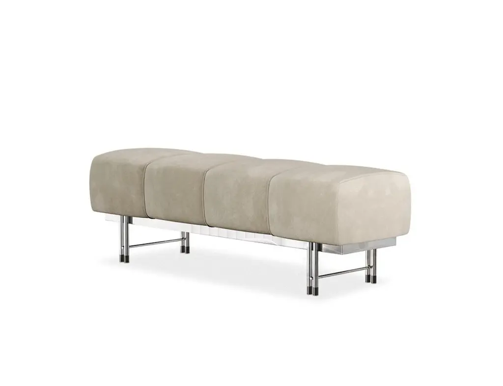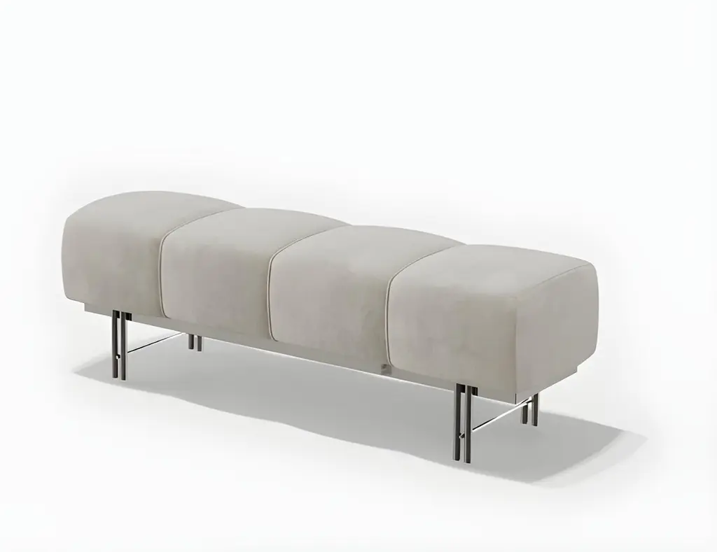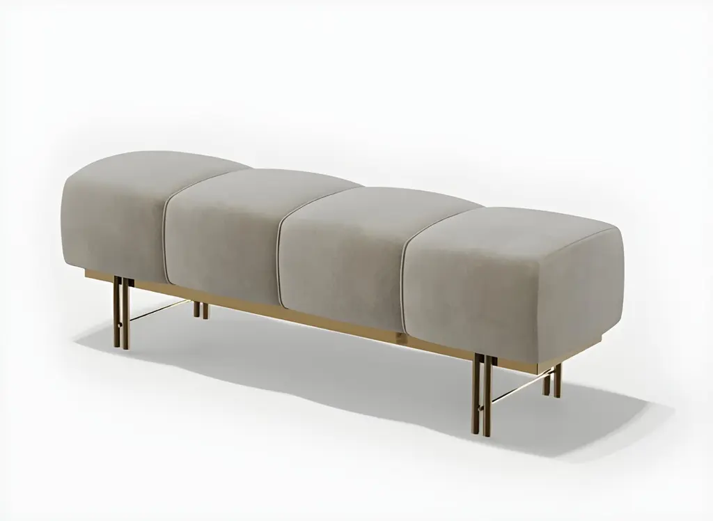This bench exudes modern sophistication with its plush upholstered seat and sleek metal base. The generously cushioned seat, covered in rich fabric, offers exceptional comfort and a touch of luxury. Its segmented design adds a sculptural element, making it a unique piece. The polished gold-tone metal base enhances its contemporary aesthetic, featuring clean lines and sturdy support. Subtle black accents at the base tips provide a refined contrast, adding depth to the design. We do our best to expedite production and to ship and deliver product within the listed lead time, however current lead times might be longer due to global shipping backlog and delays. These delays are out of our control and cannot be a reason to cancel an order.