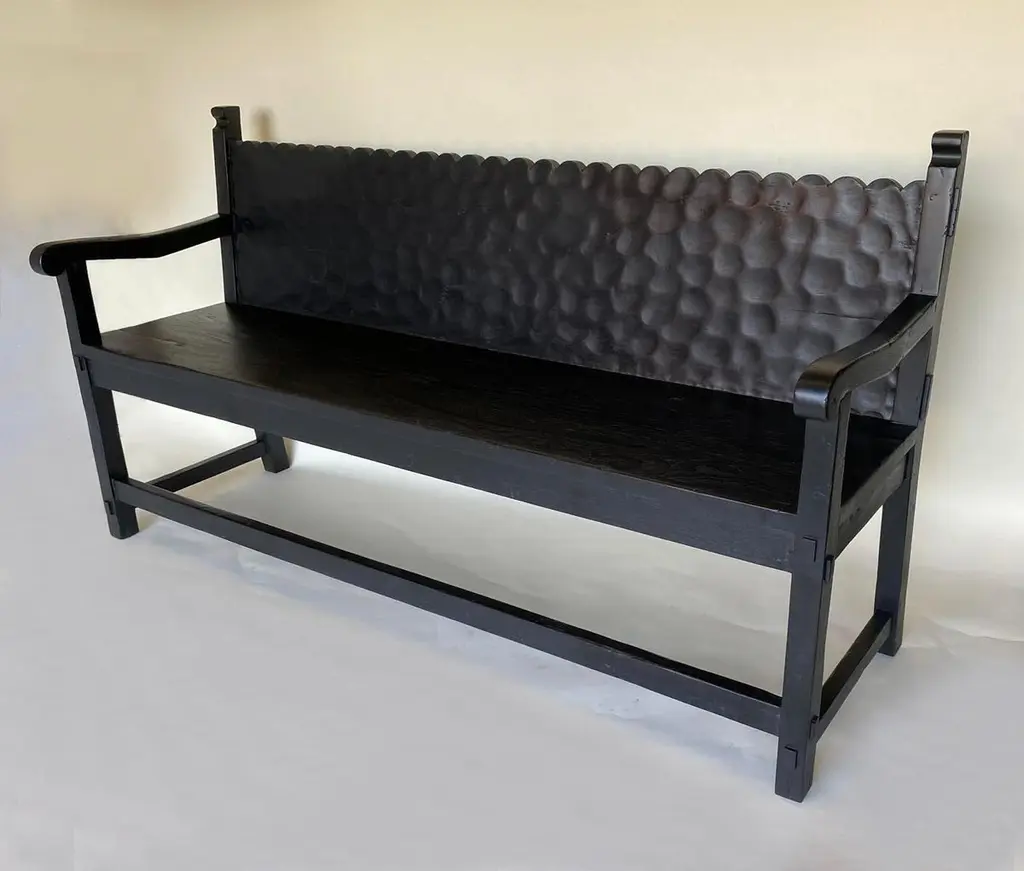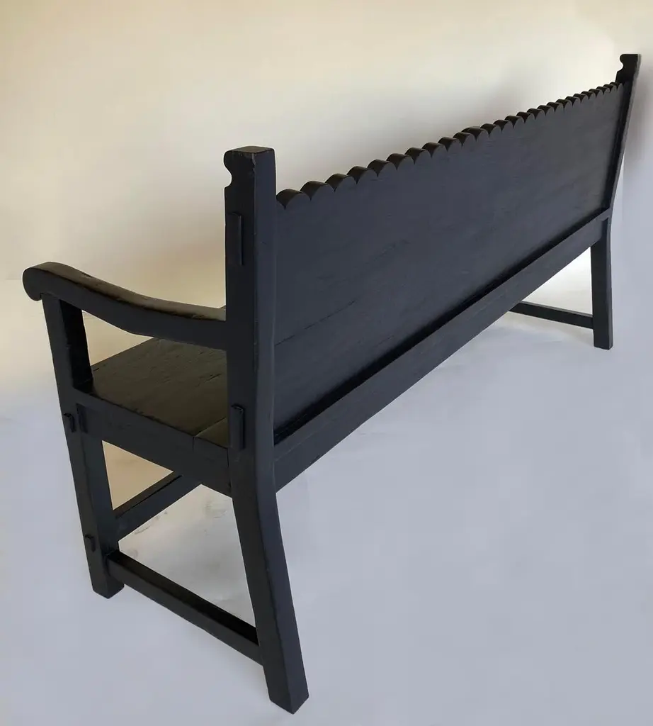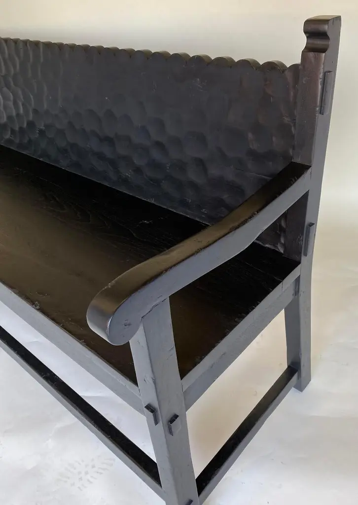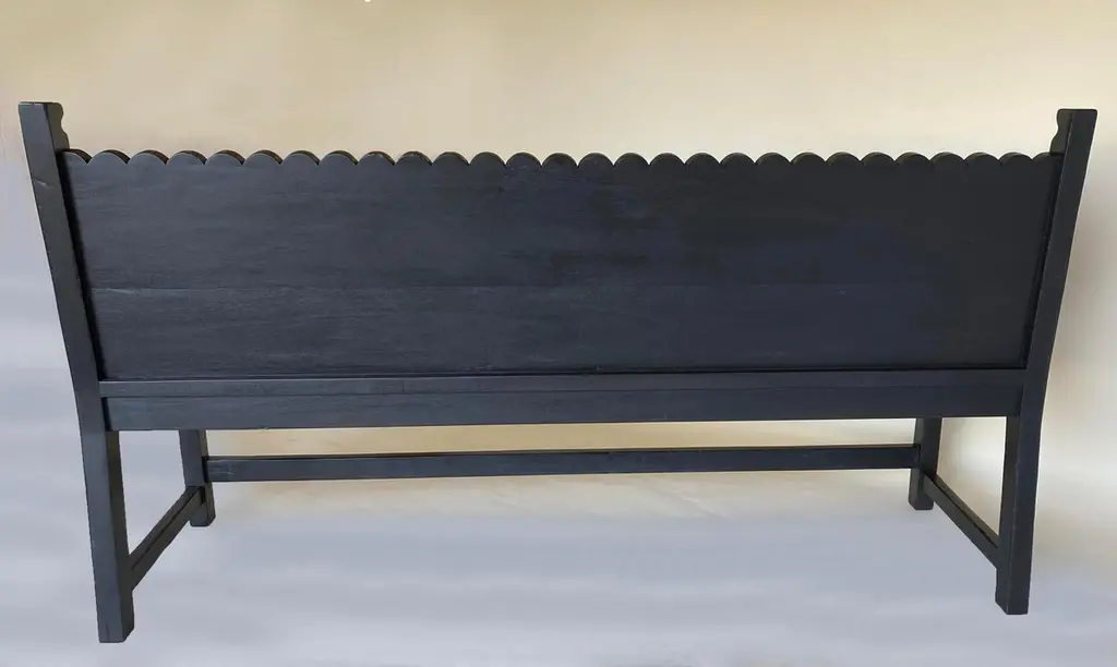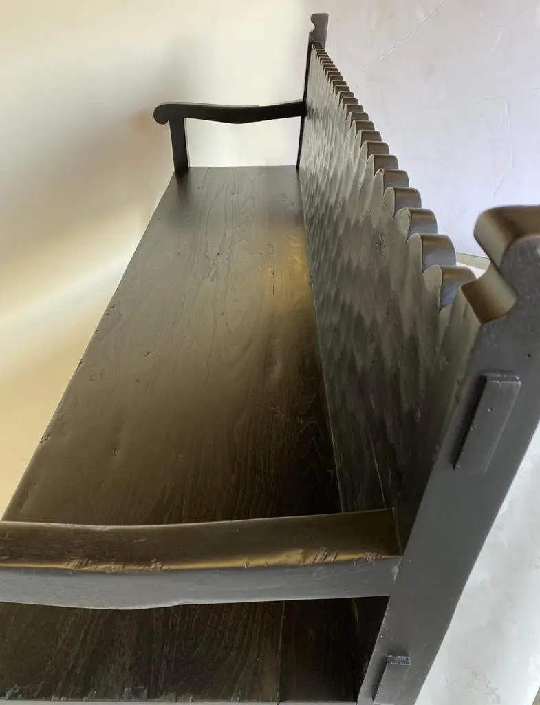 Custom bench with scalloped back shown here in Walnut. This can be done in any size and Walnut or Oak in any finish, please see attached sample board. Shown here with a hand hewn back, this is optional. As shown in ebony finish with a medium distress. Made in Los Angeles by Dos Gallos Studio.CUSTOM PRICES ARE SUBJECT TO CHANGE. PLEASE INQUIRE BEFORE ORDERING. ALL CUSTOM ORDERS ARE NON RETURNABLE. FINAL SALE