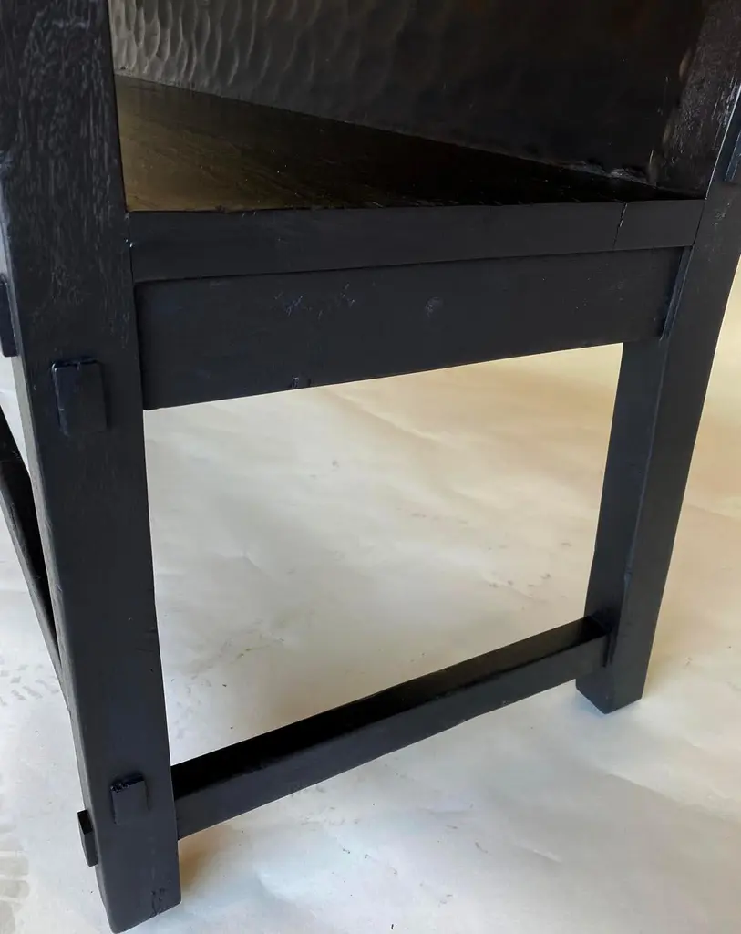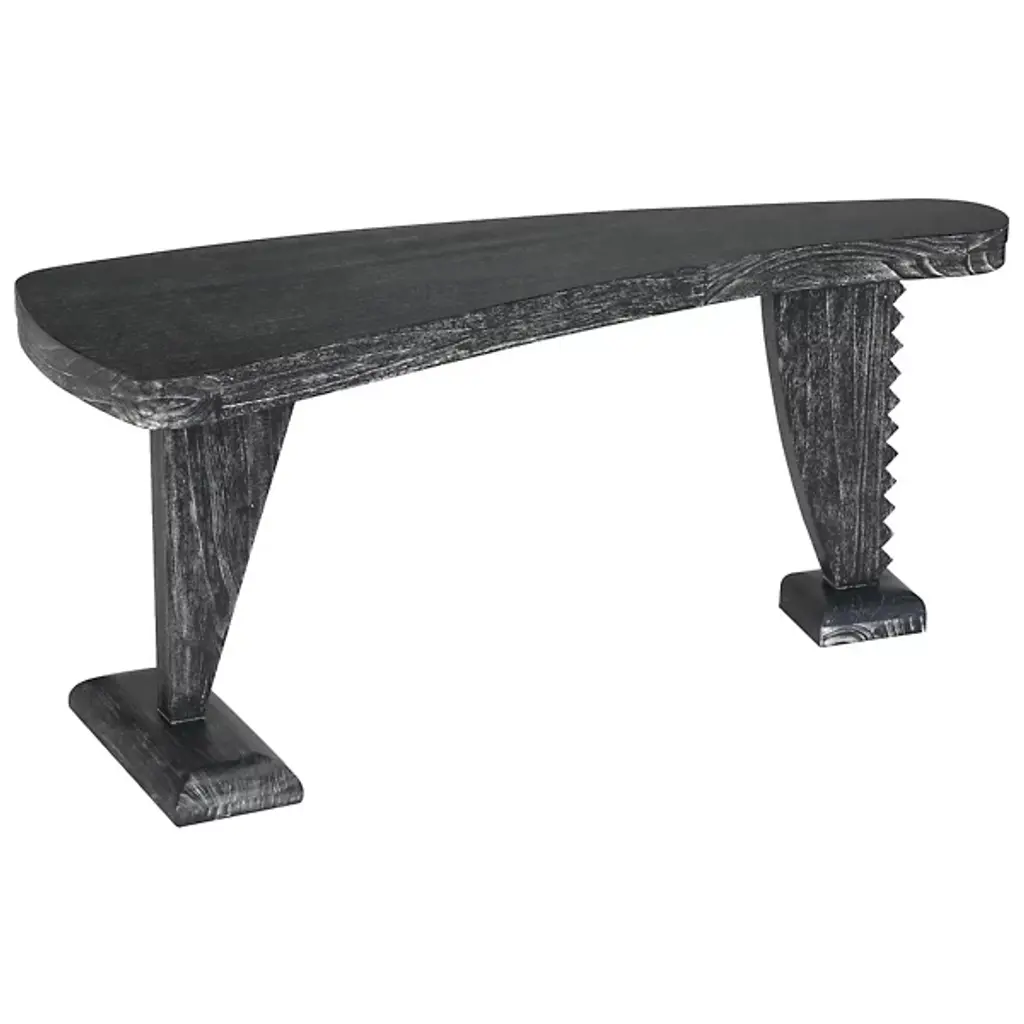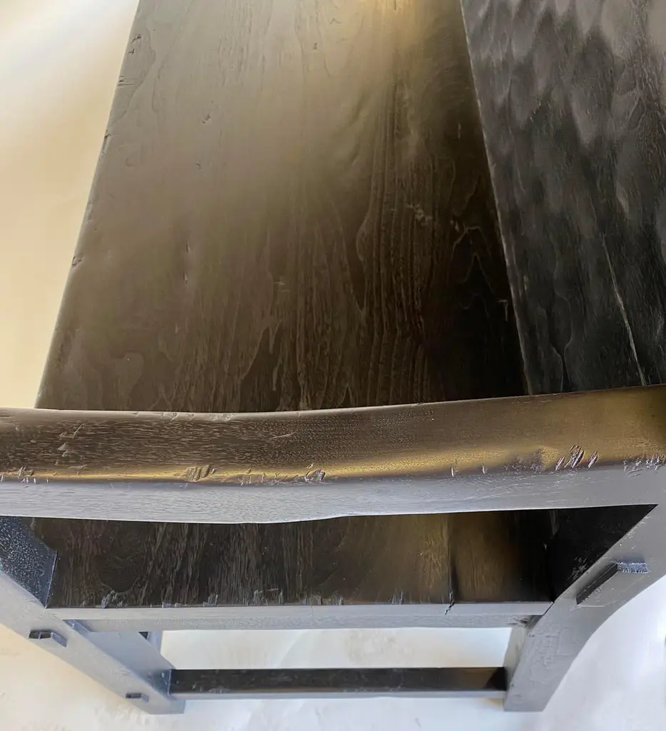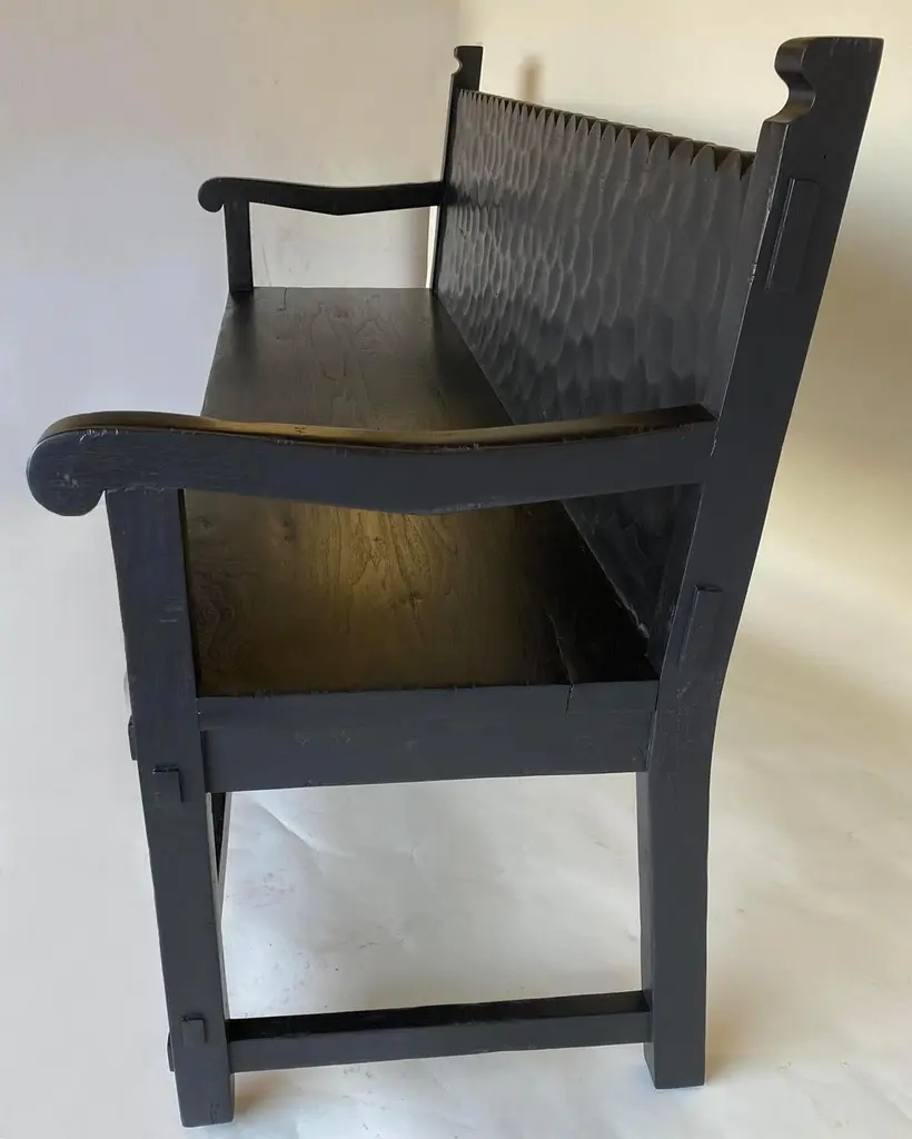 Custom bench with scalloped back shown here in Walnut. This can be done in any size and Walnut or Oak in any finish, please see attached sample board. Shown here with a hand hewn back, this is optional. As shown in ebony finish with a medium distress. Made in Los Angeles by Dos Gallos Studio.CUSTOM PRICES ARE SUBJECT TO CHANGE. PLEASE INQUIRE BEFORE ORDERING. ALL CUSTOM ORDERS ARE NON RETURNABLE. FINAL SALE