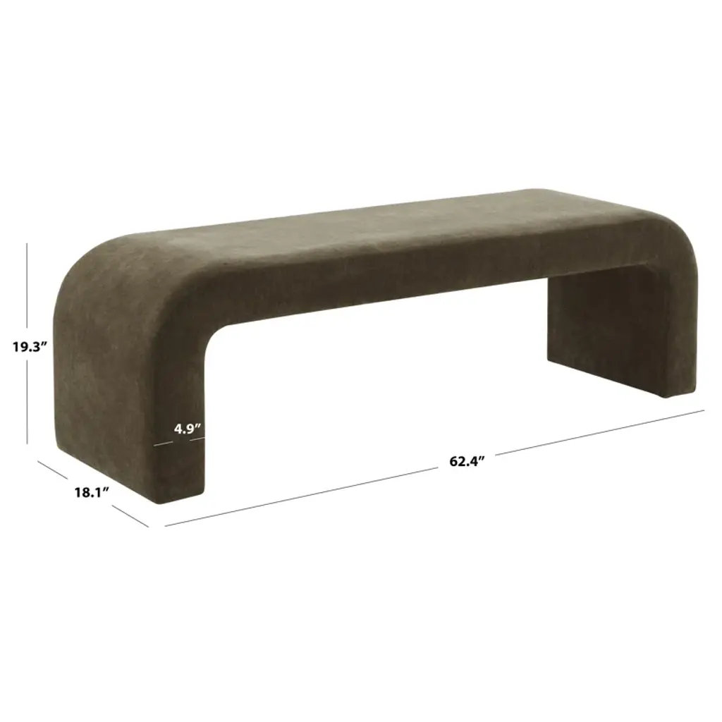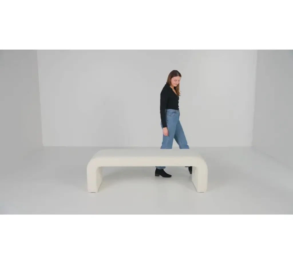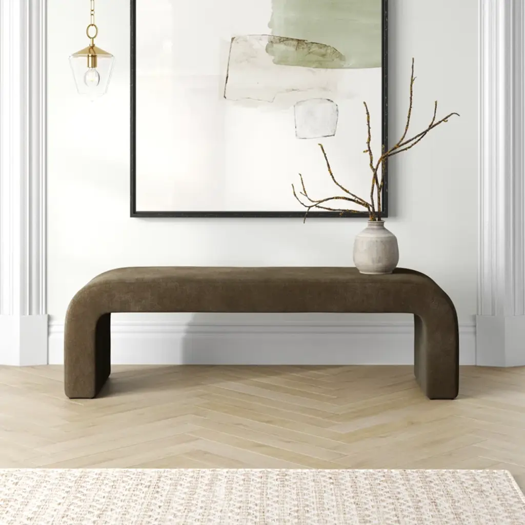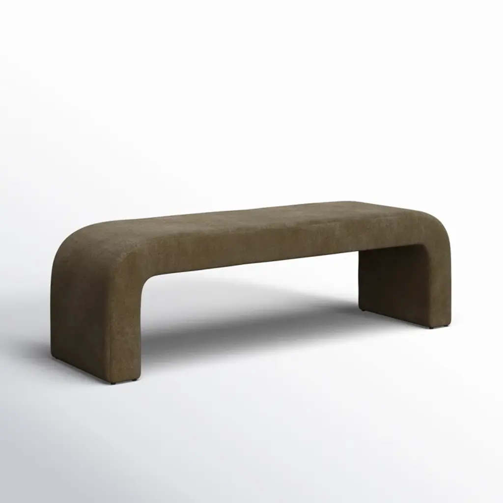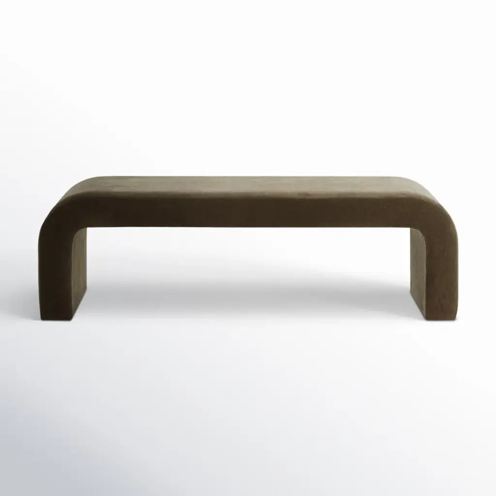 A sleek fusion of modern design and sculptural form, this handmade bench adds a refined edge to any space. The contoured silhouette and softly rounded corners introduce movement and depth, creating visual interest from every angle. Wrapped in luxuriously soft upholstery, the bench invites you to relax comfortably. Whether positioned at the foot of a bed, styled in an entryway, or placed along a hallway, this standout piece elevates your space with quiet sophistication.