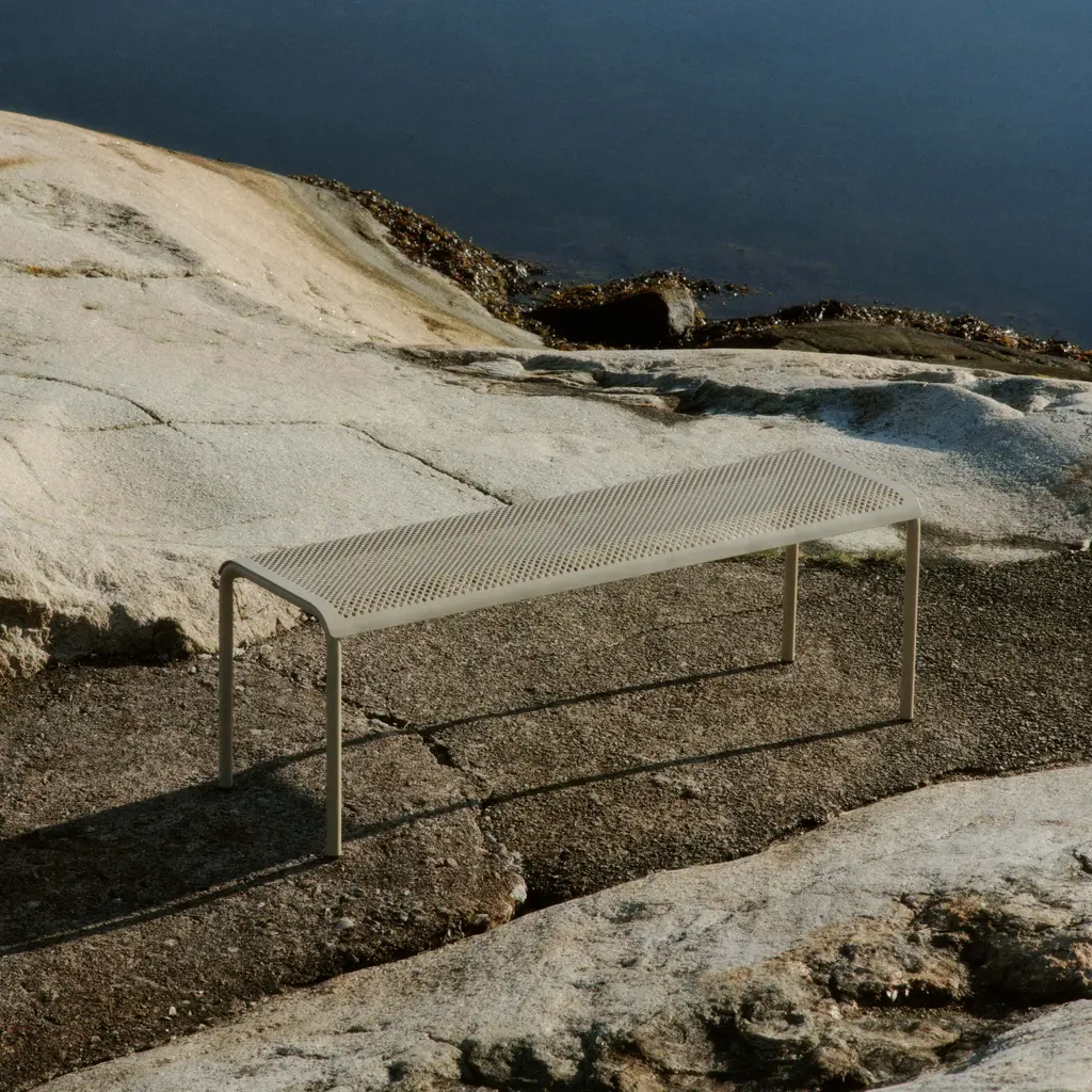 Experience the peaceful allure of nature with the Dapple Outdoor Bench from Ferm Living. Crafted from powder coated galvanized steel, this bench boasts durability and an elegant aesthetic. Its airy, lightweight design and unique perforated pattern make it a practical and stylish addition to any outdoor space. Highlights