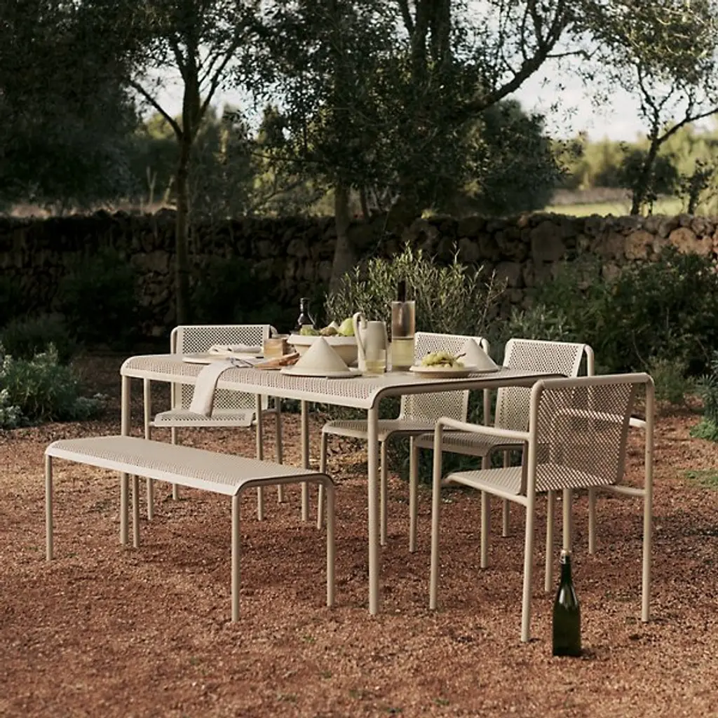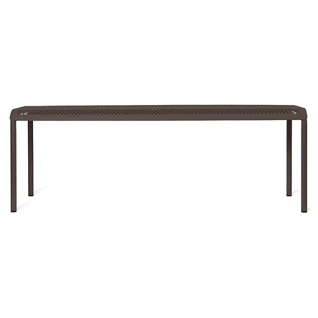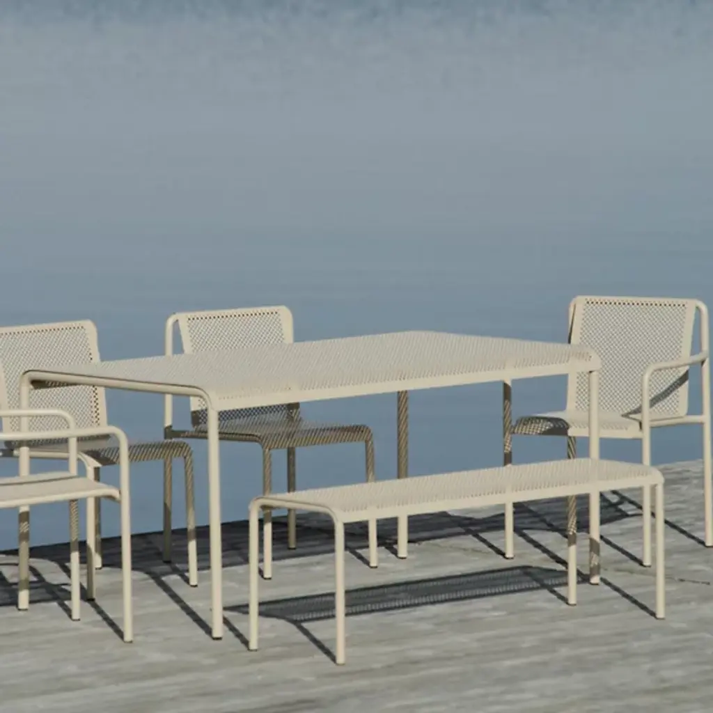 The Dapple Outdoor Bench from Ferm Living adds a mix of clean contemporary surfaces accented by Scandinavian minimalism. Inspired by sunlight piercing a canopy of leaves, this strong, stately piece is crafted from electro-galvanized steel. It features a perforated seat elevated by an inverted U-shaped bracket with two legs on each side. The finish and form stand up to rough weather, while the perforations prevent moisture from pooling, bringing a practical and stylish edge to outside gathering spaces.