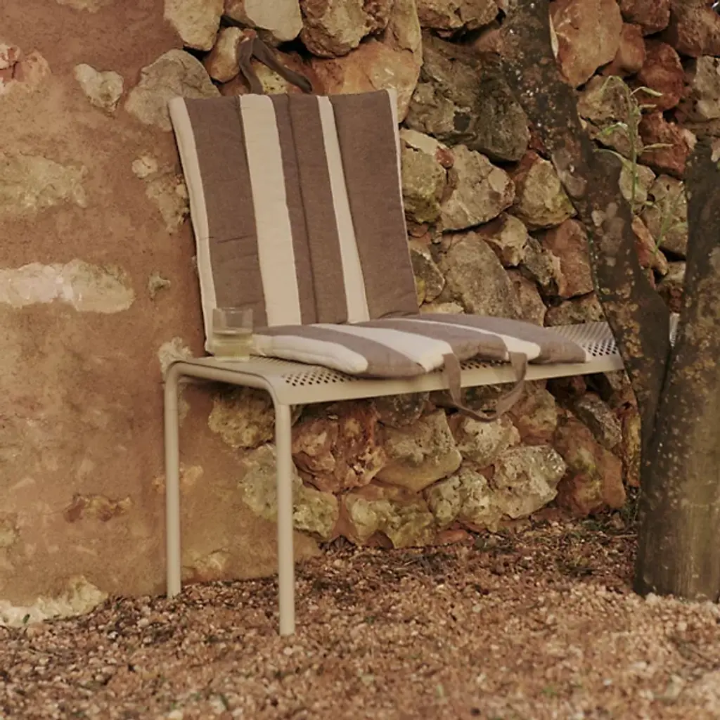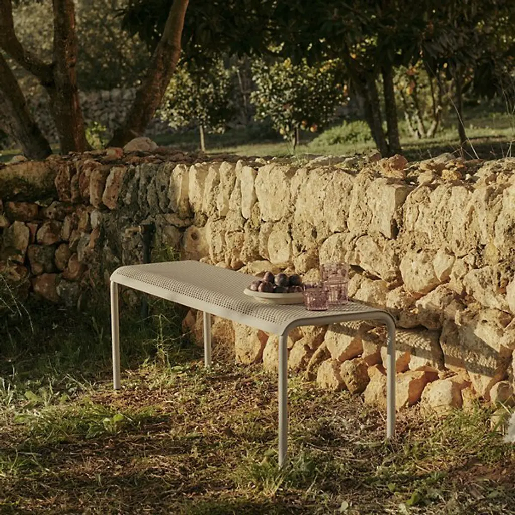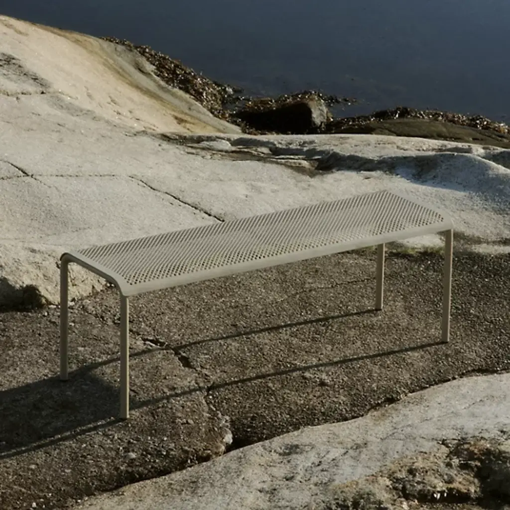 The Dapple Outdoor Bench from Ferm Living adds a mix of clean contemporary surfaces accented by Scandinavian minimalism. Inspired by sunlight piercing a canopy of leaves, this strong, stately piece is crafted from electro-galvanized steel. It features a perforated seat elevated by an inverted U-shaped bracket with two legs on each side. The finish and form stand up to rough weather, while the perforations prevent moisture from pooling, bringing a practical and stylish edge to outside gathering spaces.