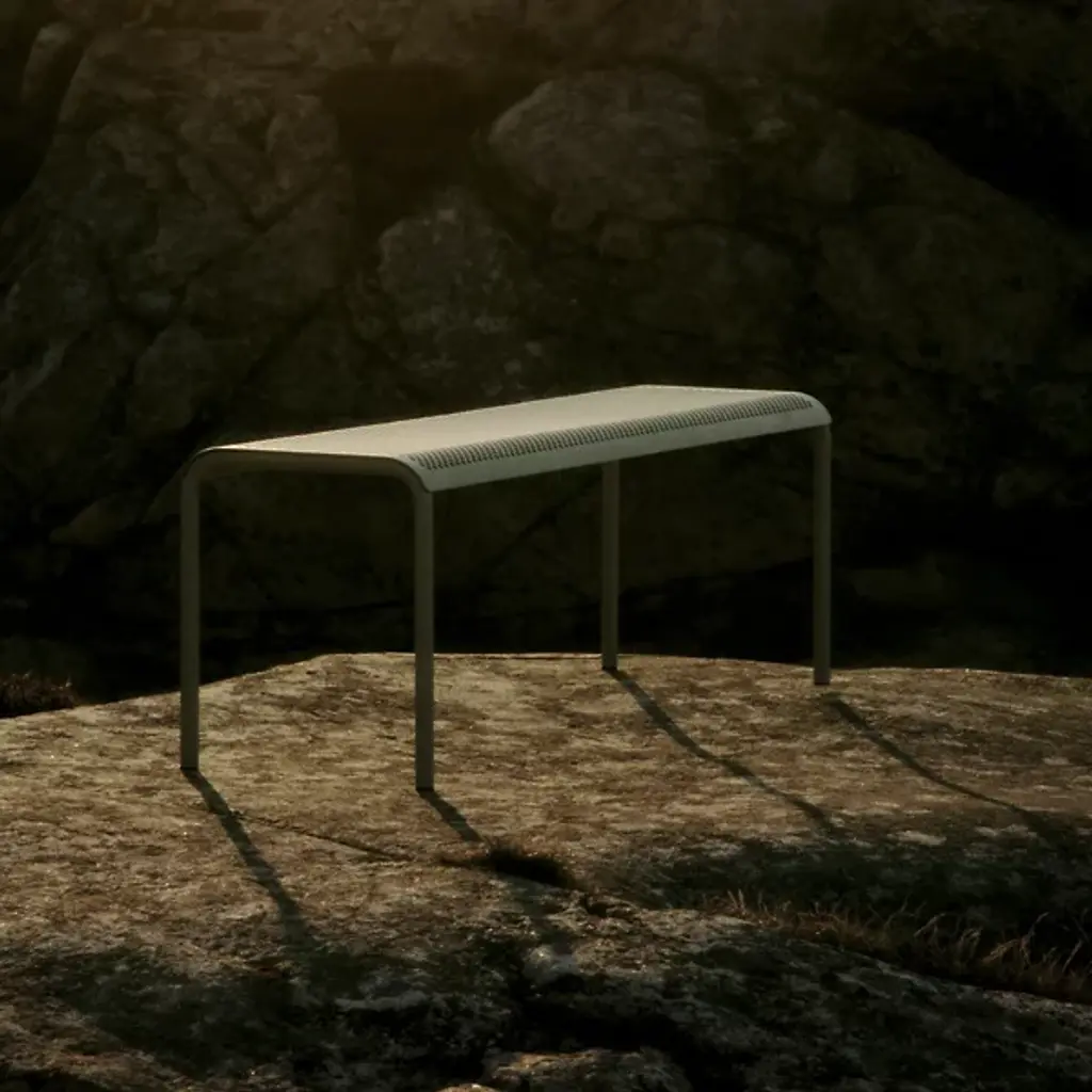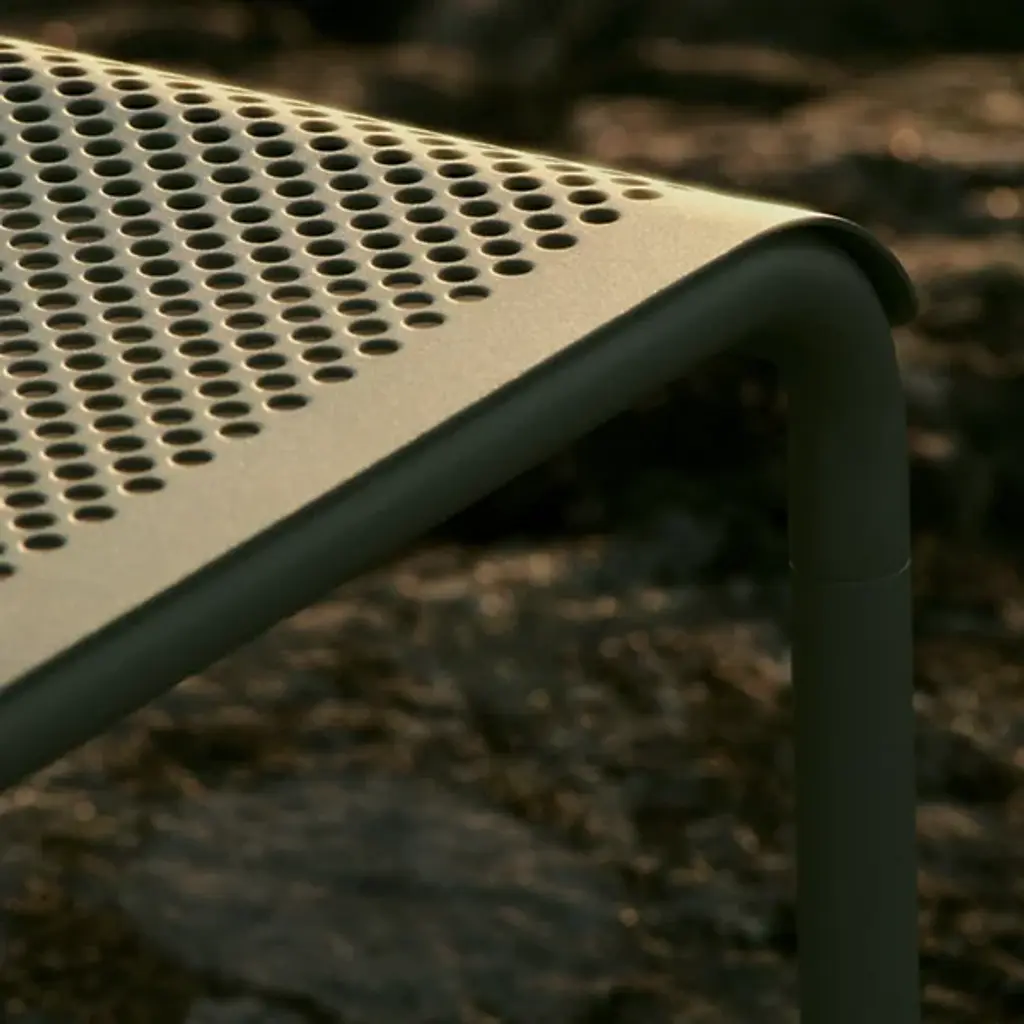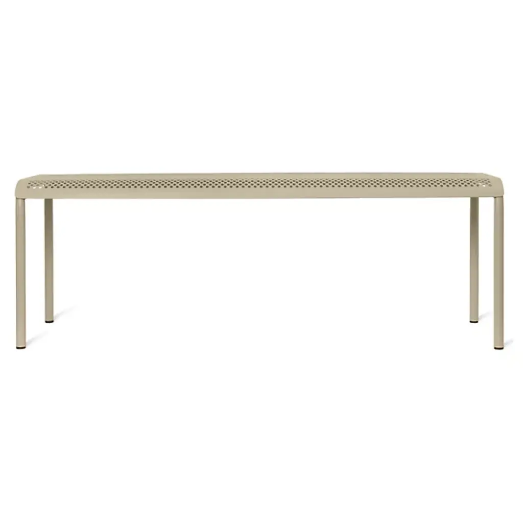 The Dapple Outdoor Bench from Ferm Living adds a mix of clean contemporary surfaces accented by Scandinavian minimalism. Inspired by sunlight piercing a canopy of leaves, this strong, stately piece is crafted from electro-galvanized steel. It features a perforated seat elevated by an inverted U-shaped bracket with two legs on each side. The finish and form stand up to rough weather, while the perforations prevent moisture from pooling, bringing a practical and stylish edge to outside gathering spaces.