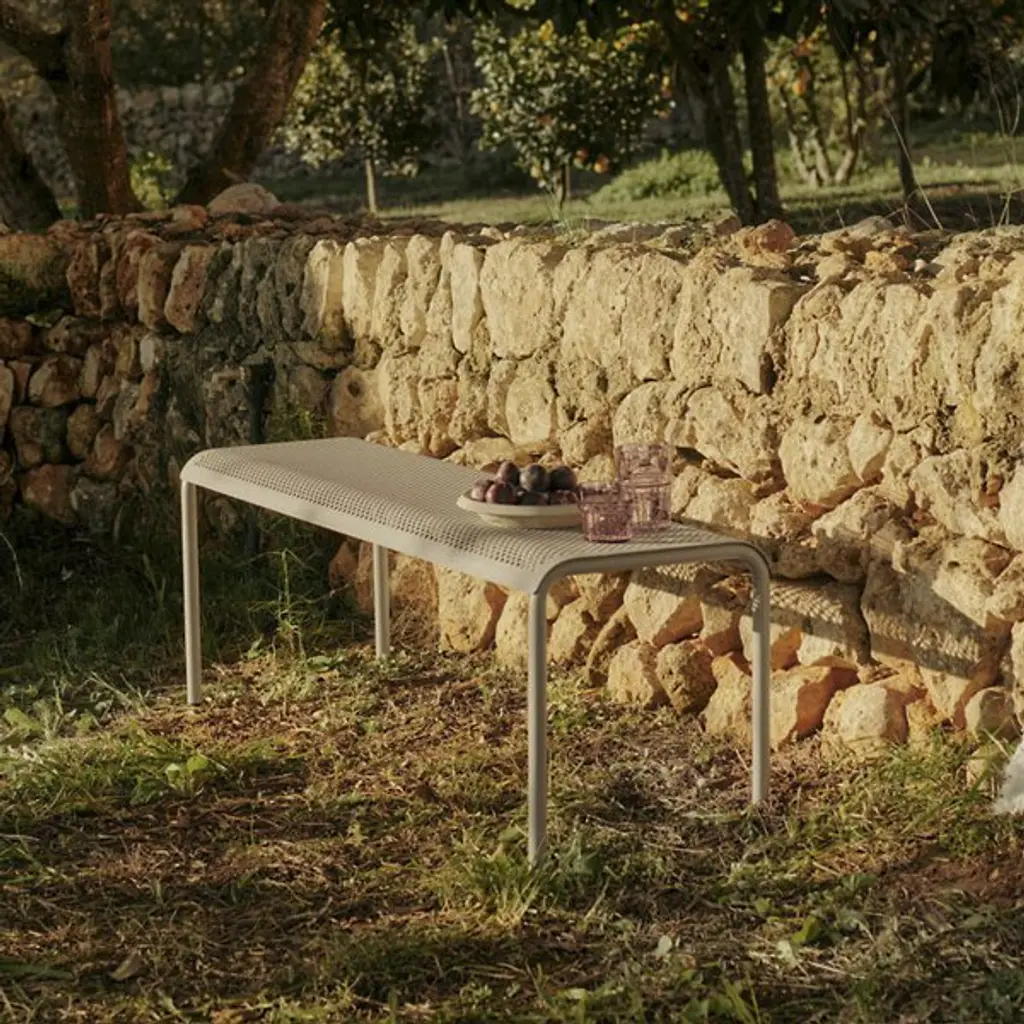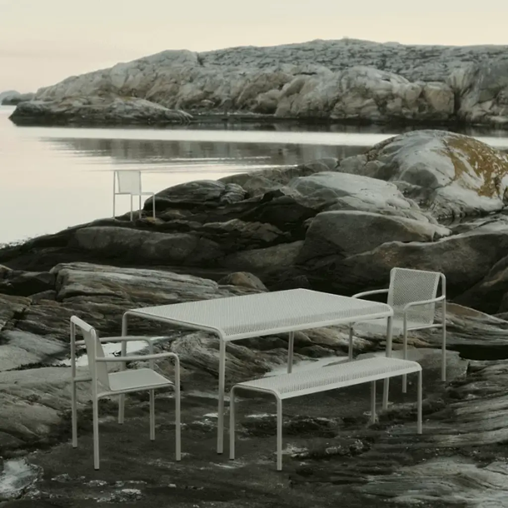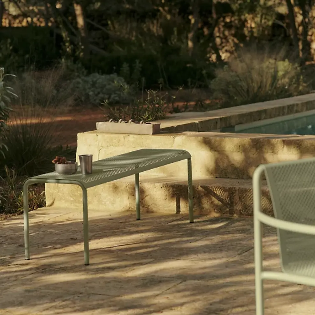 The Dapple Outdoor Bench from Ferm Living adds a mix of clean contemporary surfaces accented by Scandinavian minimalism. Inspired by sunlight piercing a canopy of leaves, this strong, stately piece is crafted from electro-galvanized steel. It features a perforated seat elevated by an inverted U-shaped bracket with two legs on each side. The finish and form stand up to rough weather, while the perforations prevent moisture from pooling, bringing a practical and stylish edge to outside gathering spaces.