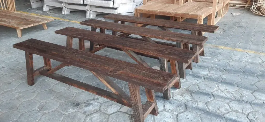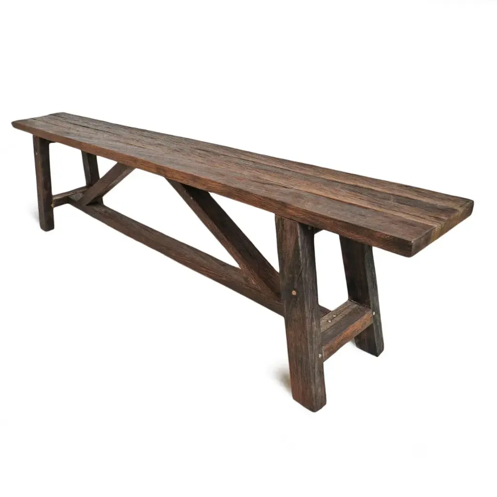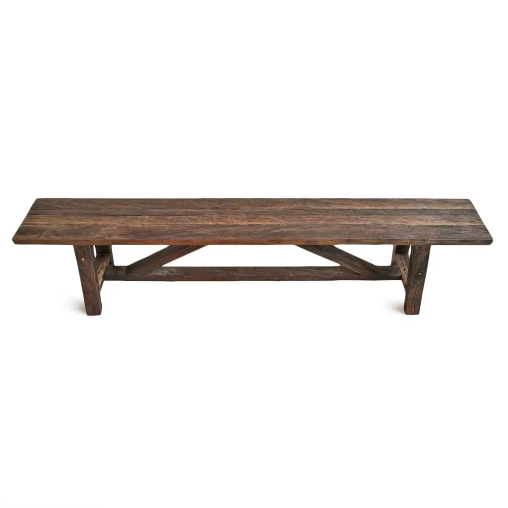 Dark stained salvaged teak wood bench. Great for outdoor or indoor use. Each will vary in exact tones, grain, and natural imperfections and each is sold individually. When left exposed to outdoor elements, teak will naturally age/weather over time to lighter patina.