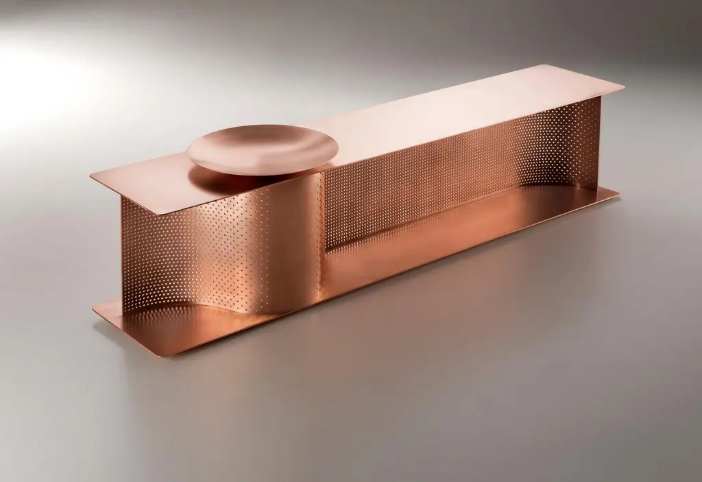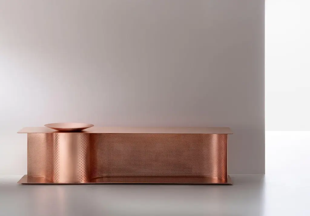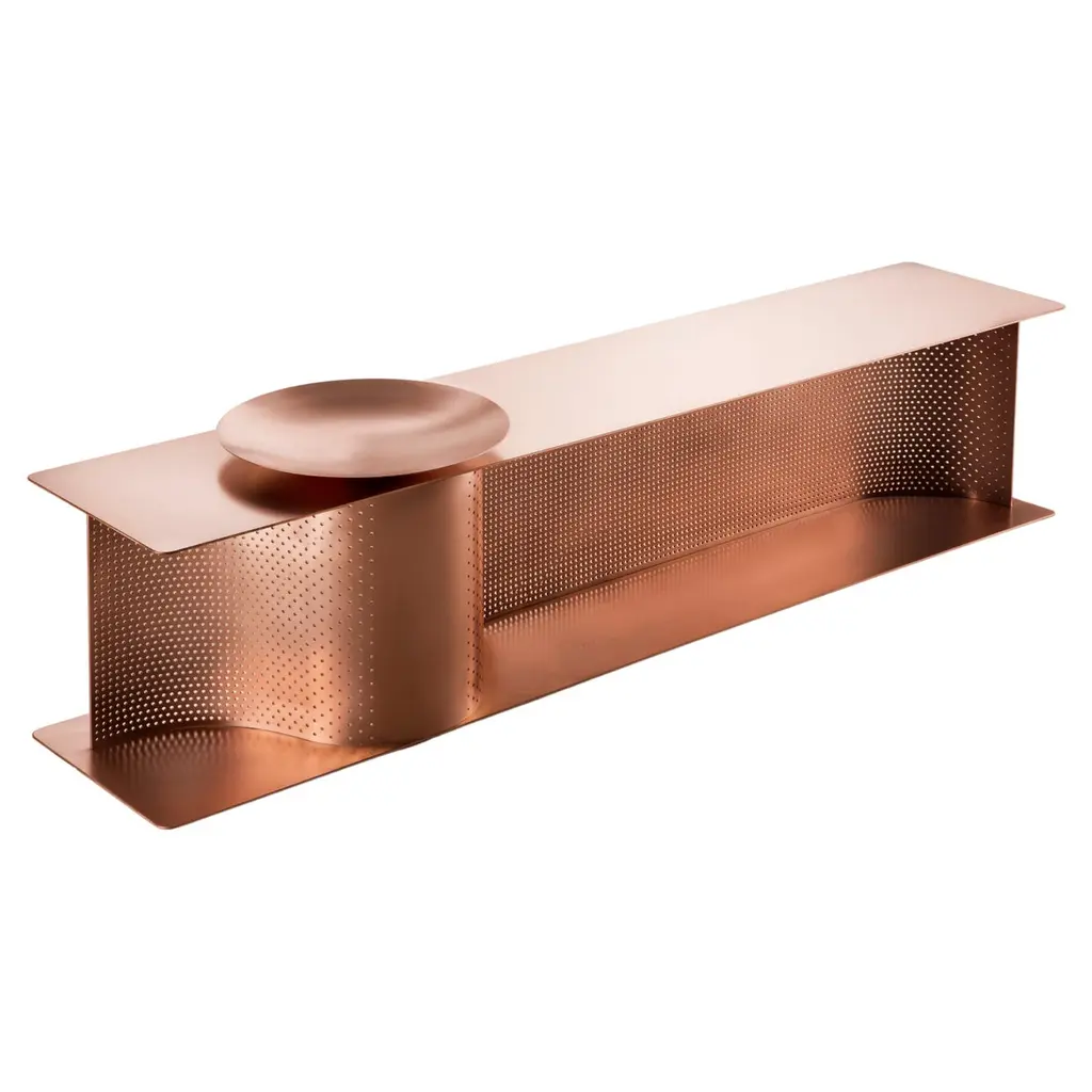 Wave Bench designed by Lanzavecchia+Wai for DeCastelli entirely made up of copper with 4mm thickness. The presence of an empty-pockets bowl creates a decorative perforated pattern. The finishing of this model is not lacquered by a protective transparent varnish. So that the copper maintains its antibacterial properties and shows different shades for different oxidations. The original state can be returned by soft manual brushing and cleaning. The structure serves this piece in two ways: a bench and a storage space. The upper portion provides a space for perfect seating while the base portion provides storage space for placing shoes, bags, etc. DIMENSIONS:W. 170 x D. 35 x H. 41 cmW. 66.93 x D. 13.77 x H. 16.14 in