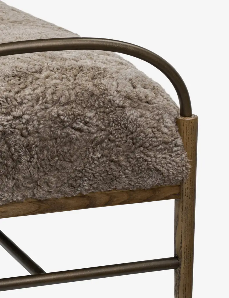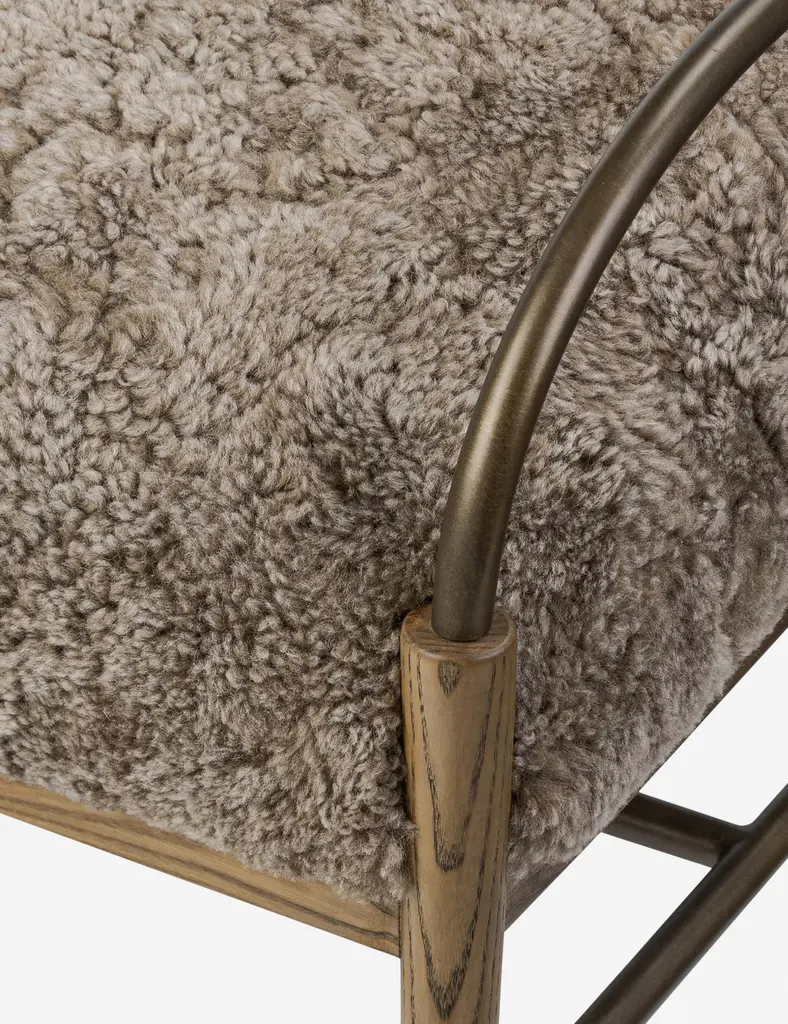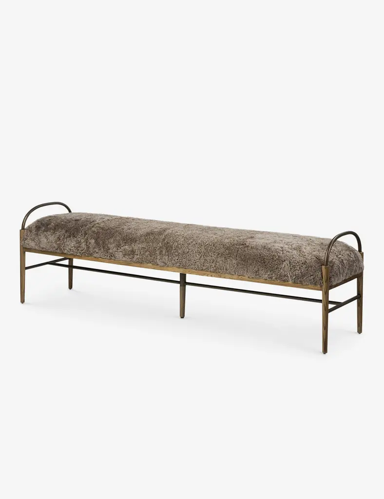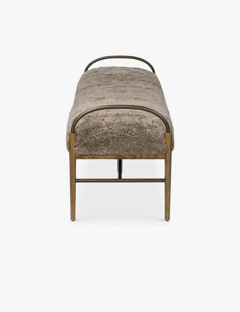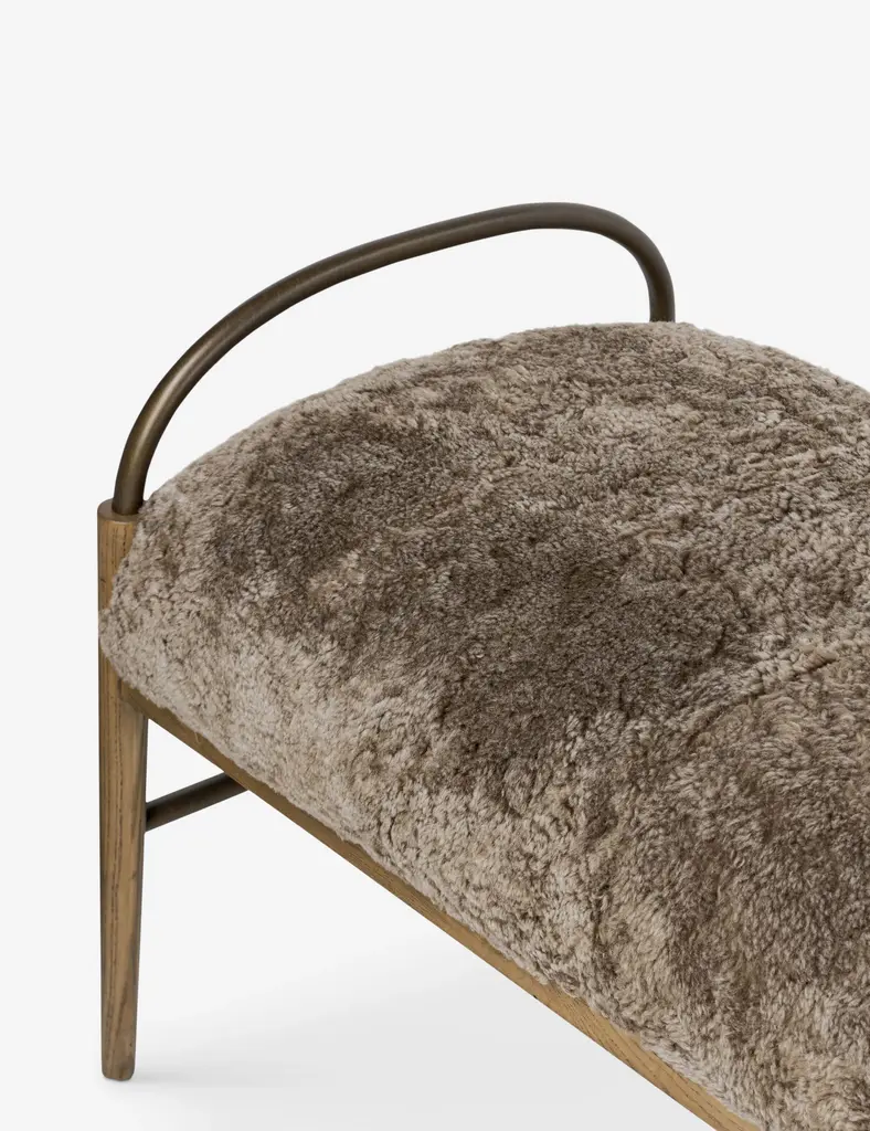 Four Hands brings their exceptional craftsmanship to a timeless collection rooted in Amber Lewis' perennial California style. Thick shearling-style upholstery adds a fresh look to this modern accent bench. A mix of wood and brass finish framing adds rich dimension in a foyer or living room.