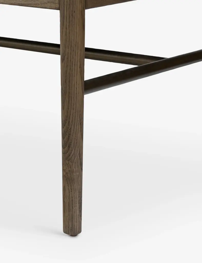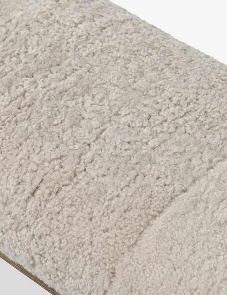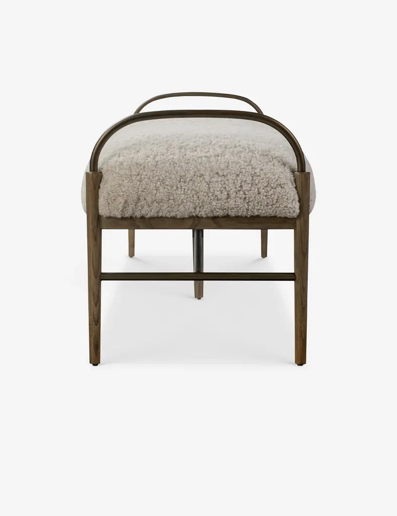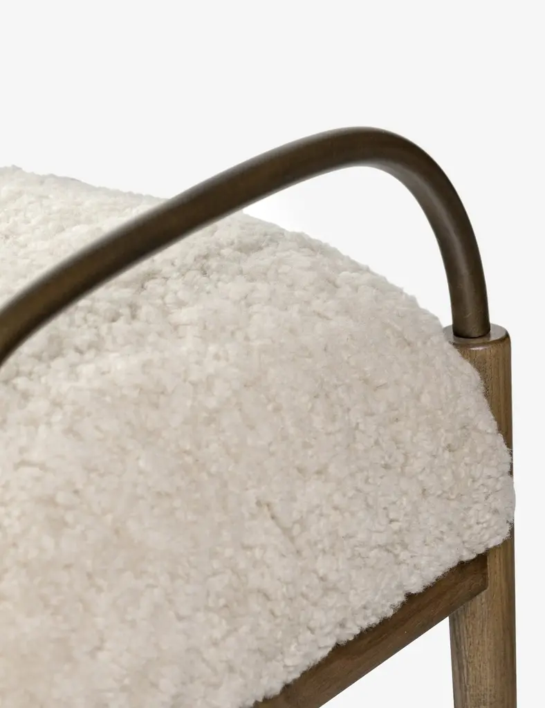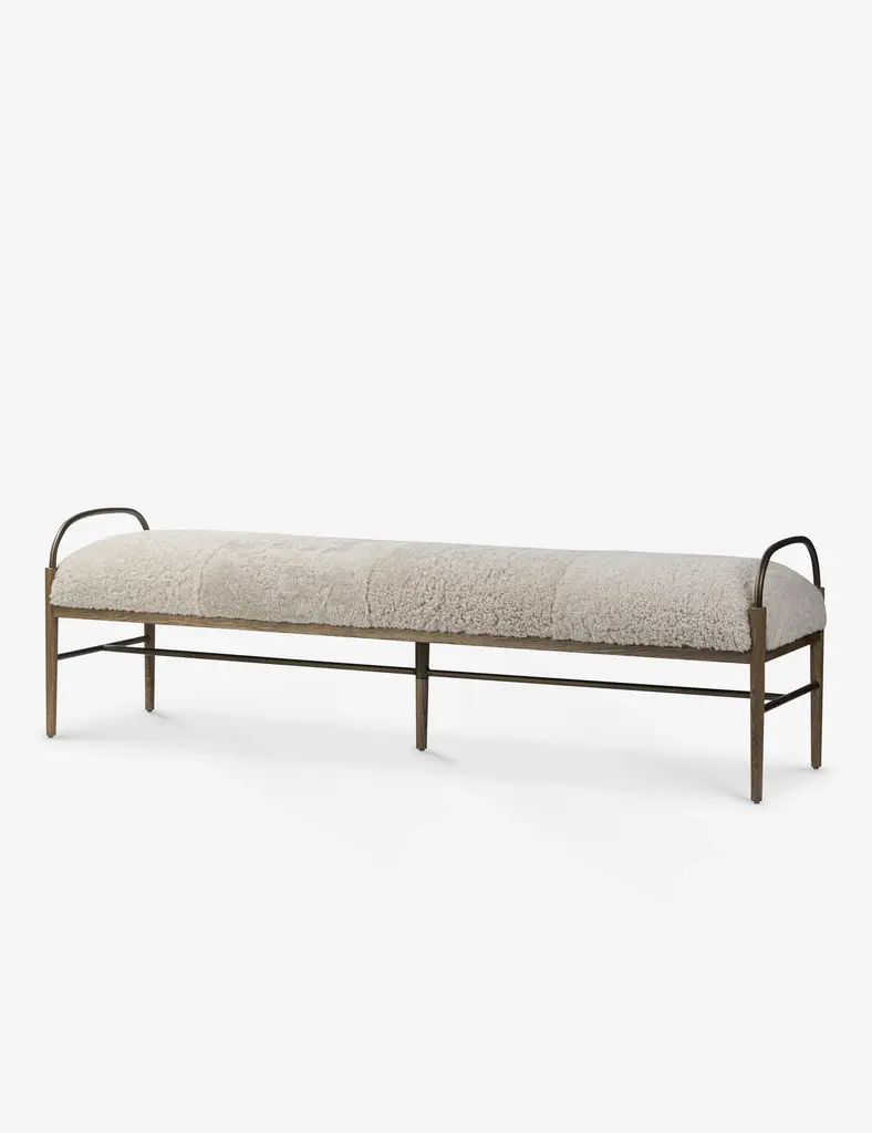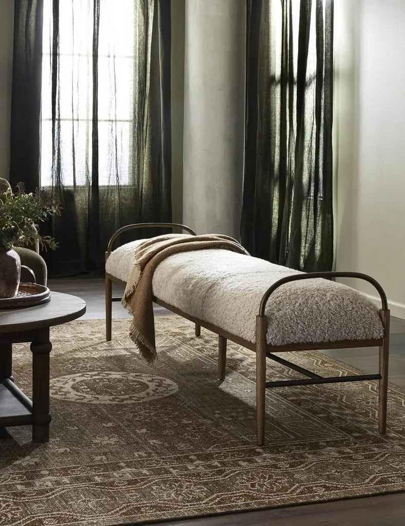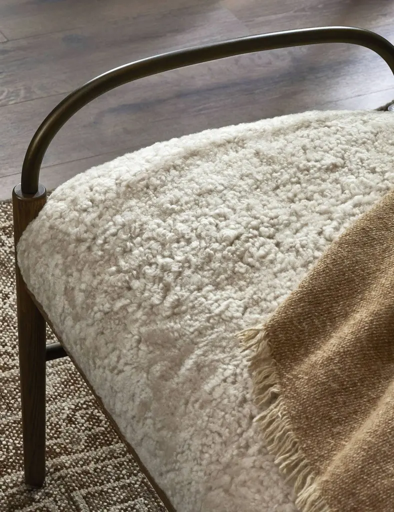 Four Hands brings their exceptional craftsmanship to a timeless collection rooted in Amber Lewis' perennial California style. Thick shearling-style upholstery adds a fresh look to this modern accent bench. A mix of wood and brass finish framing adds rich dimension in a foyer or living room.