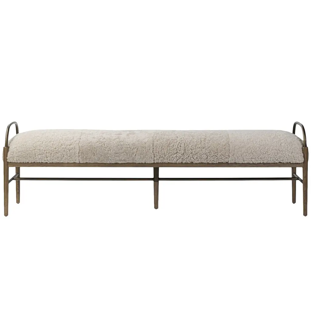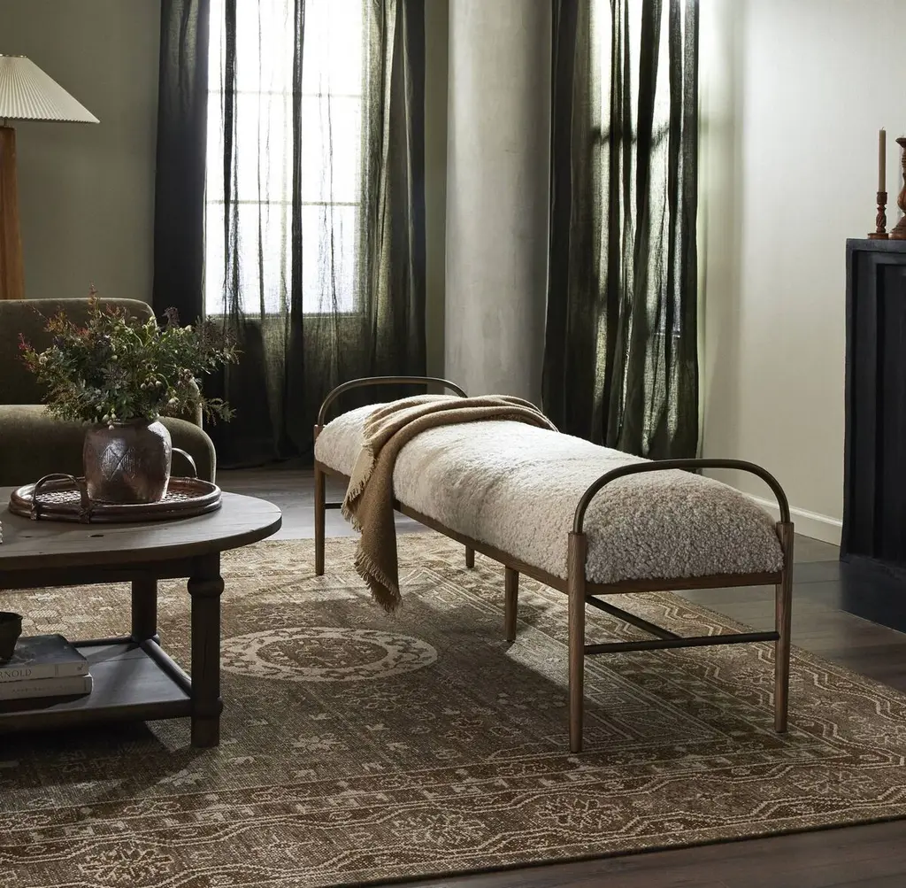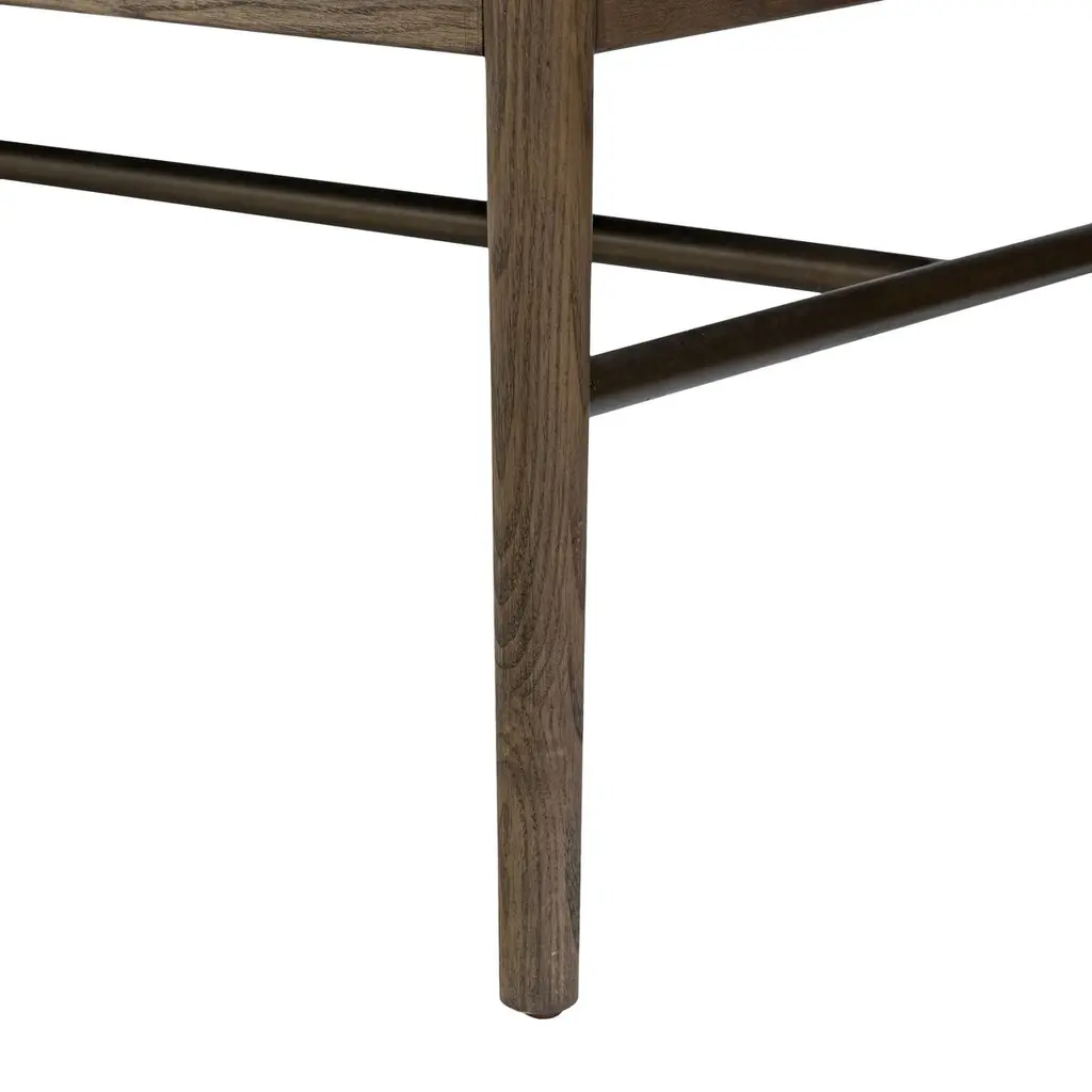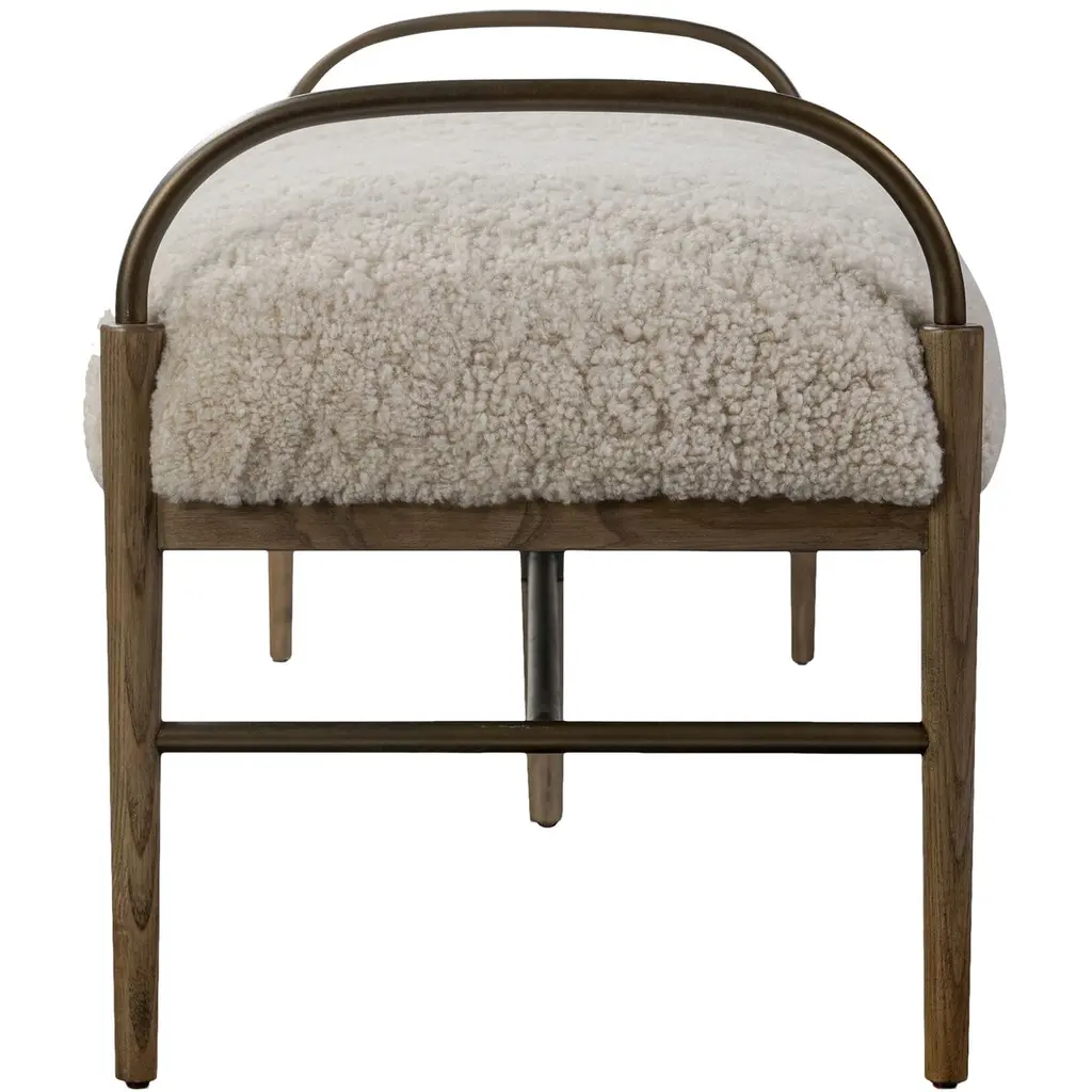 Curved brushed iron arms and an H-shaped stretcher pair with amber ash legs for a distinct material blend. Soft, tactile contrast provides a warm, inviting feel.