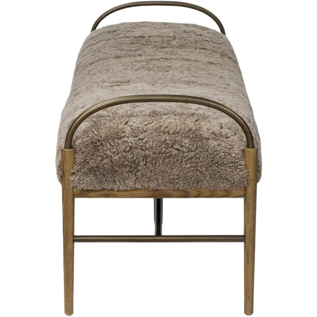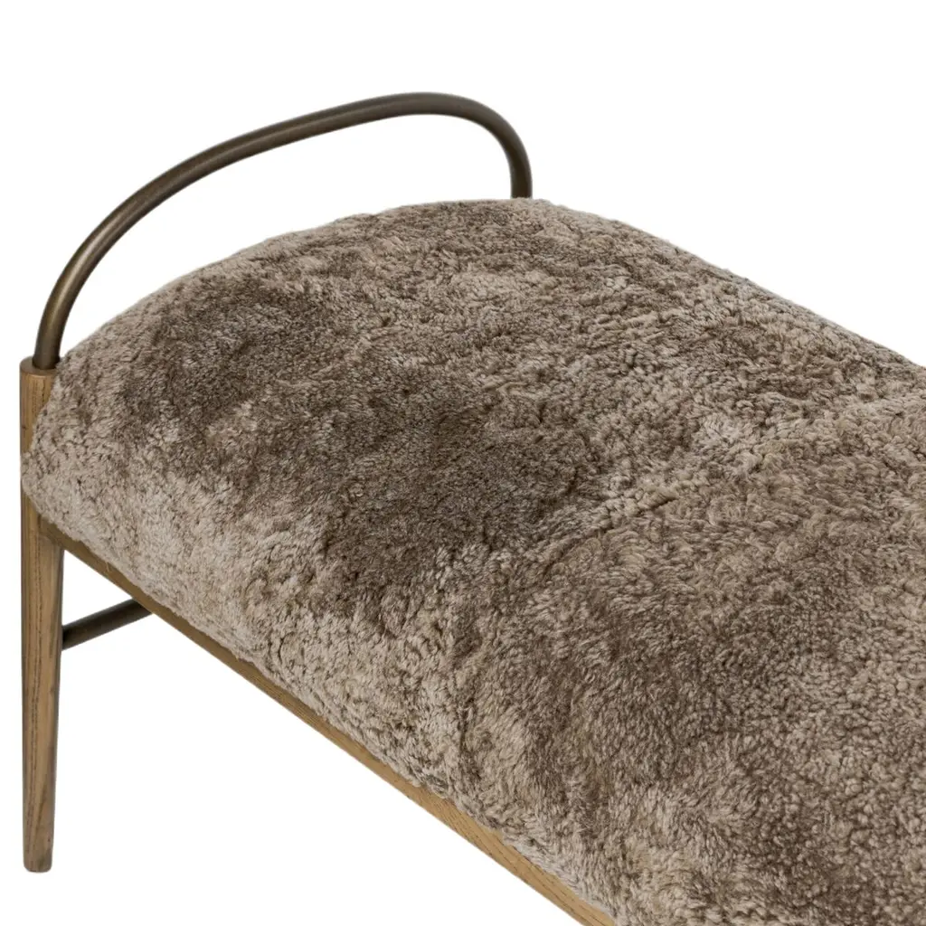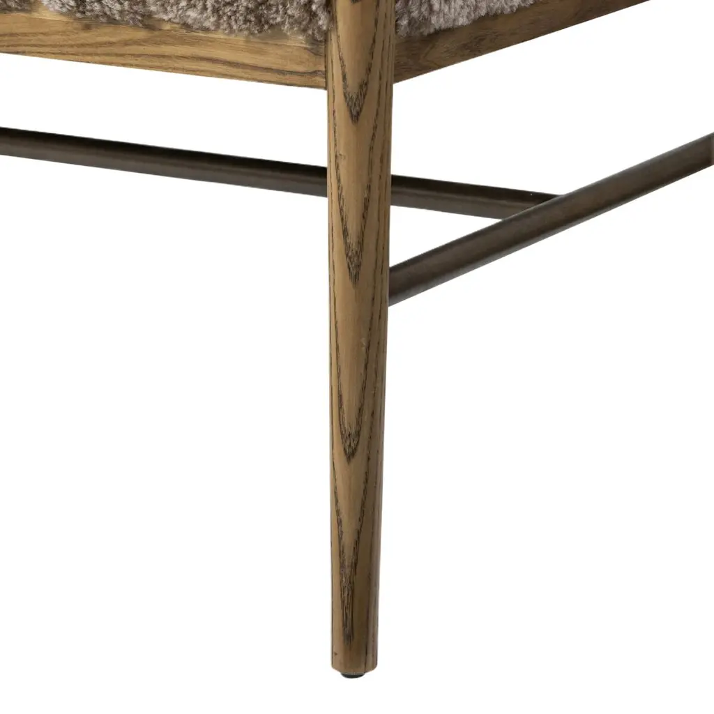 Curved brushed iron arms and an H-shaped stretcher pair with amber ash legs for a distinct material blend. Soft, tactile contrast provides a warm, inviting feel.