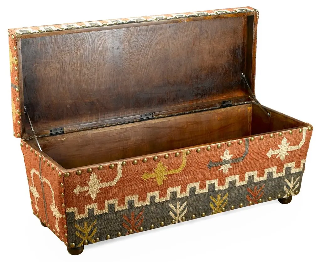 Upholstered in cotton kilim-inspired fabric, this handcrafted bench has a frame made of durable, eco-friendly mango wood trimmed with brass nail heads. Generous foam fill provides long-lasting comfort.
