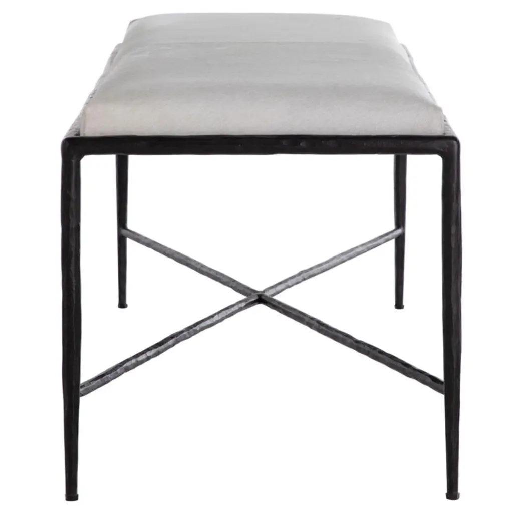 Devoe Industrial White Upholstered Hair On Hide Seat Gunmetal Bronze Iron Bench
