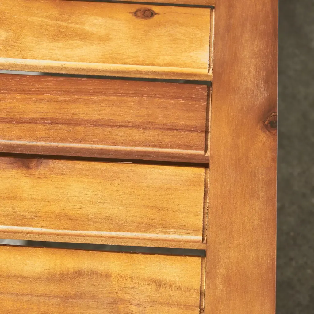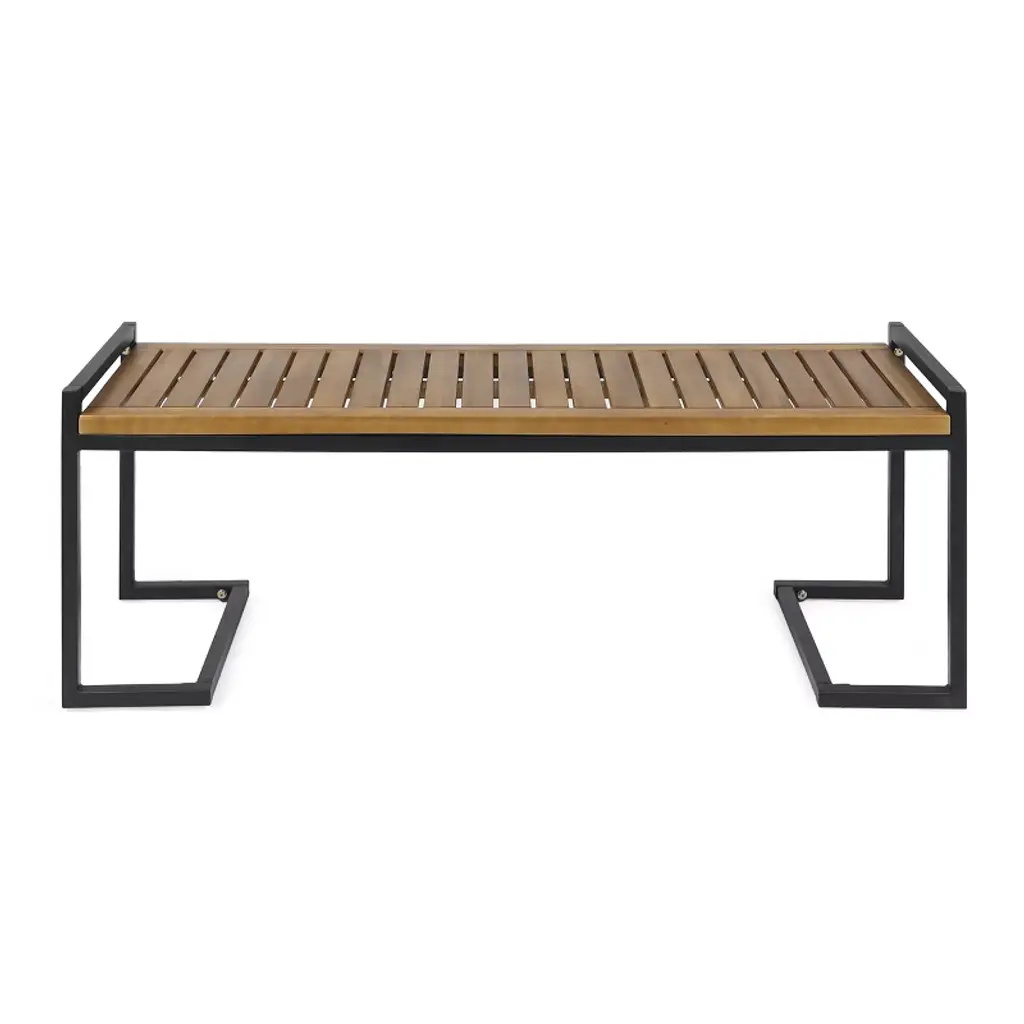 Cantilever iron legs give this piece's slatted, acacia wood seating surface the support necessary to give you and yours a chic place to sit time and time again.