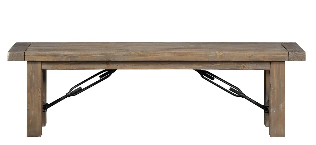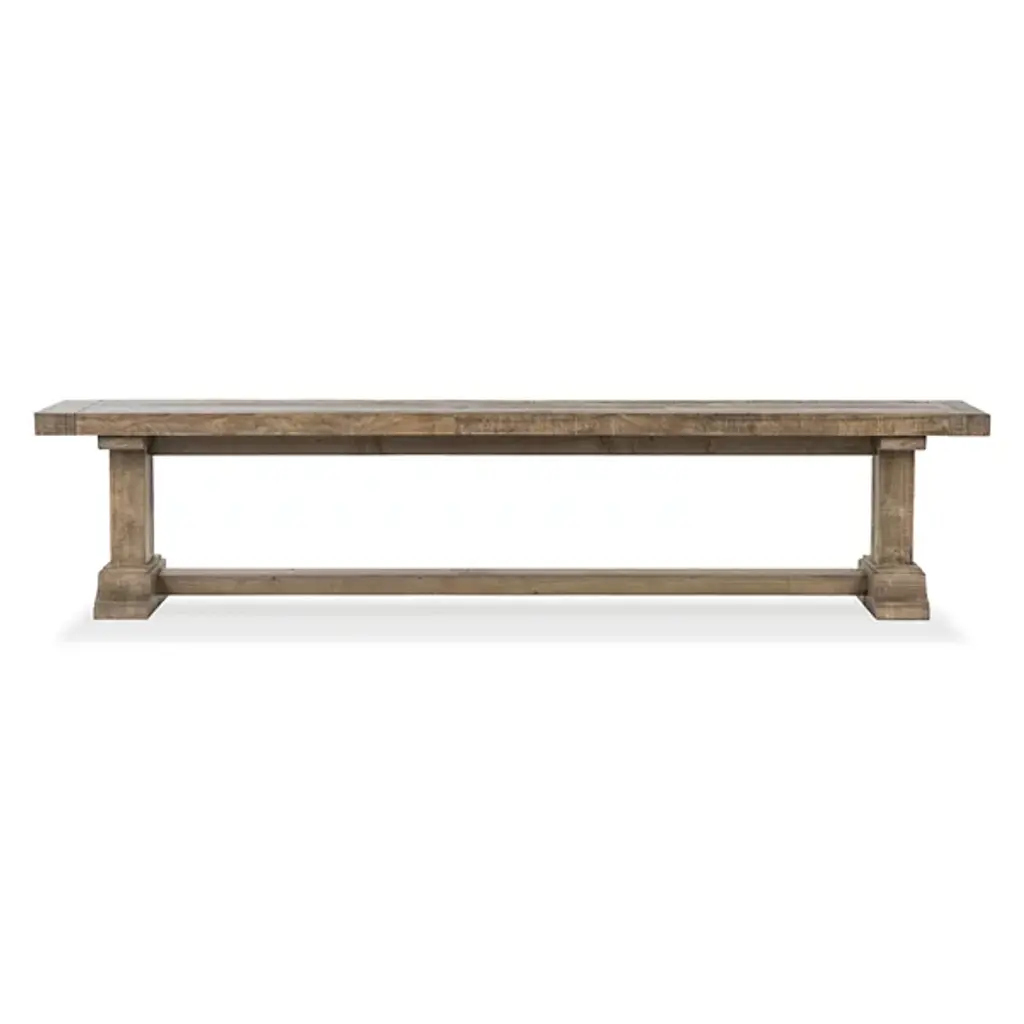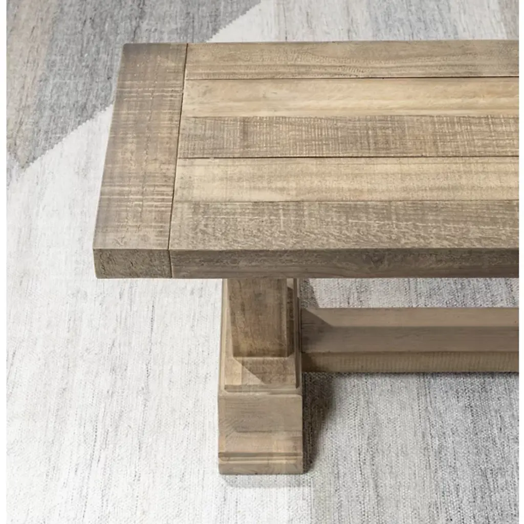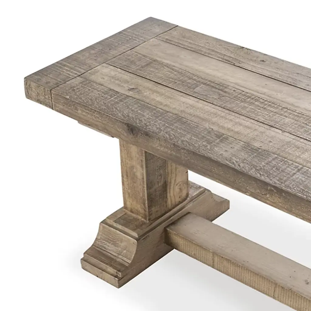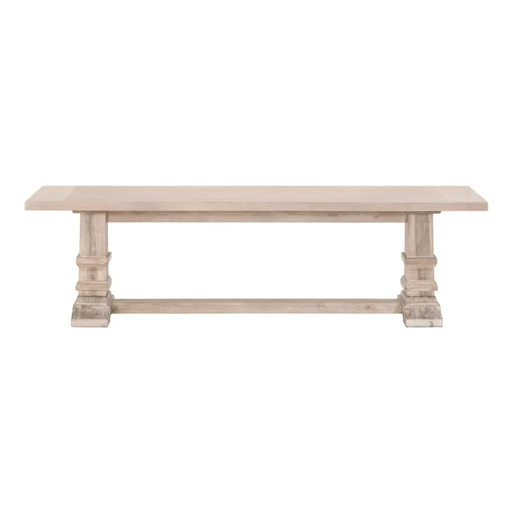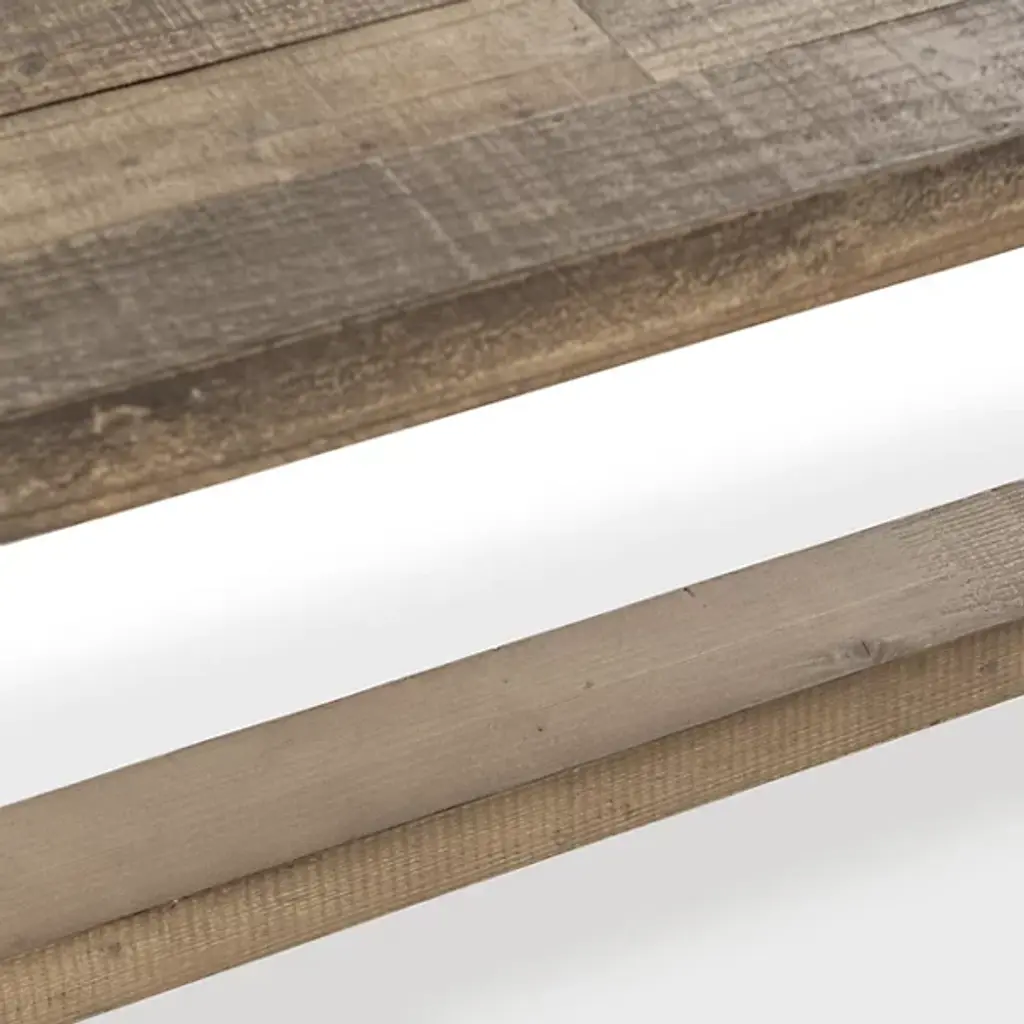 The Dita Bench from Classic Home features a plank-style seat crafted from reclaimed pine, displaying authentic weathering and character marks from its previous use. This sustainable approach preserves natural imperfections that cannot be replicated in new materials. The pedestal base provides stable support for two people while maintaining the piece's rustic appeal. Each bench undergoes hand-finishing that smooths the surface while preserving the wood's organic texture, creating a unique piece that continues to develop character over time.
