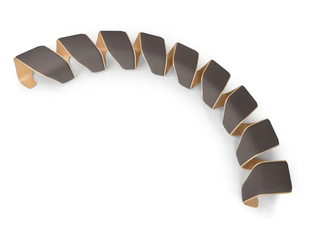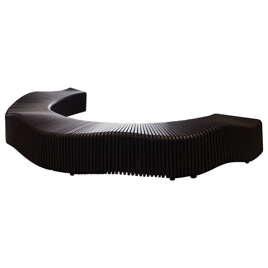 Inspired by the dynamic forms of biogenetics, the DNA modular bench consists of a single element of curved wood plywood, assembled specularly. The result is an appealing piece of furniture with a particular helix shape, each step of which corresponds to a seat suitably separated from the others. DNA is also available in a version upholstered in leather or fabric. Thanks to its adaptability and sturdy craftsmanship, DNA is the perfect addition for hospitality settings like lobbies, lounges and guestrooms. Multilayer beechwood structure, 18 mm thick, finished with oak wood or wengè. Connection system of each element by lasercut steel link. DNA bench is available also in a special edition where the front and top part of the bench are completely padded and upholstered. (see color chart).