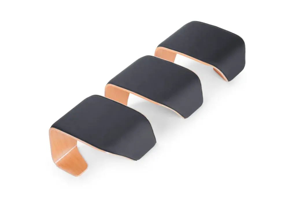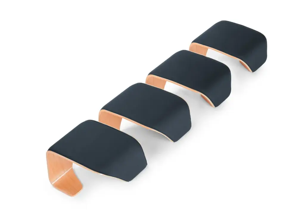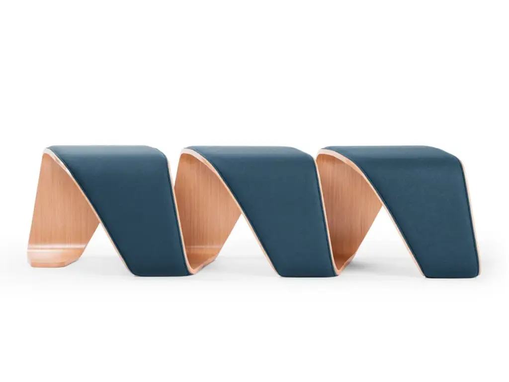 Inspired by the dynamic forms of biogenetics, the DNA modular bench consists of a single element of curved wood plywood, assembled specularly. The result is an appealing piece of furniture with a particular helix shape, each step of which corresponds to a seat suitably separated from the others. DNA is also available in a version upholstered in leather or fabric. Thanks to its adaptability and sturdy craftsmanship, DNA is the perfect addition for hospitality settings like lobbies, lounges and guestrooms. Multilayer beechwood structure, 18 mm thick, finished with oak wood or wengè. Connection system of each element by lasercut steel link. DNA bench is available also in a special edition where the front and top part of the bench are completely padded and upholstered. (see color chart).