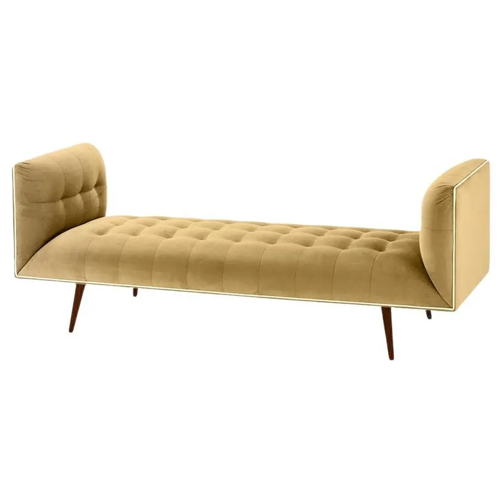 The Dust bench is constructed in solid wood, with an elevated tufted elegant look and a comfortable seating. Handmade with a solid wood base and wood legs. Polished brass metal feet detail is available as an option.The Dust bench is available in a number of different materials, finishes and combinations.wood finish and upholstery can be fully customized.COM available : upholstery 5 yards, piping 0.7 yards.Material:upholstery : velvet fabric, boucle fabric, COM.wood legs : solid wood base.Metal foot detail (on demand).Dimensions:Available in 2 sizessmall: 71” width x 28” dept x 28” height seat height 16”large: 79” width x 28”dept x 28” height seat height 16”Pictured in.Paris Mousse, smooth shell pipping, gold lacquered wood feet.
