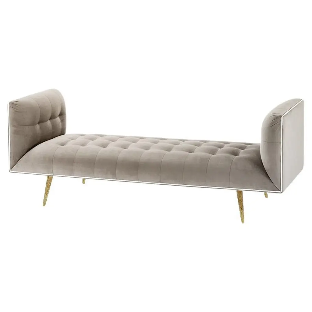 The Dust Bench is constructed in solid wood, with an elevated tufted elegant look and a comfortable seating. Handmade with a solid wood base and wood legs. Polished brass metal feet detail is available as an option.The Dust Bench is available in a number of different materials, finishes and combinations.Wood finish and upholstery can be fully customizedCOM Available : Upholstery 5 yards, piping 0.7 yardsMaterialUpholstery : Velvet Fabric, Boucle Fabric, COMWood legs : Solid Wood baseMetal foot detail (on demand)DimensionsAvailable in 2 sizesSmall: 71” W x 28”D x 28” H Seat height 16”Large: 79” W x 28”D x 28” H Seat height 16”Pictured inParis Mousse, Smooth Shell Pipping, Gold Lacquered Wood Feet
