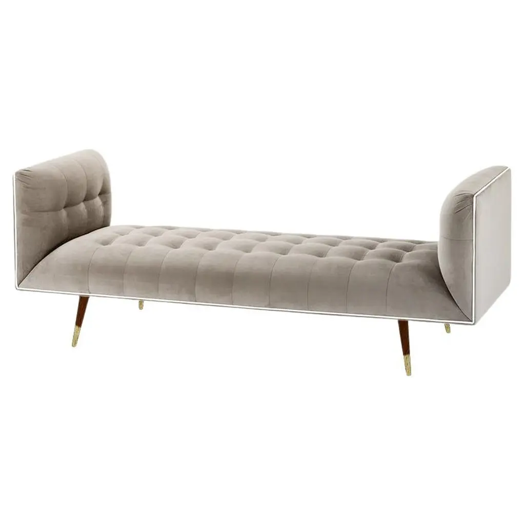 The Dust bench is constructed in solid wood, with an elevated tufted elegant look and a comfortable seating. Handmade with a solid wood base and wood legs. Polished brass metal feet detail is available as an option.The Dust Bench is available in a number of different materials, finishes and combinations.Wood finish and upholstery can be fully customizedCOM Available : Upholstery 5 yards, piping 0.7 yardsMaterialUpholstery : Velvet Fabric, Boucle Fabric, COMWood legs : Solid Wood baseMetal foot detail (on demand)DimensionsAvailable in 2 sizesSmall: 71” W x 28”D x 28” H Seat height 16”Large: 79” W x 28”D x 28” H Seat height 16”Pictured inParis Mousse, Smooth Shell Pipping, Gold Lacquered Wood Feet.