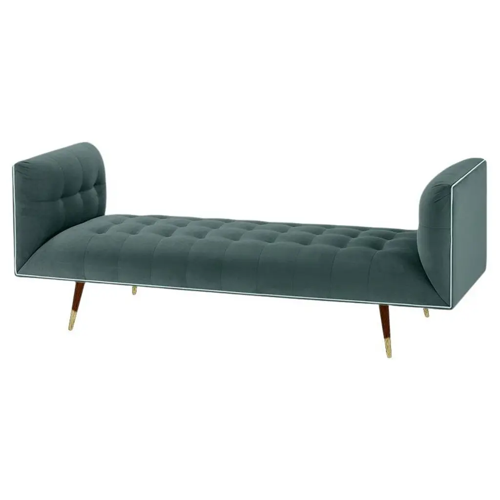 The Dust bench is constructed in solid wood, with an elevated tufted elegant look and a comfortable seating. Handmade with a solid wood base and wood legs. Polished brass metal feet detail is available as an option.The Dust Bench is available in a number of different materials, finishes and combinations.Wood finish and upholstery can be fully customizedCOM Available : Upholstery 5 yards, piping 0.7 yardsMaterialUpholstery : Velvet Fabric, Boucle Fabric, COMWood legs : Solid Wood baseMetal foot detail (on demand)DimensionsAvailable in 2 sizesSmall: 71” W x 28”D x 28” H Seat height 16”Large: 79” W x 28”D x 28” H Seat height 16”Pictured inParis Mousse, Smooth Shell Pipping, Gold Lacquered Wood Feet.
