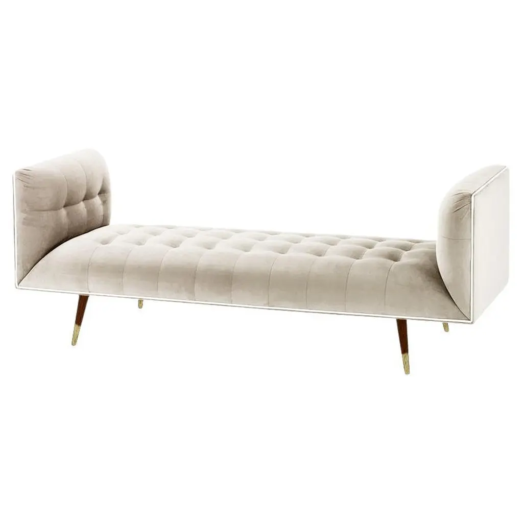The Dust bench is constructed in solid wood, with an elevated tufted elegant look and a comfortable seating. Handmade with a solid wood base and wood legs. Polished brass metal feet detail is available as an option.The Dust Bench is available in a number of different materials, finishes and combinations.Wood finish and upholstery can be fully customizedCOM Available : Upholstery 5 yards, piping 0.7 yardsMaterialUpholstery : Velvet Fabric, Boucle Fabric, COMWood legs : Solid Wood baseMetal foot detail (on demand)DimensionsAvailable in 2 sizesSmall: 71” W x 28”D x 28” H Seat height 16”Large: 79” W x 28”D x 28” H Seat height 16”Pictured inParis Mousse, Smooth Shell Pipping, Gold Lacquered Wood Feet.
