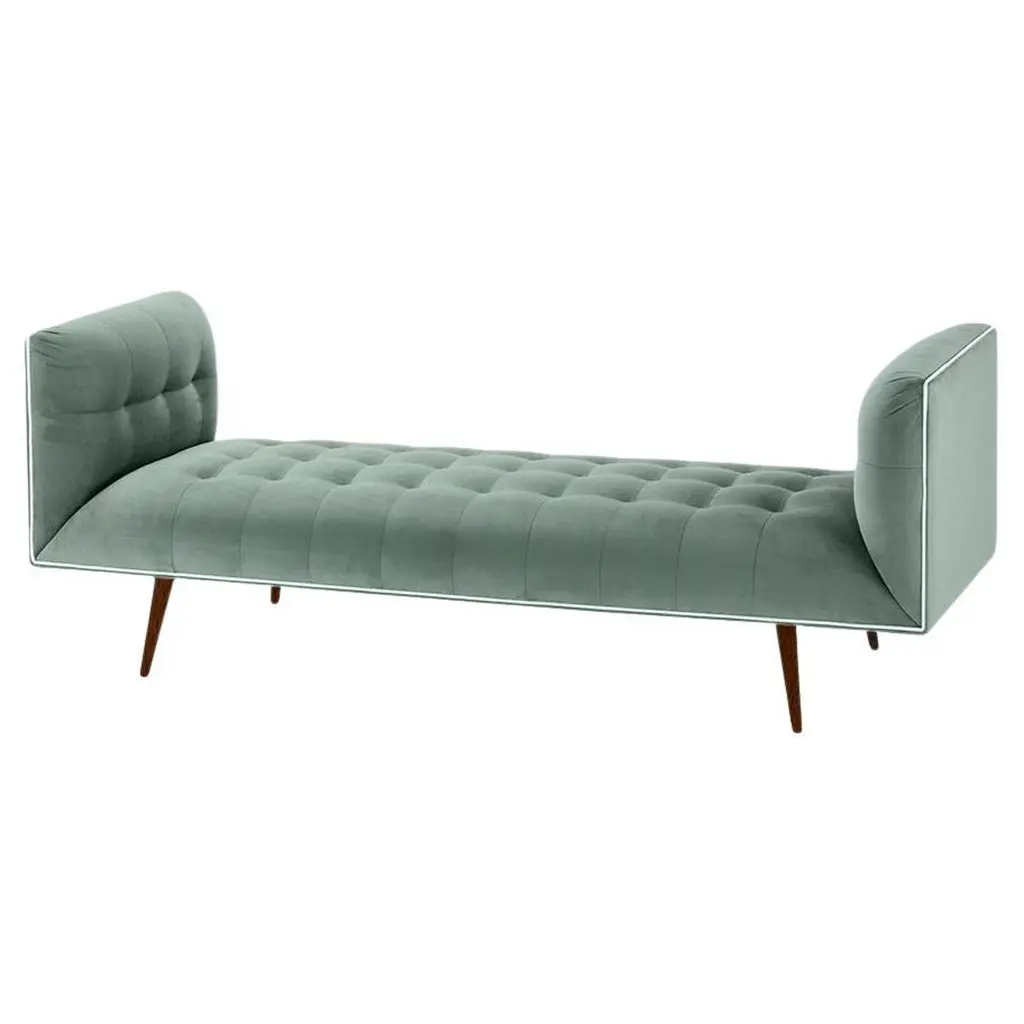 The Dust bench is constructed in solid wood, with an elevated tufted elegant look and a comfortable seating. Handmade with a solid wood base and wood legs. Polished brass metal feet detail is available as an option.The Dust bench is available in a number of different materials, finishes and combinations.Wood finish and upholstery can be fully customizedCOM Available : Upholstery 5 yards, piping 0.7 yardsMaterialUpholstery : Velvet Fabric, Boucle Fabric, COMWood legs : Solid Wood baseMetal foot detail (on demand)DimensionsAvailable in 2 sizesSmall: 71” W x 28”D x 28” H Seat height 16”Large: 79” W x 28”D x 28” H Seat height 16”Pictured inParis Mousse, smooth shell pipping, gold lacquered wood feet.