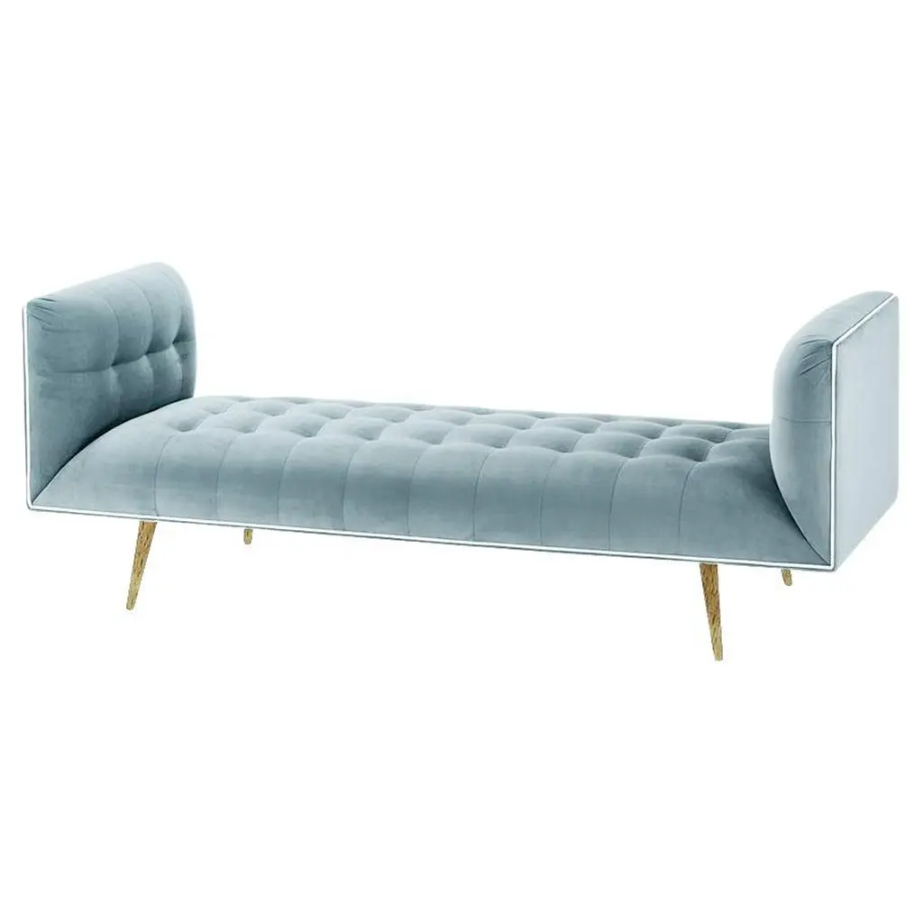 The Dust bench is constructed in solid wood, with an elevated tufted elegant look and a comfortable seating. Handmade with a solid wood base and wood legs. Polished brass metal feet detail is available as an option.The Dust Bench is available in a number of different materials, finishes and combinations.Wood finish and upholstery can be fully customizedCOM Available : Upholstery 5 yards, piping 0.7 yardsMaterialUpholstery : Velvet Fabric, Boucle Fabric, COMWood legs : Solid Wood baseMetal foot detail (on demand)DimensionsAvailable in 2 sizesSmall: 71” W x 28”D x 28” H Seat height 16”Large: 79” W x 28”D x 28” H Seat height 16”Pictured inParis Mousse, Smooth Shell Pipping, Gold Lacquered Wood Feet.