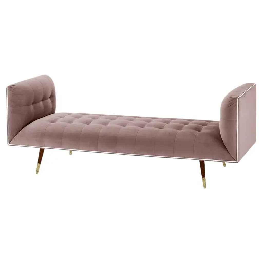 The Dust bench is constructed in solid wood, with an elevated tufted elegant look and a comfortable seating. Handmade with a solid wood base and wood legs. Polished brass metal feet detail is available as an option.The Dust Bench is available in a number of different materials, finishes and combinations.Wood finish and upholstery can be fully customizedCOM available: upholstery 5 yards, piping 0.7 yardsMaterialUpholstery: velvet Fabric, Boucle Fabric, COMWood legs: solid wood baseMetal foot detail (on demand)DimensionsAvailable in 2 sizesSmall: 71” W x 28”D x 28” H Seat height 16”Large: 79” W x 28”D x 28” H Seat height 16”Pictured inParis Mousse, smooth shell pipping, gold lacquered wood feet.
