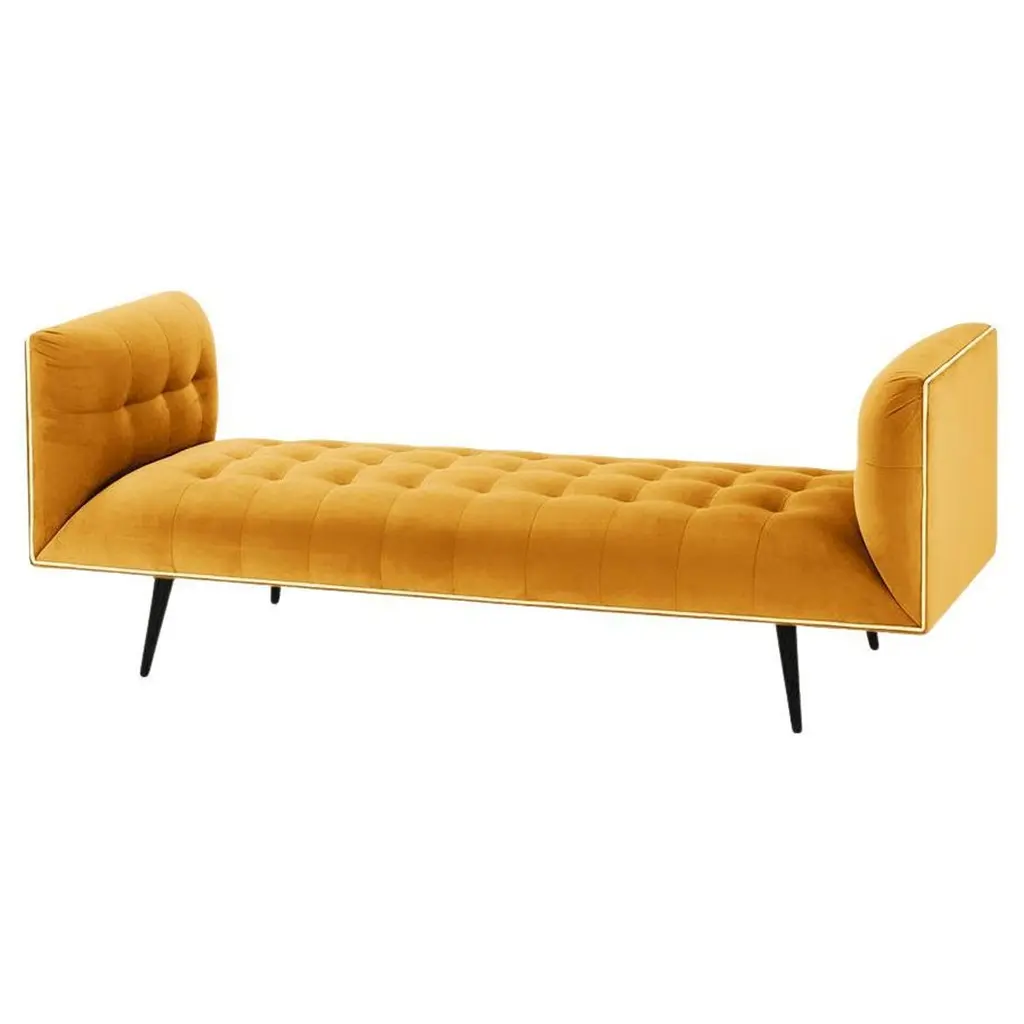 The Dust bench is constructed in solid wood, with an elevated tufted elegant look and a comfortable seating. Handmade with a solid wood base and wood legs. Polished brass metal feet detail is available as an option.The Dust Bench is available in a number of different materials, finishes and combinations.Wood finish and upholstery can be fully customizedCOM Available : Upholstery 5 yards, piping 0.7 yardsMaterialUpholstery : Velvet Fabric, Boucle Fabric, COMWood legs : Solid Wood baseMetal foot detail (on demand)DimensionsAvailable in 2 sizesSmall: 71” W x 28”D x 28” H Seat height 16”Large: 79” W x 28”D x 28” H Seat height 16”Pictured inParis Mousse, smooth shell pipping, gold lacquered wood feet.